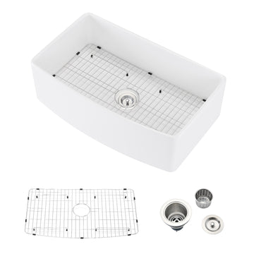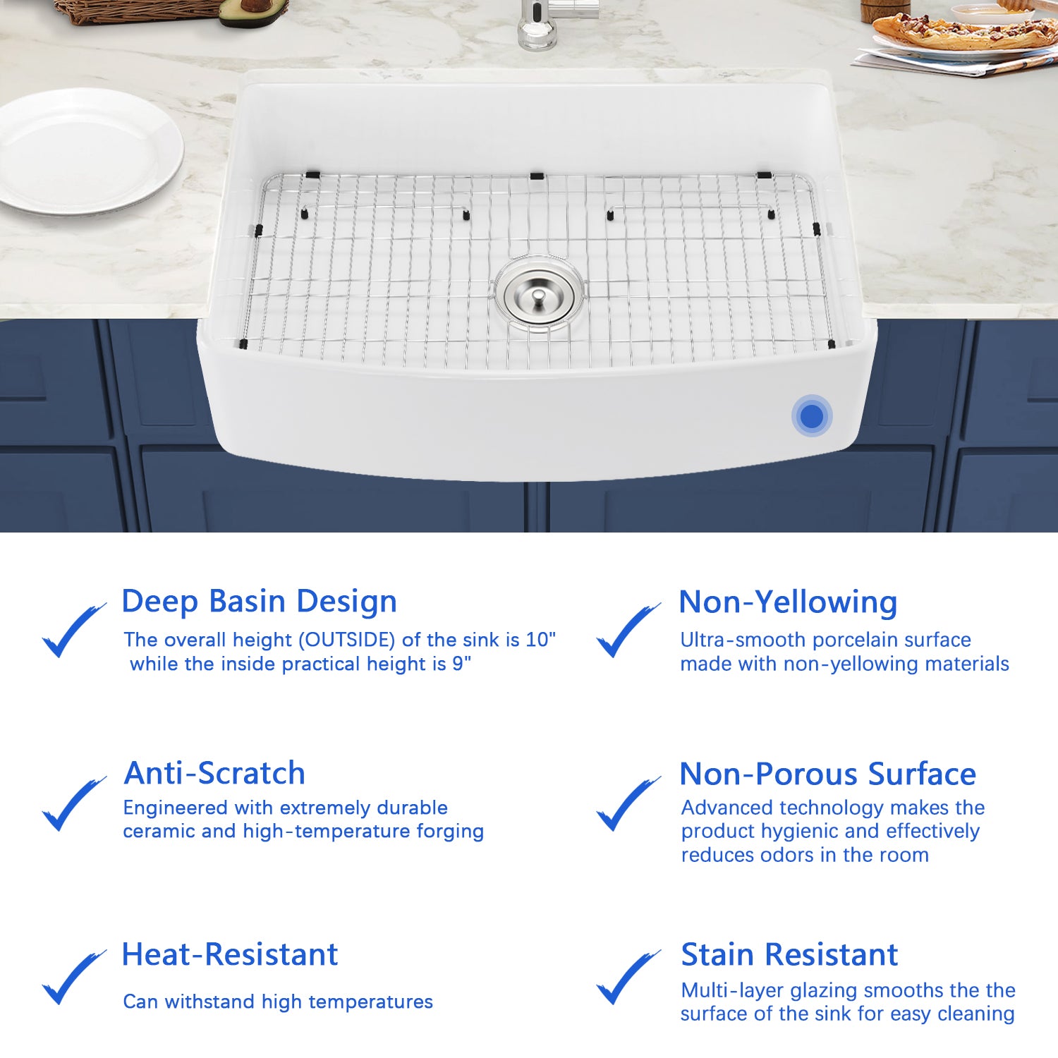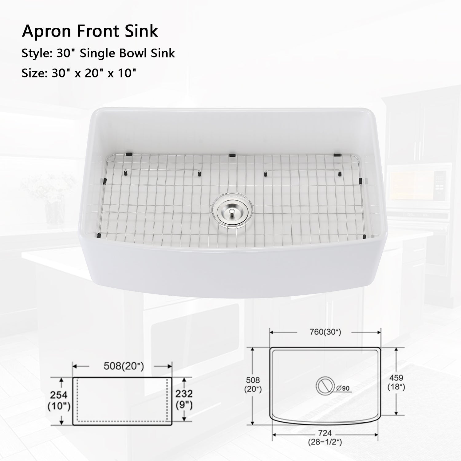 Fireclay 30" L X 20" W Farmhouse Arch Edge Apron Front Single Bowl Kitchen Sink White Fireclay