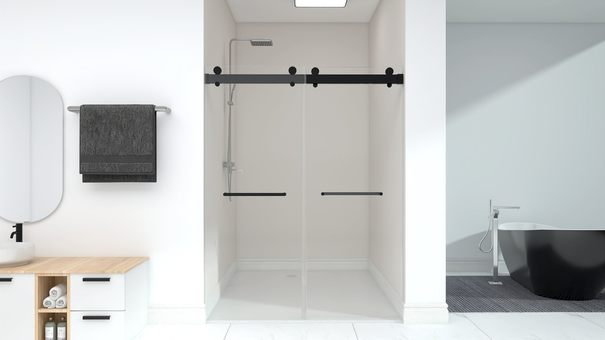 Frameless Double Sliding Shower, 57" 60" Width, 79" Height, 3 8" 10 Mm Clear Tempered Glass,Designed For Smooth Door Closing With Upgraded Crashproof System Technology Matte Black Finish Matte Black Bathroom Modern Glass