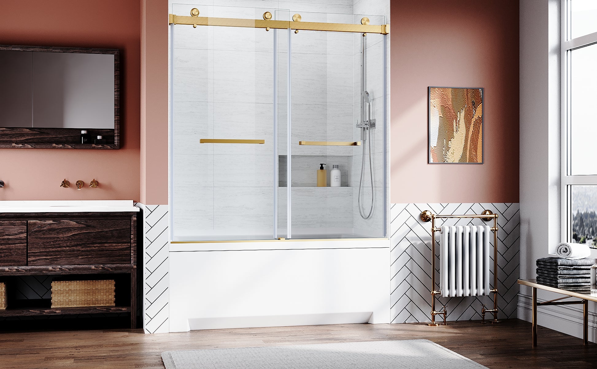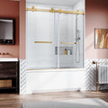 Frameless Sliding Bathtub Door 56 60 In.W X 62 In.H,Bypass Tub Glass Sliding Shower Doors,3 8" 10Mm Thick Clear Tempered Glass,Heavy Duty Stainless Steel Hardwares,2Pcs Rectangle Handles,Brushed Gold Brushed Gold Stainless Steel