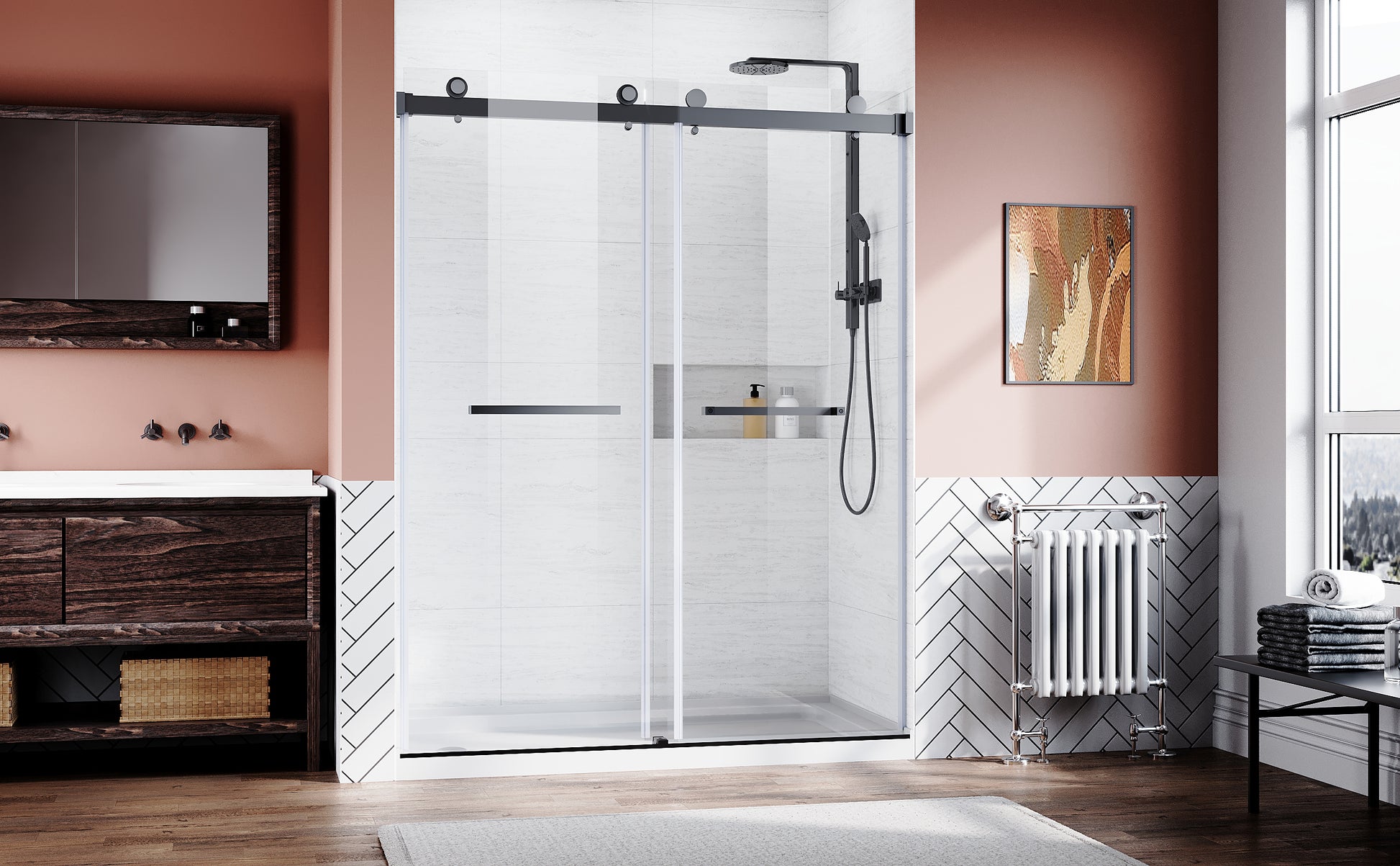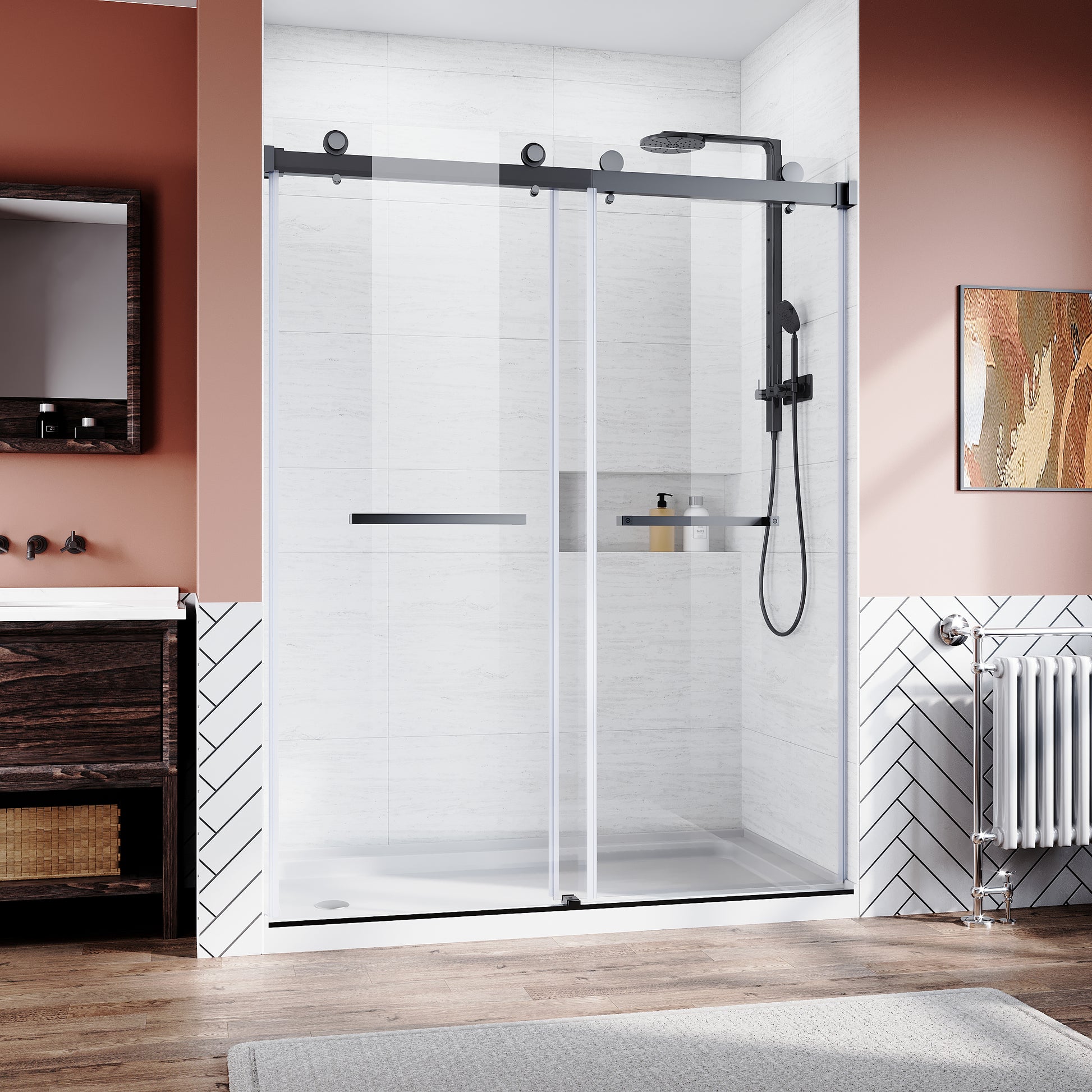 Frameless Sliding Shower Glass Door 56 60 In.W X 76 In. H,3 8" 10Mm Thick Clear Tempered Glass,Heavy Duty Stainless Steel Hardwares,Matte Black,Bypass Shower Enclosure Matt Black Stainless Steel