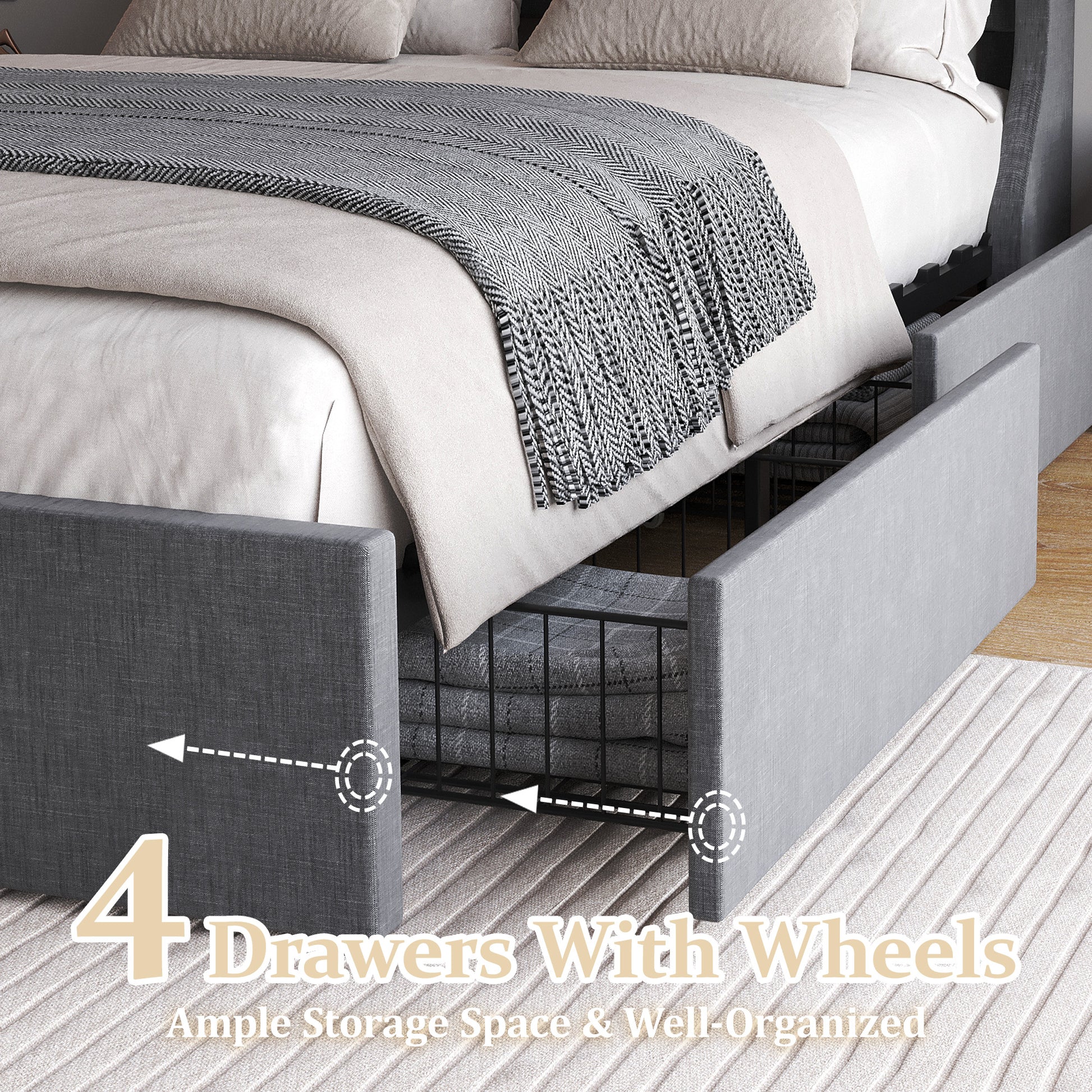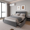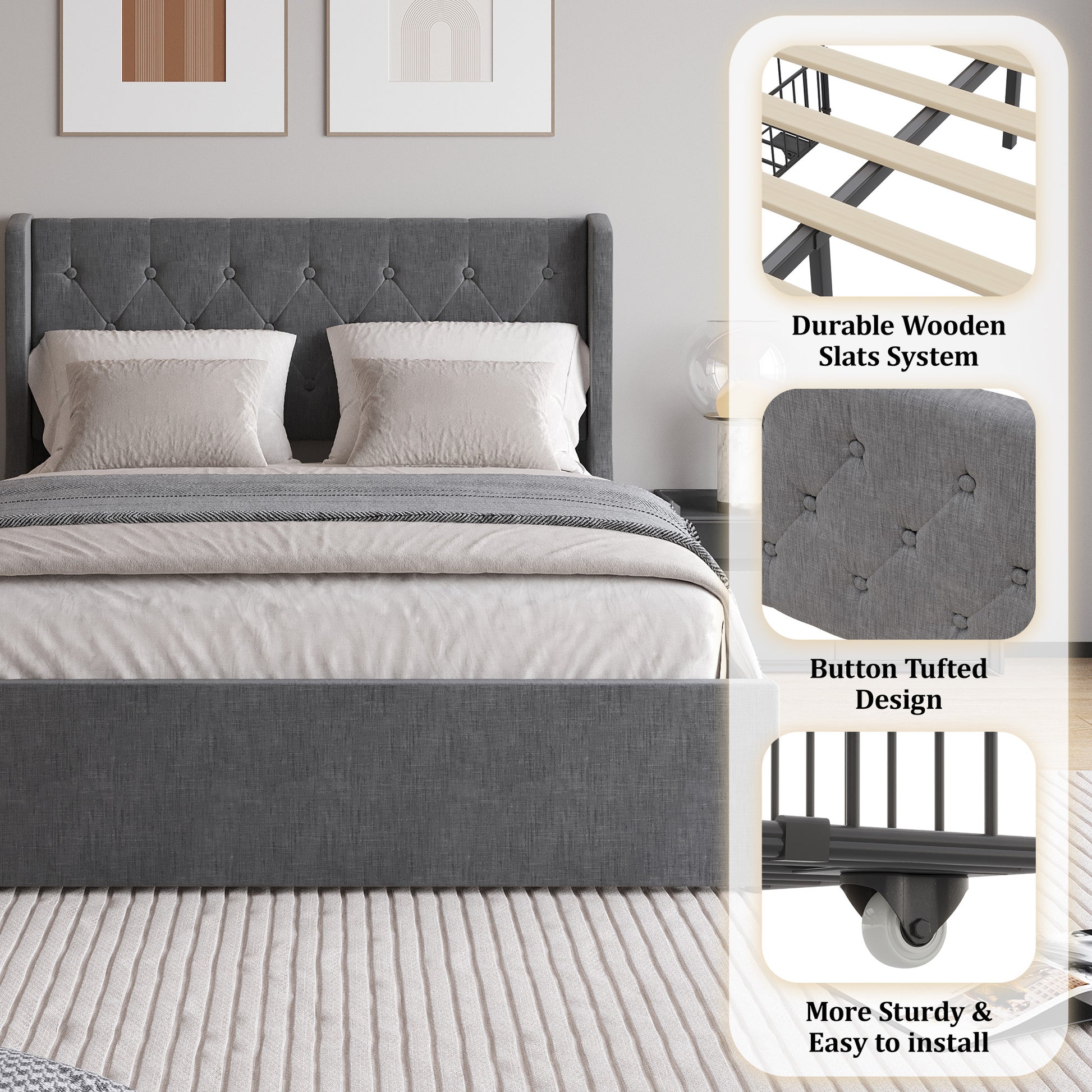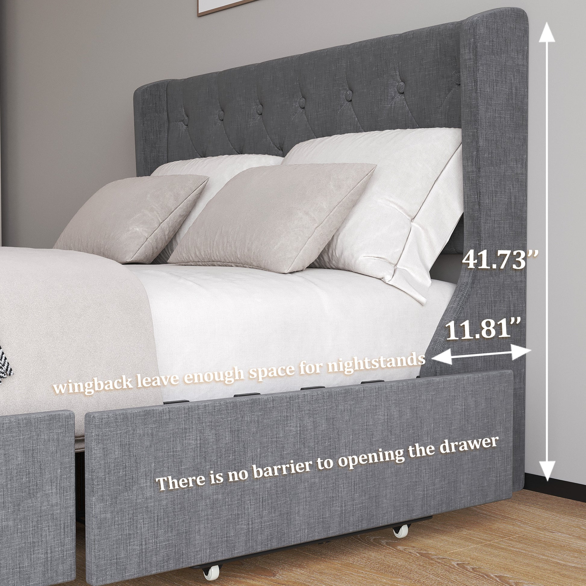 Full Size Bed Frame With 4 Storage Drawers And Wingback Headboard, Button Tufted Design, Dark Grey Full Dark Gray Linen