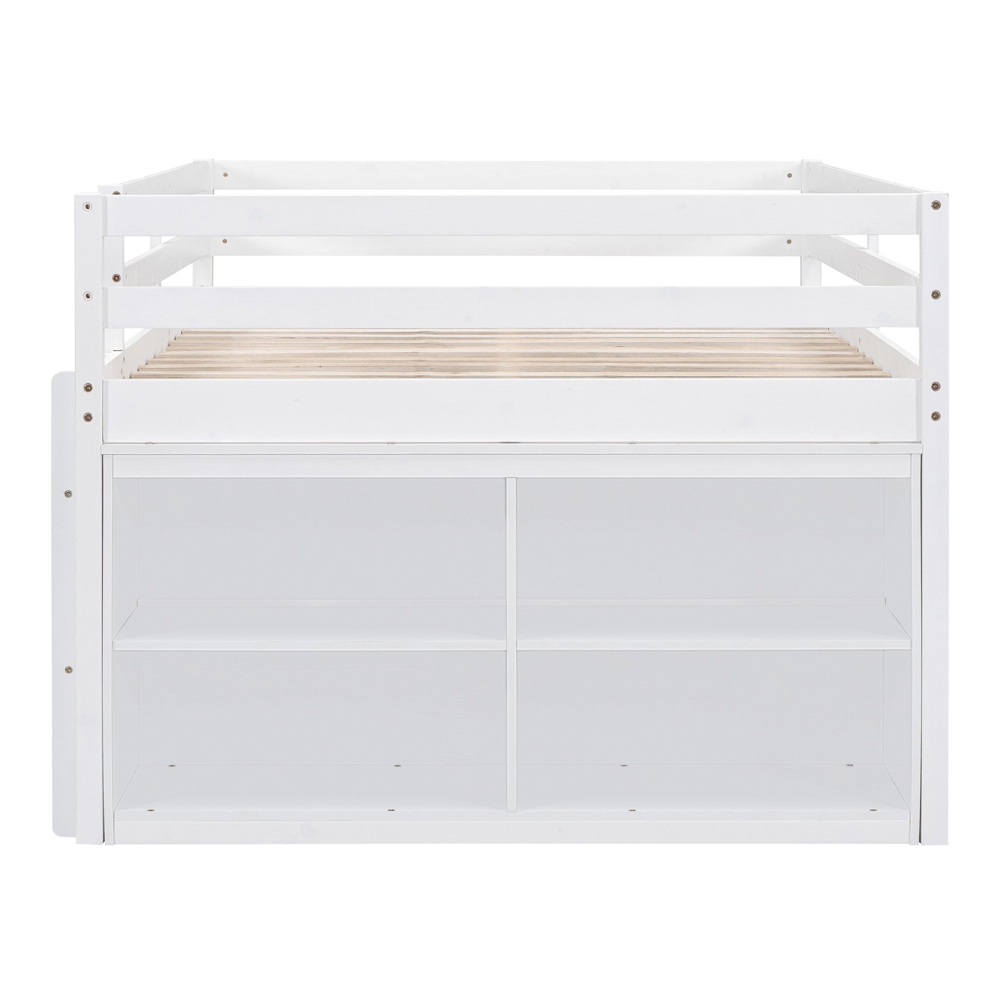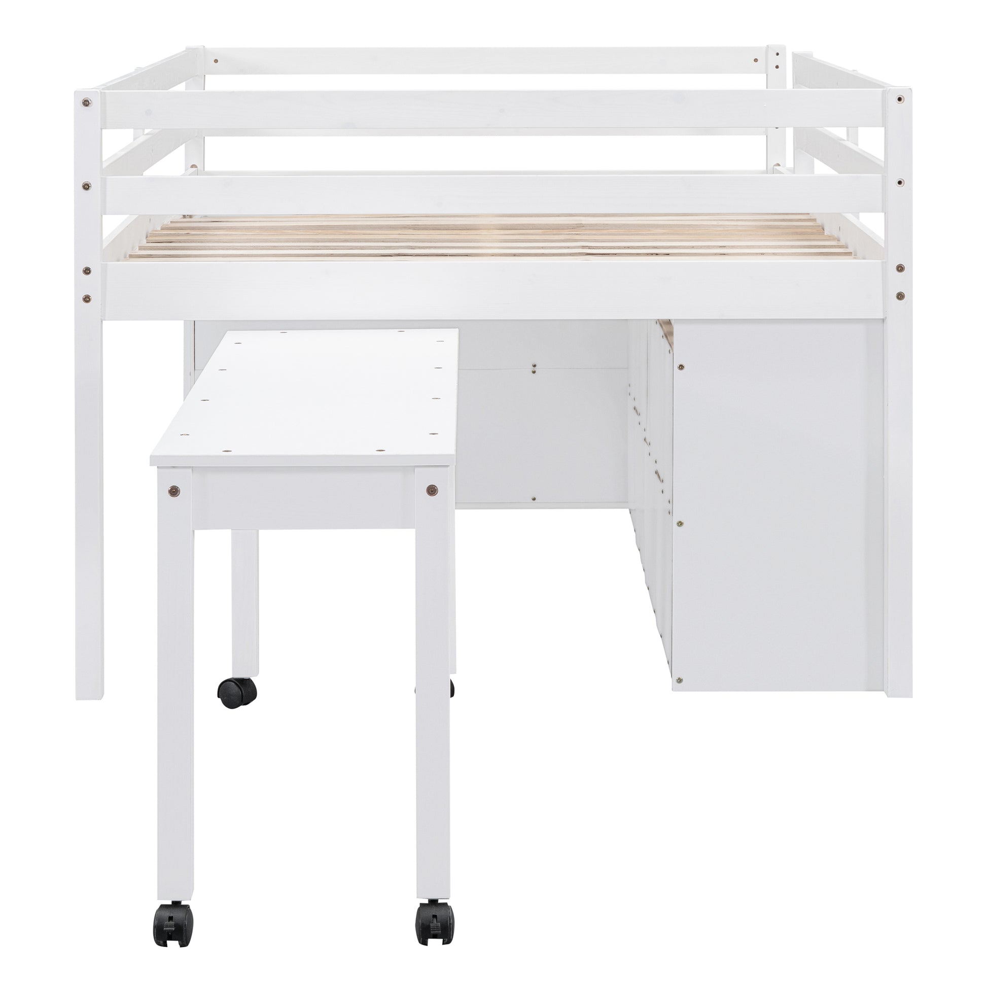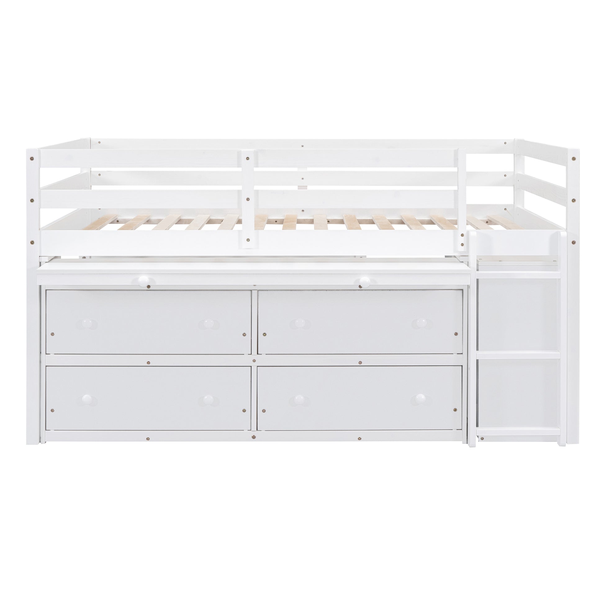Full Size Loft Bed With Retractable Writing Desk And 4 Drawers, Wooden Loft Bed With Lateral Portable Desk And Shelves, White Full White Solid Wood Mdf
