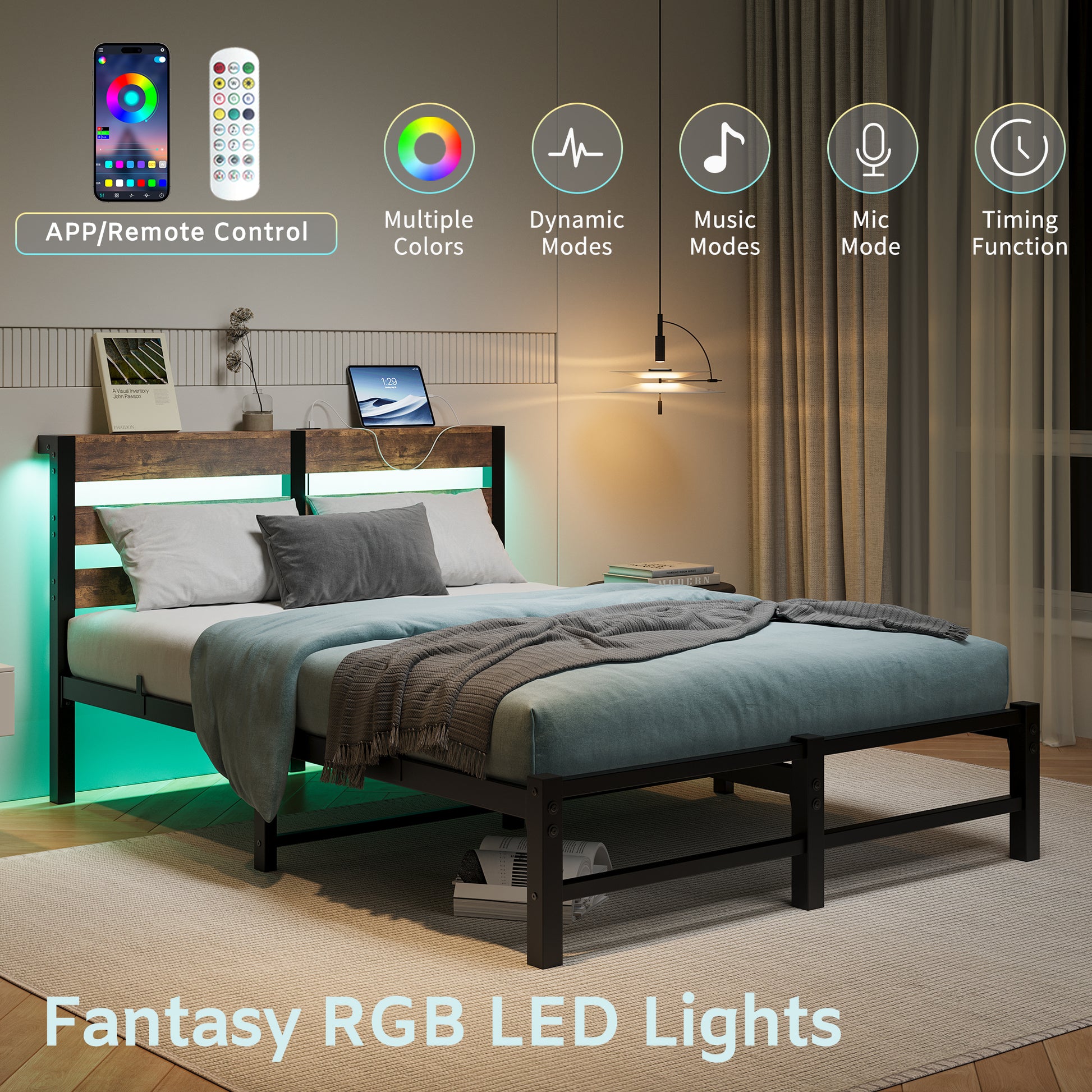 Full Size Metal Bed Frame With Wooden Headboard, Rgb Lights, Charger, Storage Shelf, Noise Free, No Box Spring Needed,Rustic Brown Box Spring Not Required Full Beige Brown Metal Brown Bedroom Bed Frame Metal & Wood