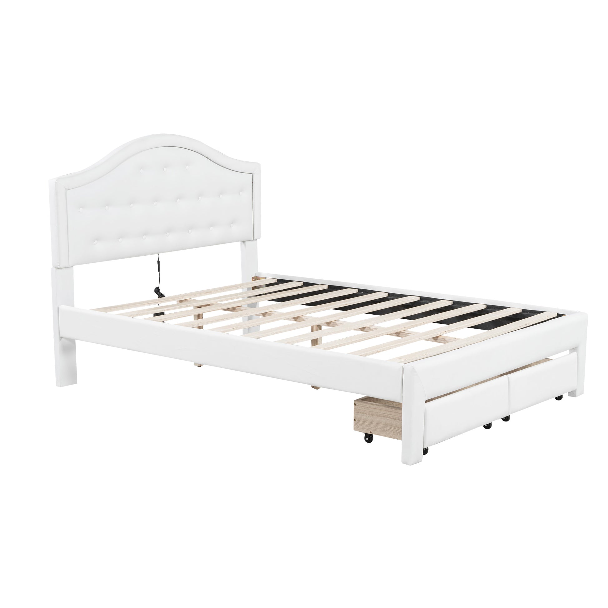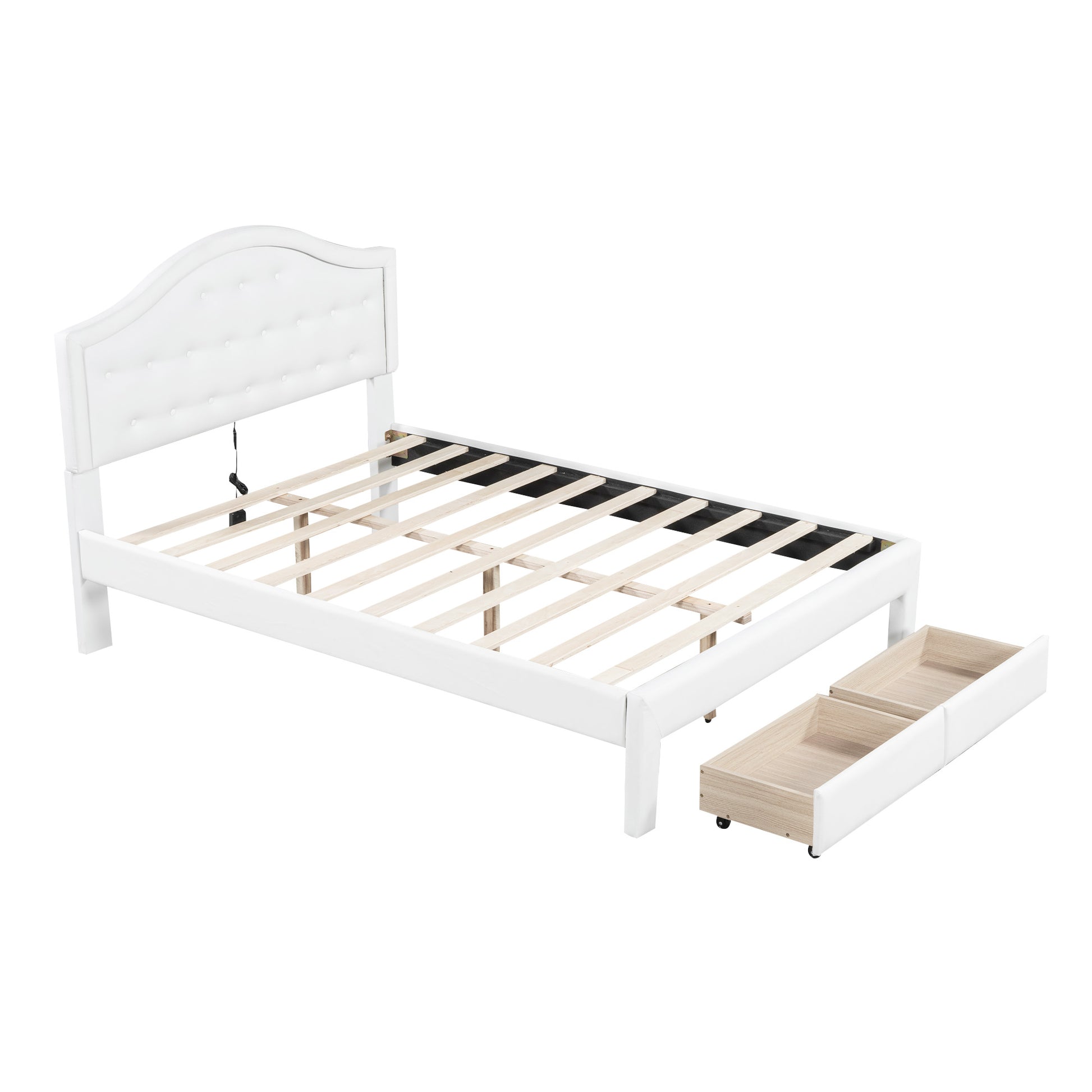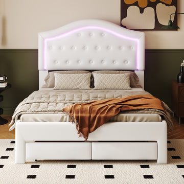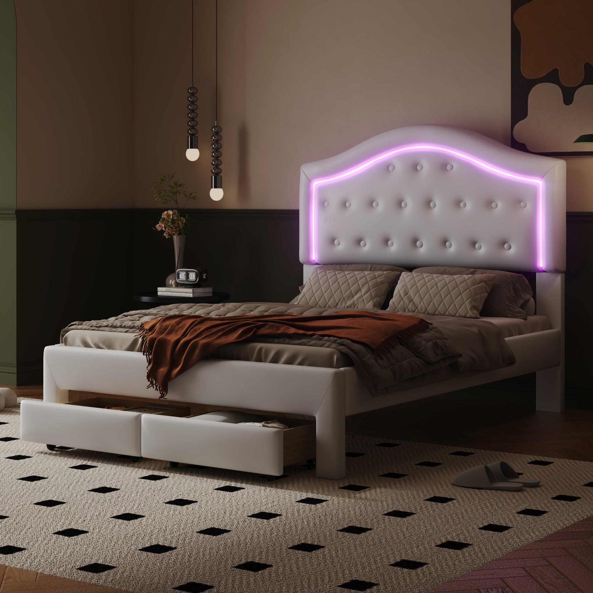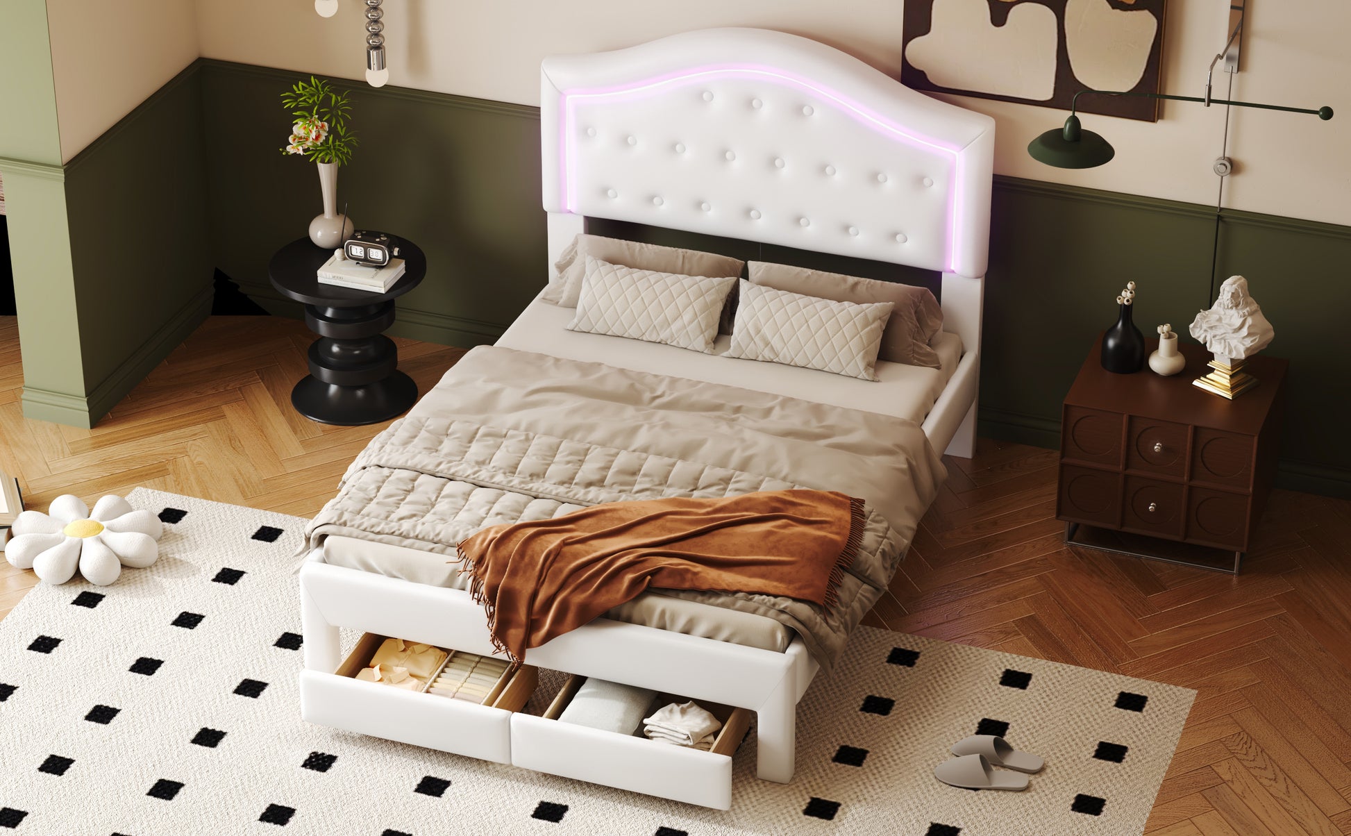 Full Size Upholstered Platform Bed With Tufted Headboard, Led And 2 Drawers, White Box Spring Not Required Full White Wood Bathroom Bed Frame Faux Leather Upholstered