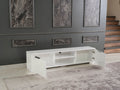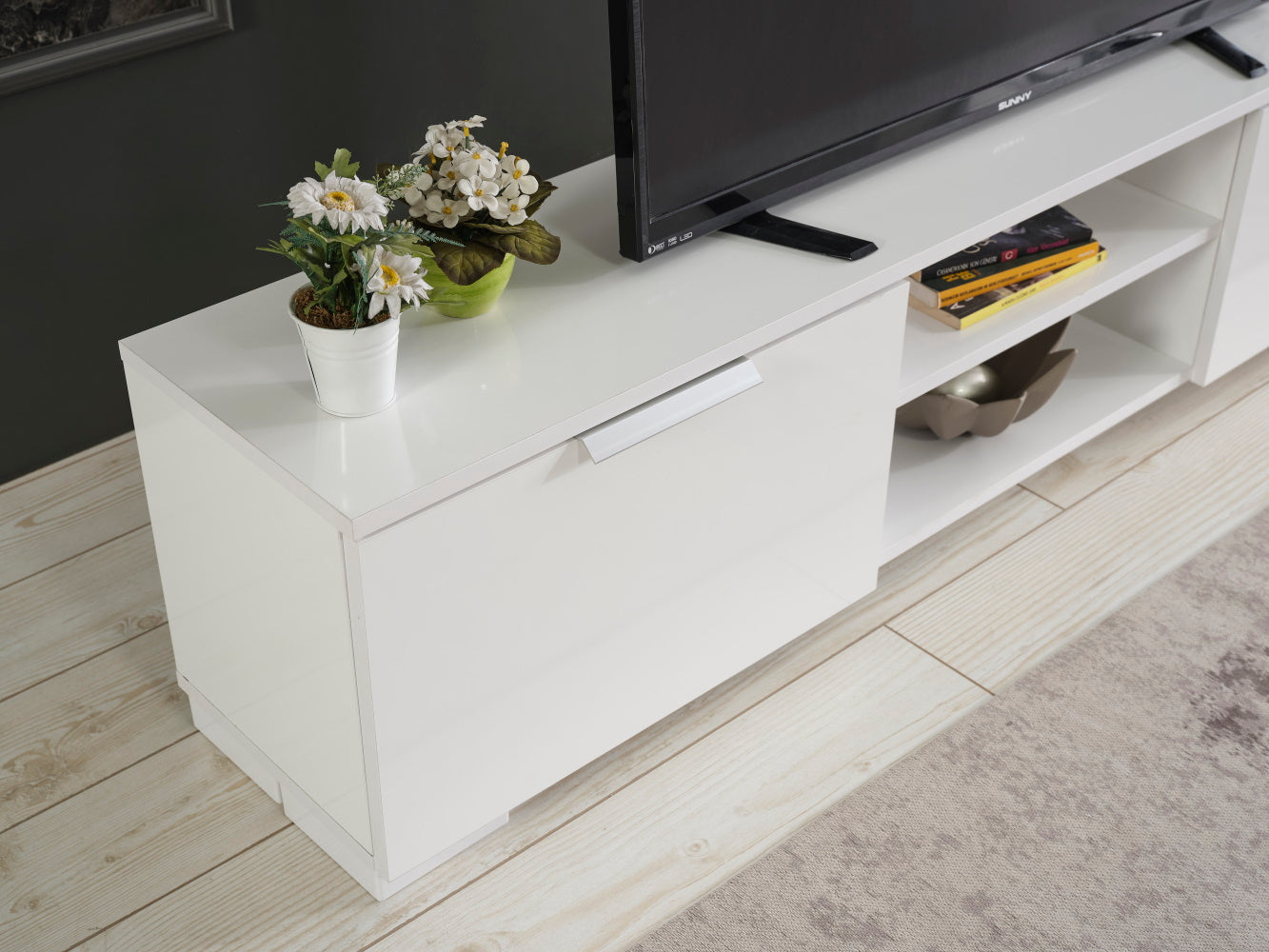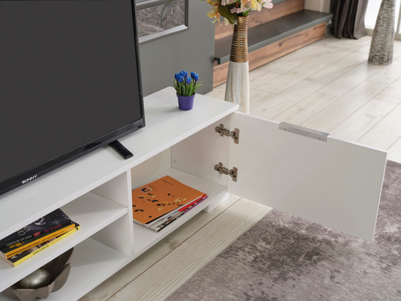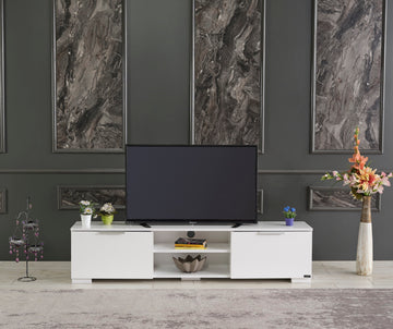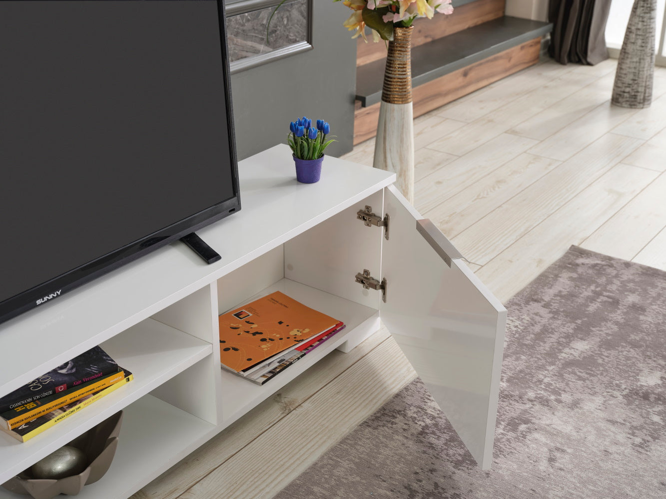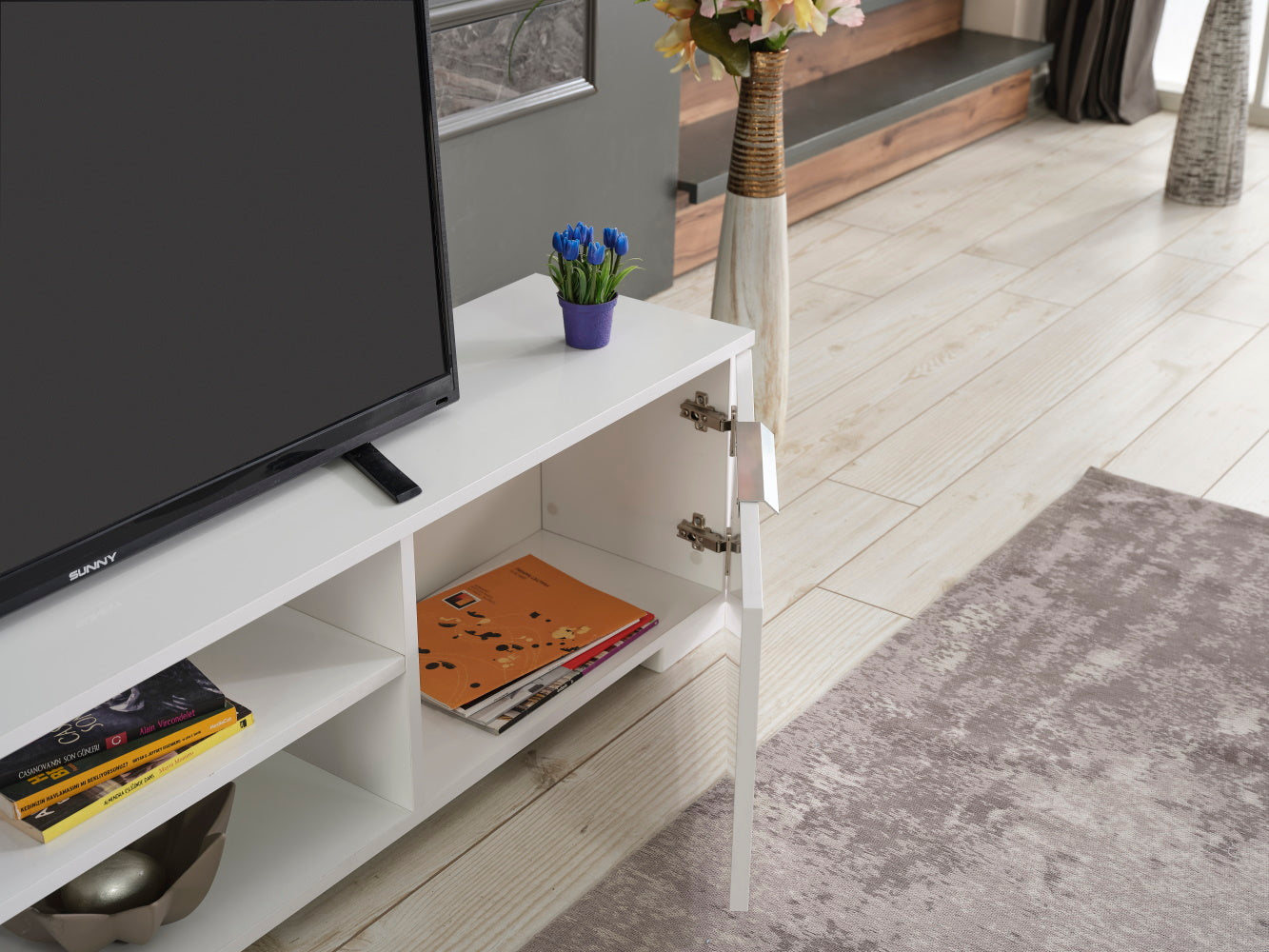 Furnishome Store April Mid Century Modern Tv Stand 2 Door Cabinets 2 Shelves White 66 Inch Tv Unit, White White Solid Wood