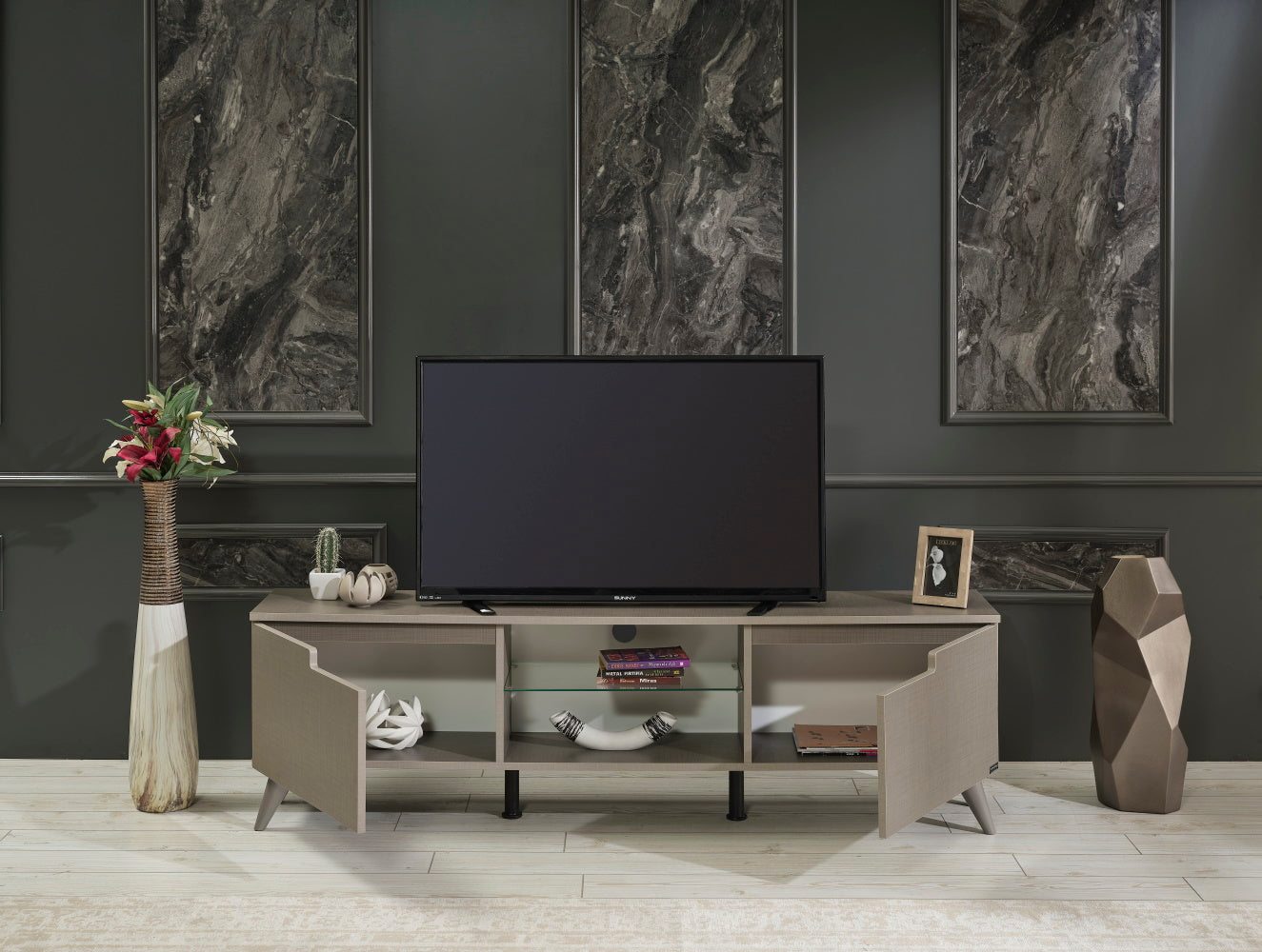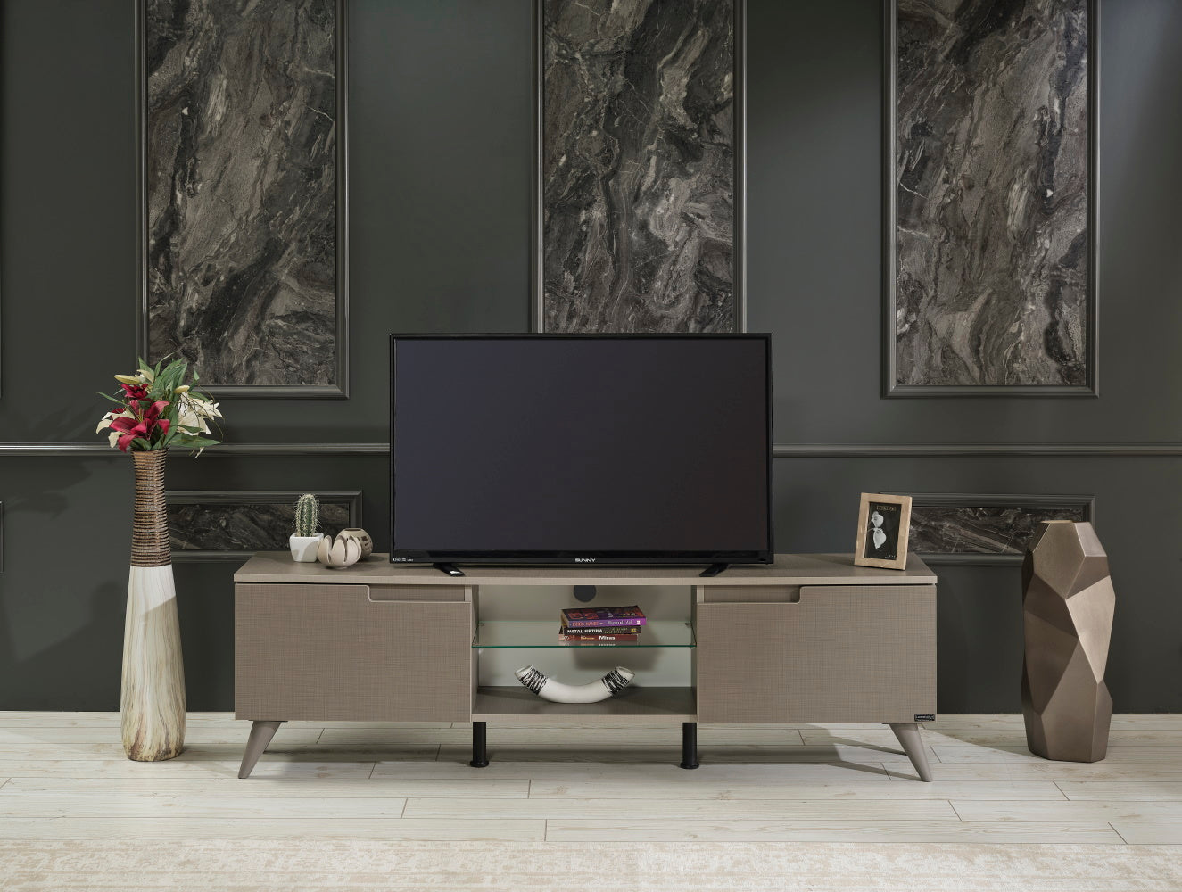 Furnishome Store Denver Mid Century Modern Tv Stand 2 Door Cabinets 1 Glass Shelf 66 Inch Tv Unit, Brown Brown Solid Wood