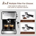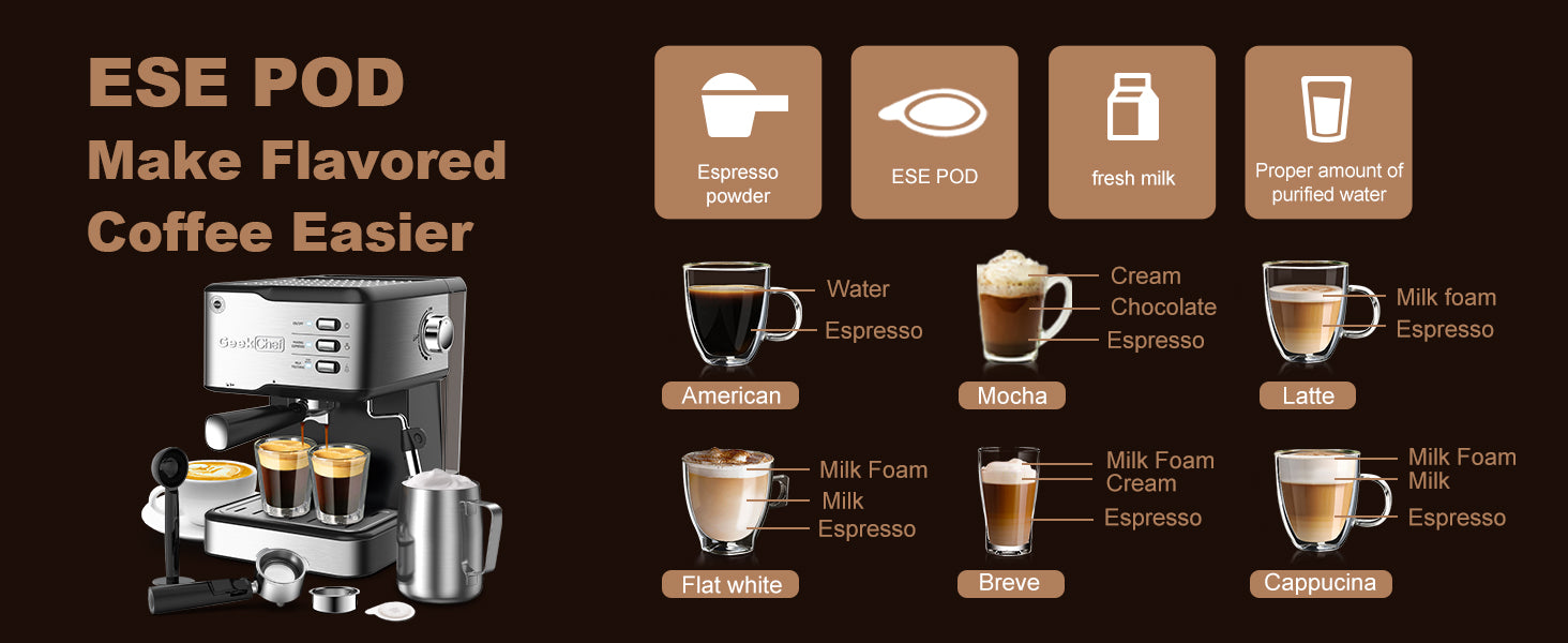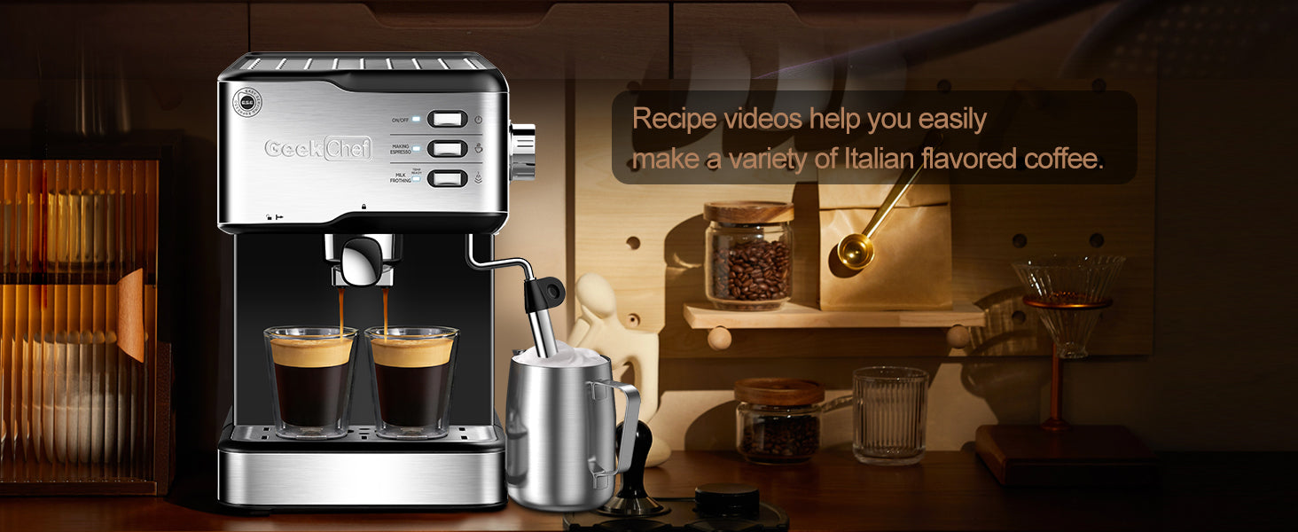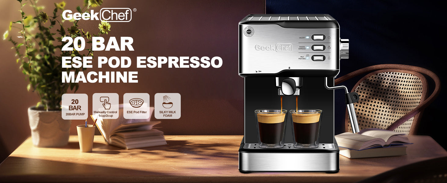 Geek Chef Espresso Machine, Espresso And Cappuccino Latte Maker 20 Bar Pump Coffee Machine Compatible With Ese Pod Capsules Filter&Milk Frother Steam Wand,950W,1.5L Water Tank Ban On Silver Steel