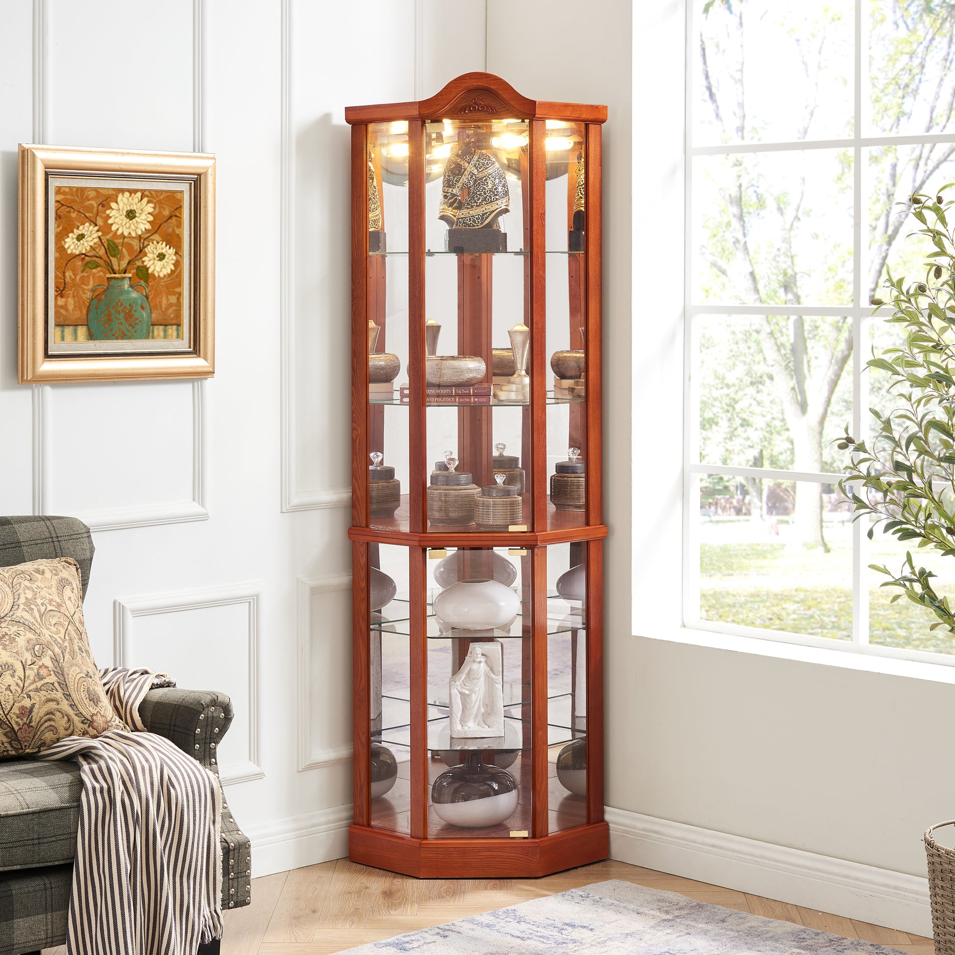 Glass Cabinet Lighted Corner Cabinet Corner Display Curio Cabinet, Glass Display With Light Included Bar Cabinet,Wine Cabinet With Adjustable Glass Shelves Carved Decoration Oak Light Included Oak Mdf Glass