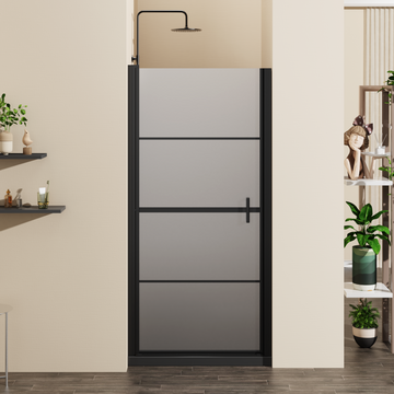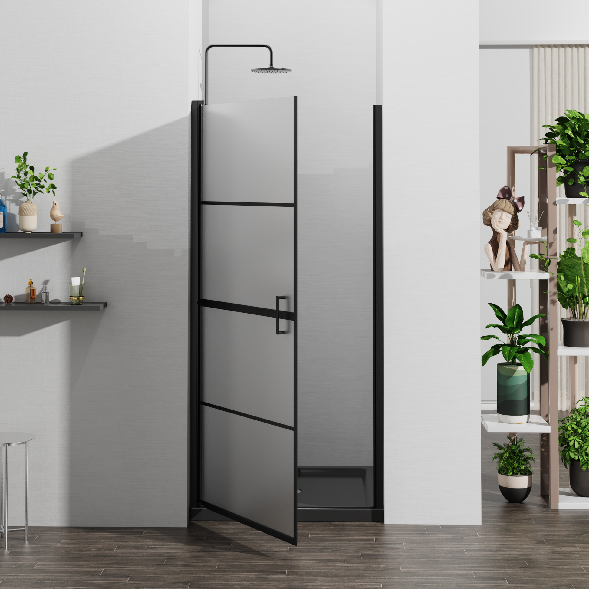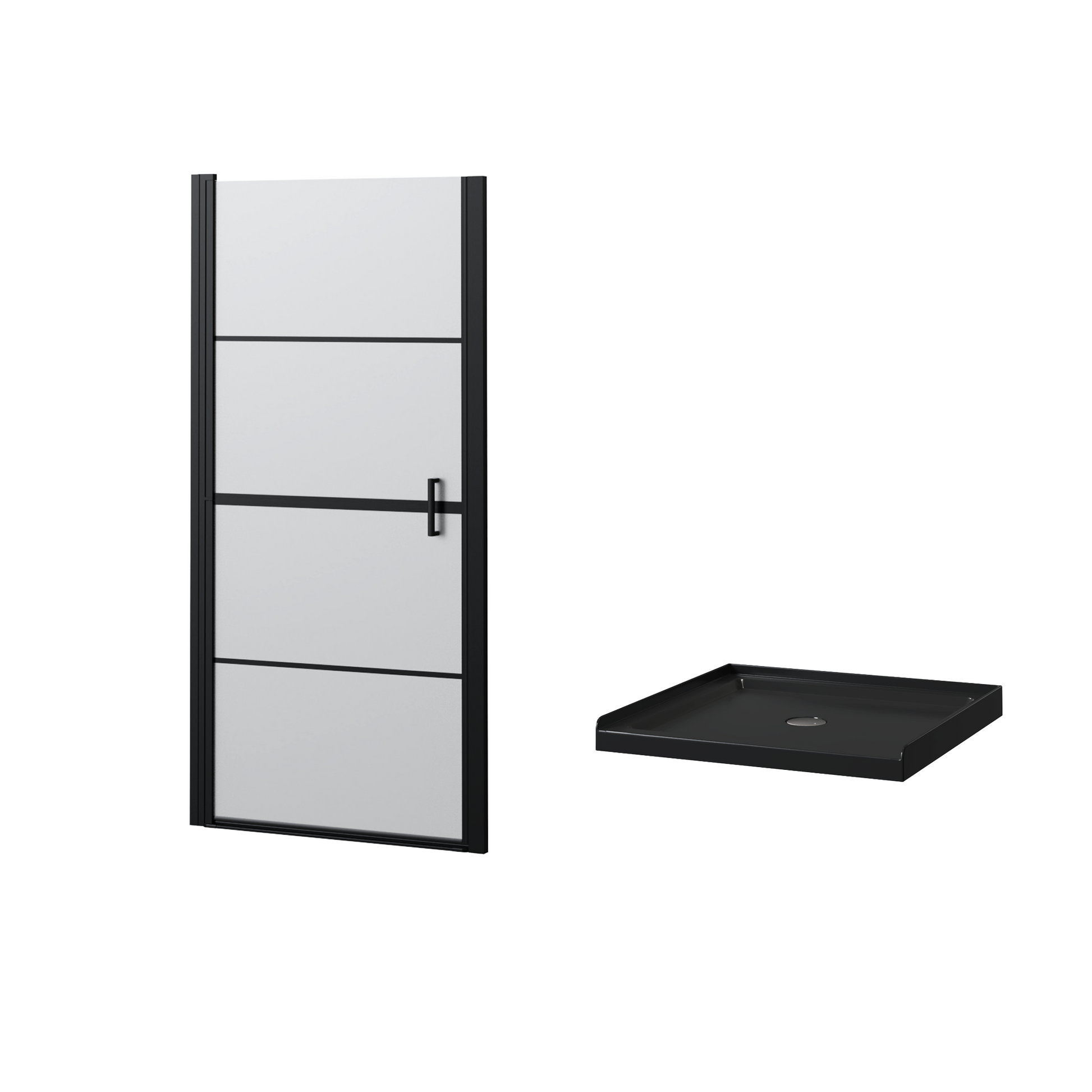 Goodyo 34"X72"Framed Pivot Swing Shower Door Frosted Tempered Glass Grid Pattern With 35.4" Black Shower Base Combo Black Glass Acrylic