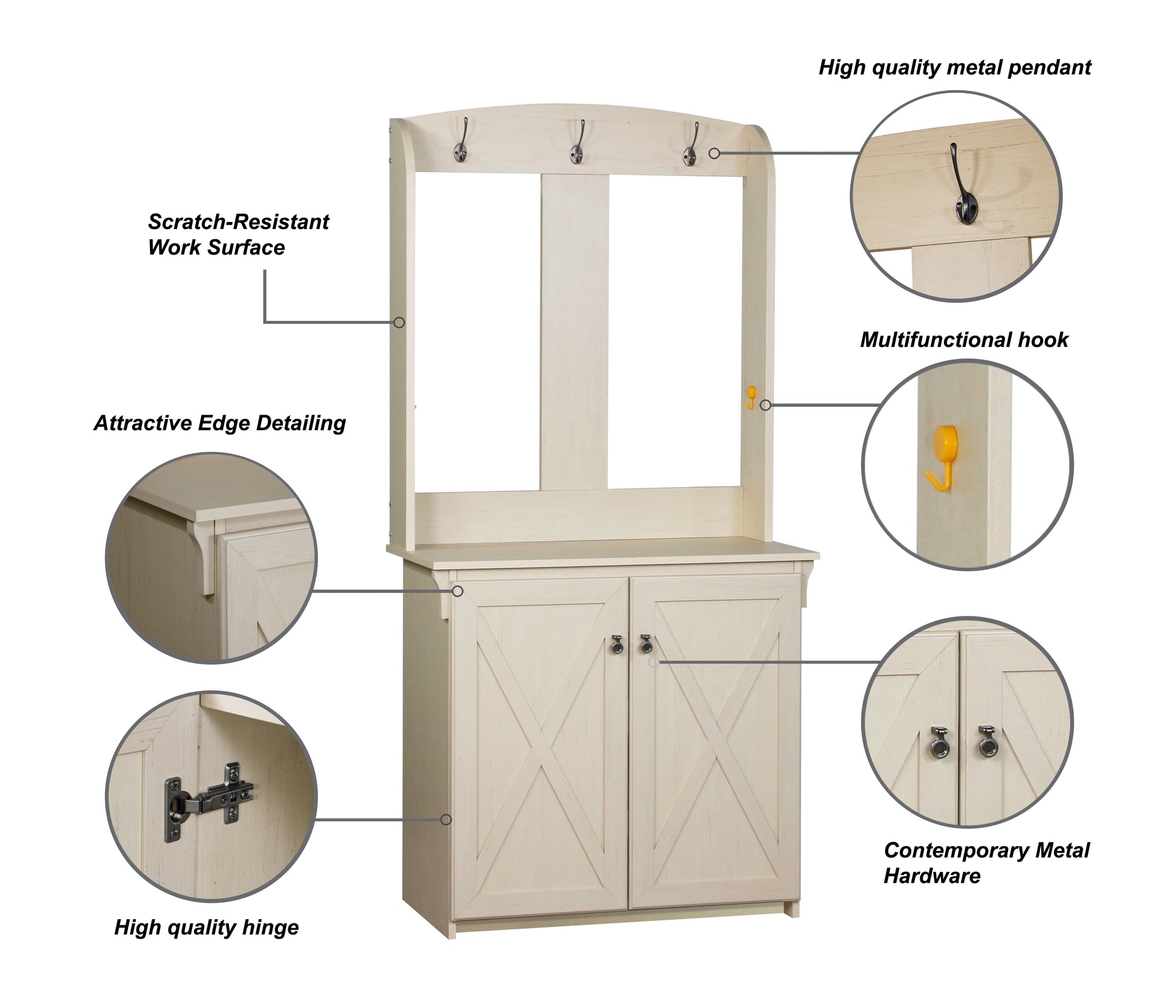 Hall Tree & Cabinet "Vintage Antique White Hall Tree With Spacious Storage Elegant Entryway Furniture With Robust Metal Hooks" White Solid Wood