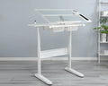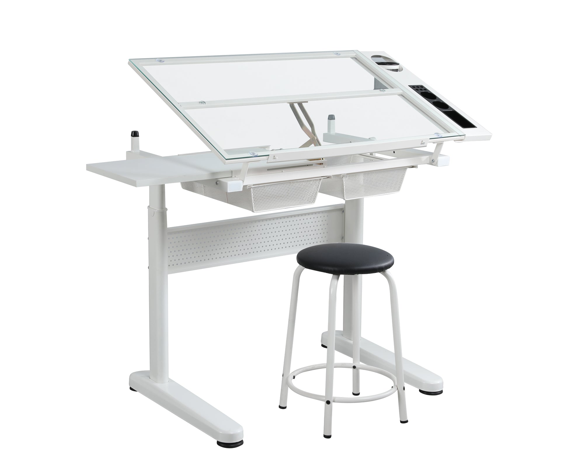 Hand Crank Adjustable Drafting Table Drawing Desk With 2 Metal Drawers White With Stool White Tempered Glass Sheet Metal Plastic