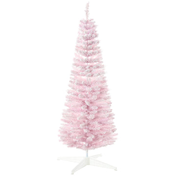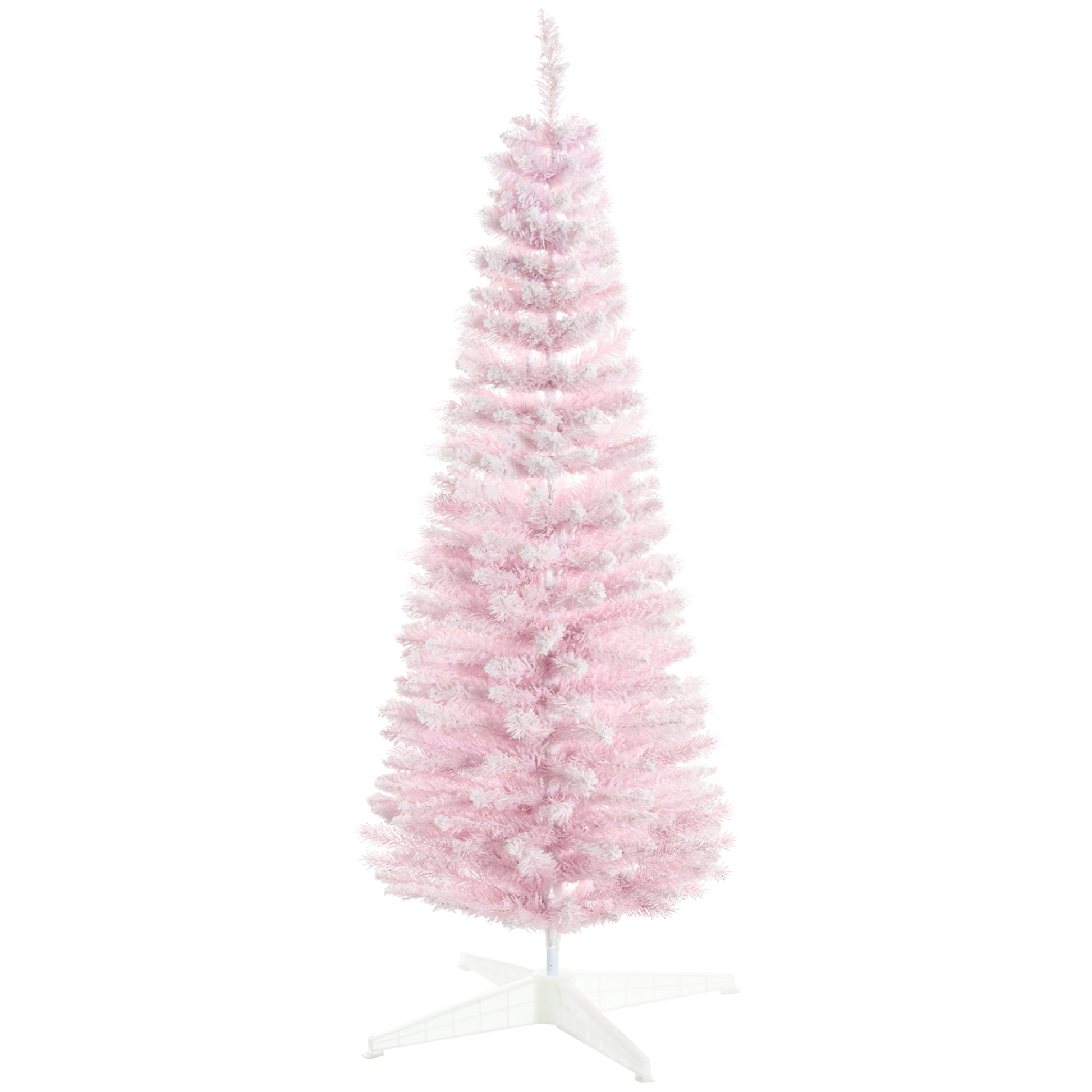 Homcom 5' Snow Flocked Artificial Pencil Christmas Tree, Slim Xmas Tree With Realistic Branches And Plastic Base Stand For Indoor Decoration, Pink Pink Plastic