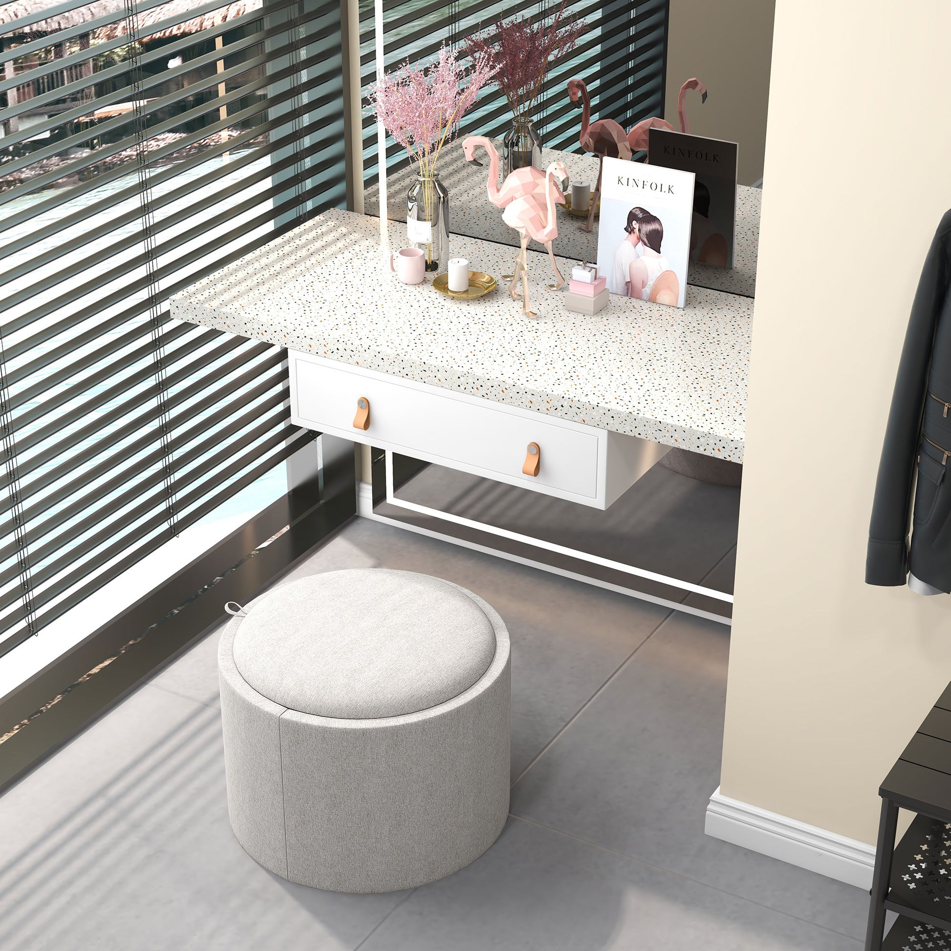 Homcom Round Storage Ottoman Coffee Table With Flip Top Tray, Gray Light Gray Polyester