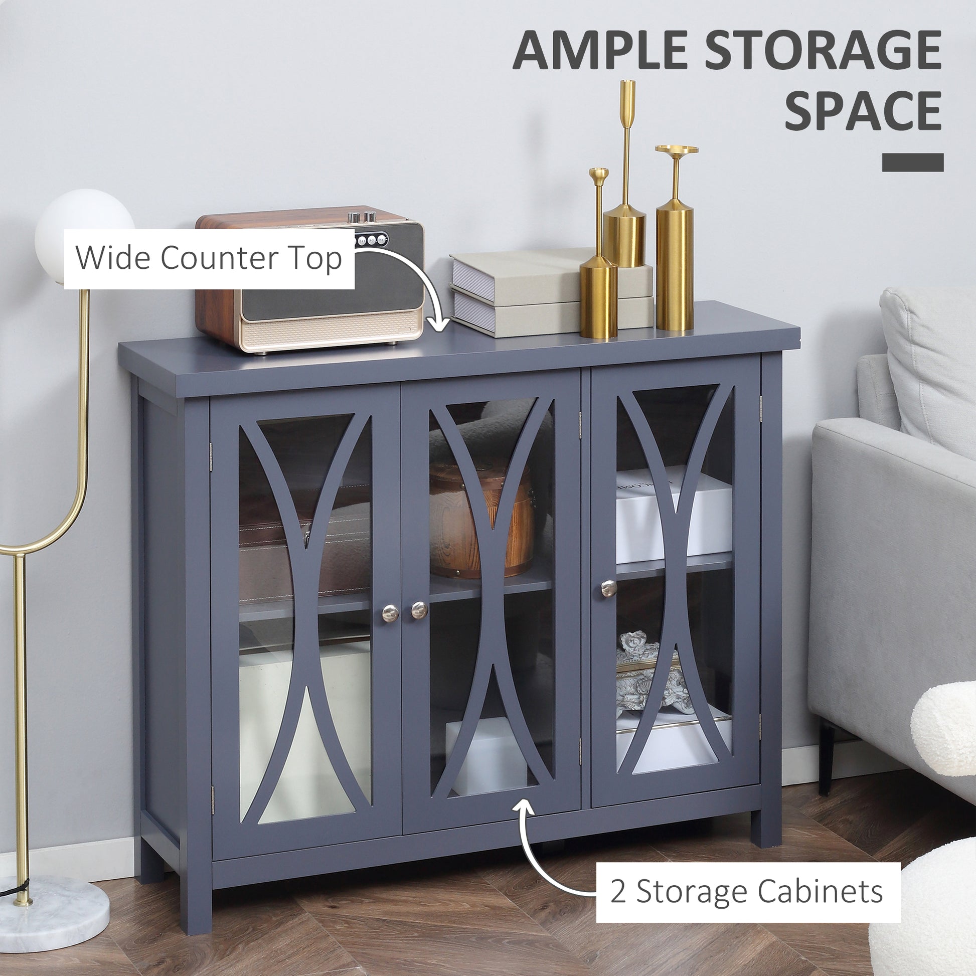 Homcom Sideboard, Buffet Cabinet With 3 Tempered Glass Doors, Arc Pattern And Adjustable Storage Shelf, Credenza, Gray Gray Mdf