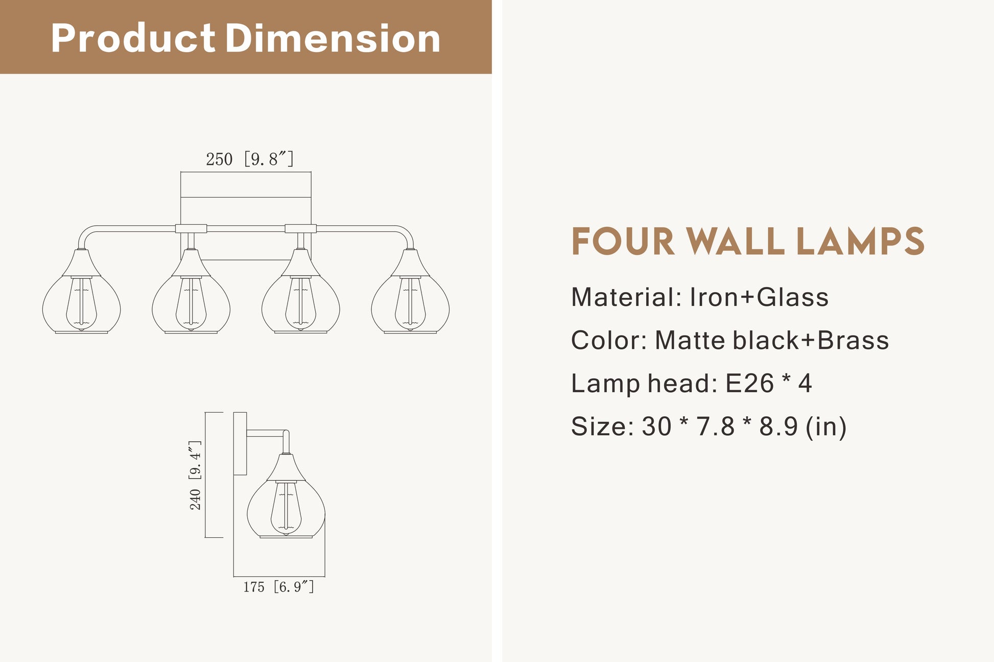 Home Decorative Bedroom Bathroom Vanity Light Matte Black Antique Brass Iron Glass 4 Light E26 Bulb Wall Mounted Light Antique Brass,Matte Black Modern Glass,Iron
