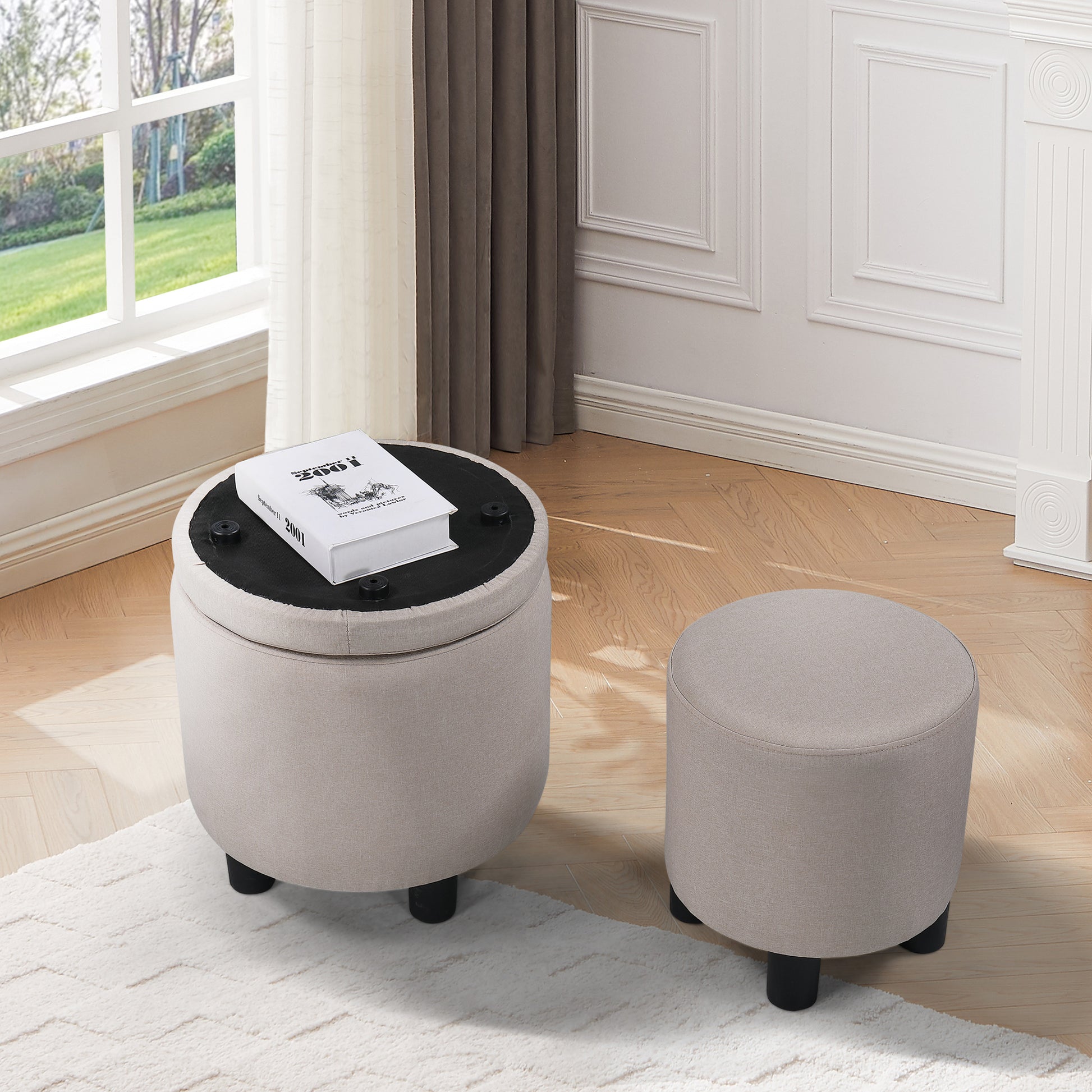 Jst Home Decor Upholstered Round Fabric Tufted Footrest 1 1 Ottoman, Ottoman With Storage For Living Room & Bedroom, Decorative Home Furniture, Beige Beige Carbon Fiber