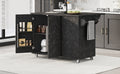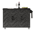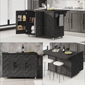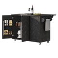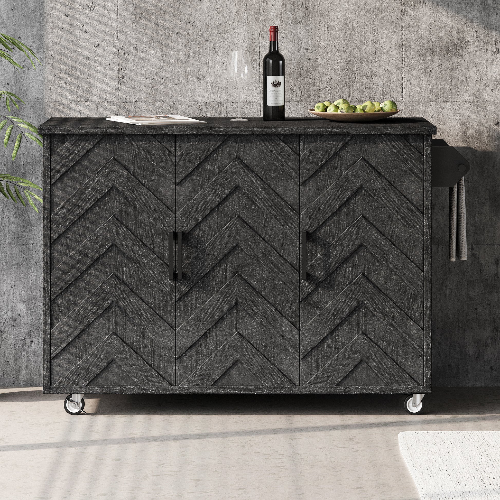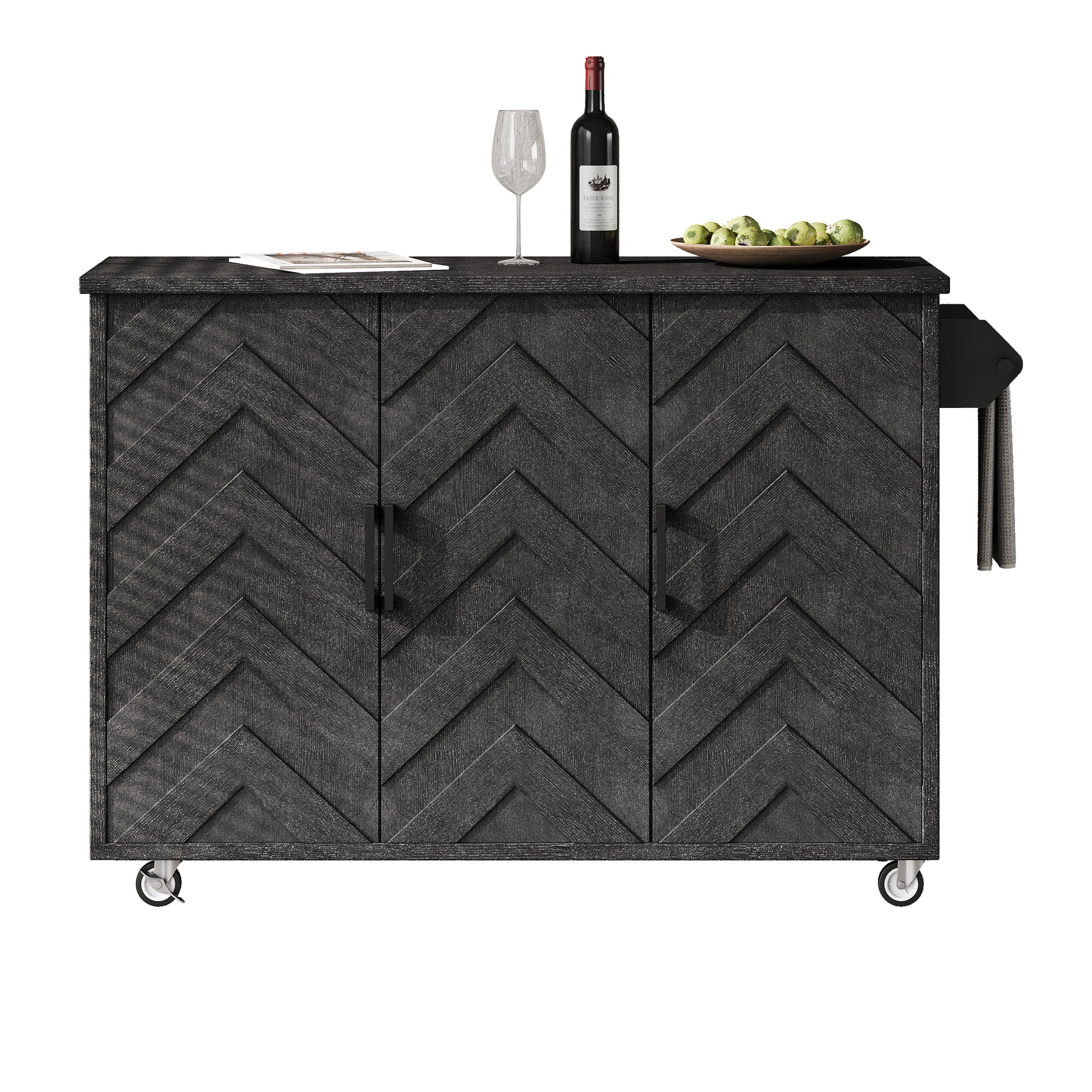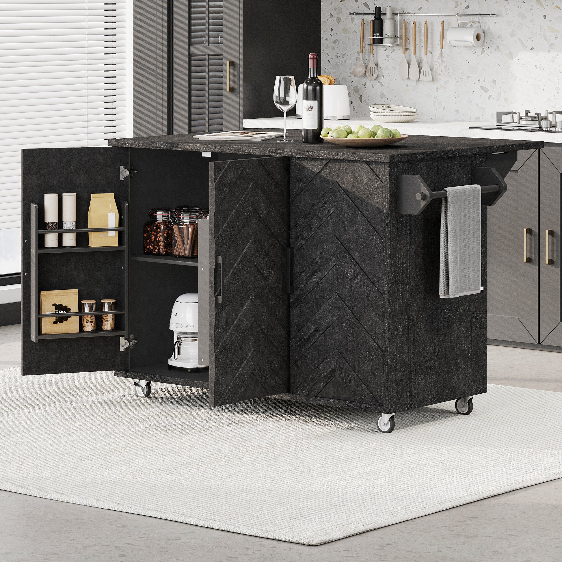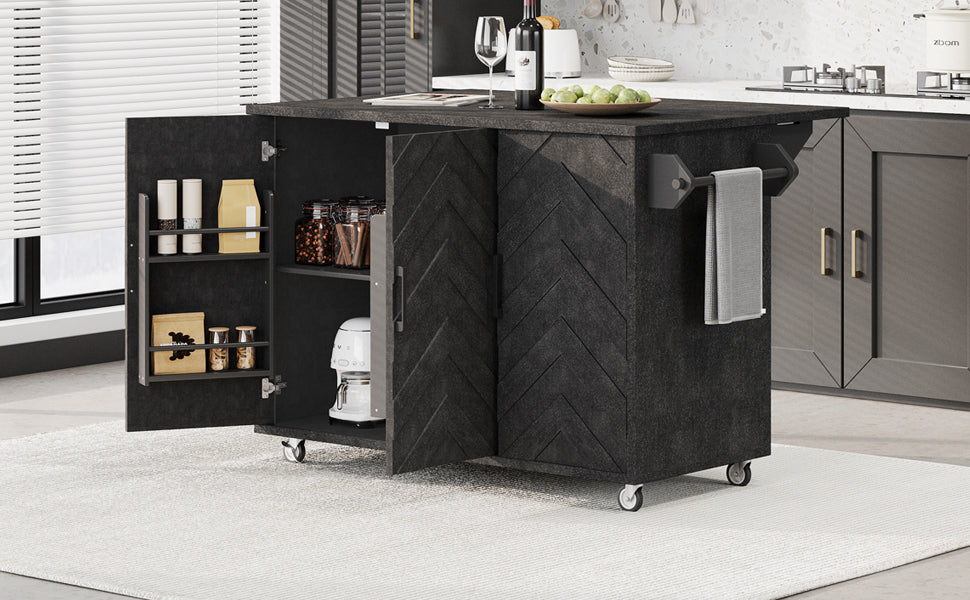 K&K 51.2"W 3D Wave Stripes Ash Veneer Not Cheap Paper Kitchen Island With Drop Leaf, Farmhouse Kitchen Island On Wheels With Internal Storage Rack, Rolling Kitchen Cart Black Black Brown Kitchen