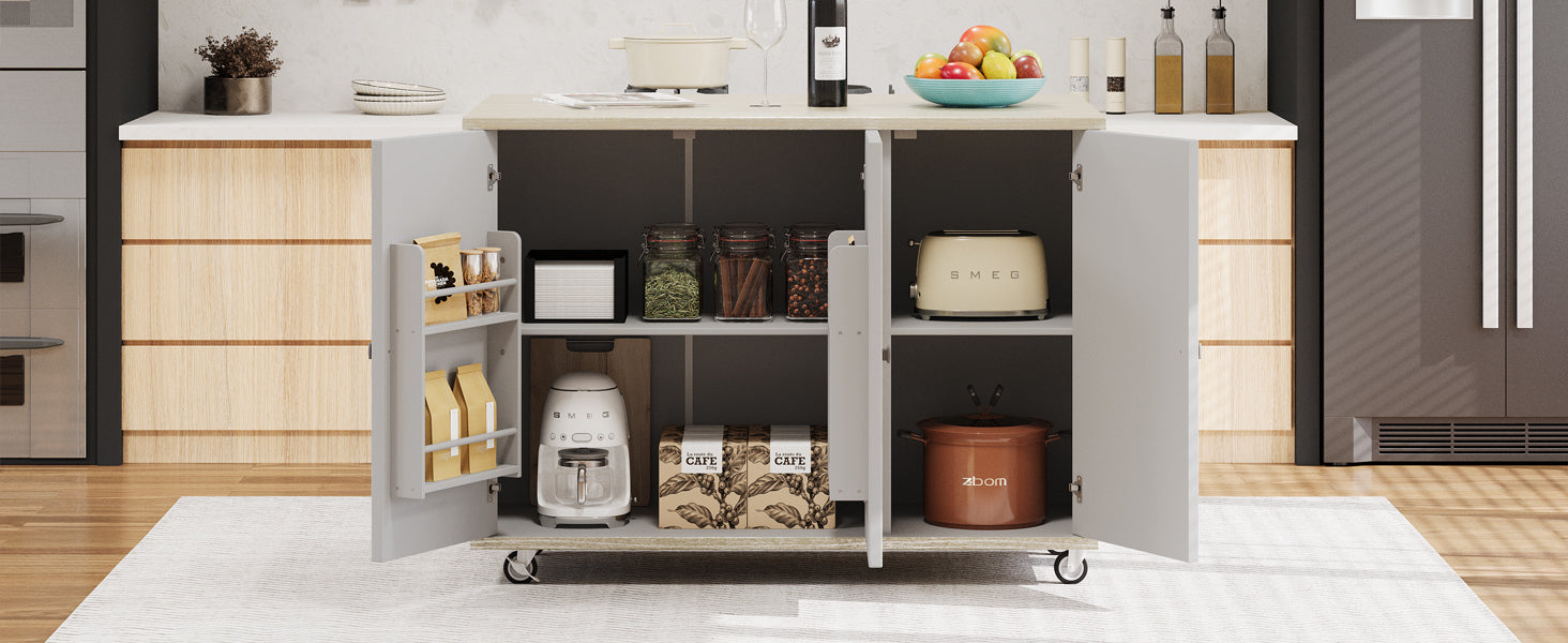| Summary | This modern coastal style indoor kitchen island dining cart can bring class and elegance to your kitchen space while bringing a great degree of convenience to your indoor storage. It is mainly made of eco-friendly Mdf material that will stand the test of time for a long time. The overall wood grain look coupled with the Ash veneer handwoven construction will give your kitchen a more upscale look. In terms of storage space, this kitchen cart has a large 46.5''-wide countertop with drop leaf design, a side towel rack, two internal storage racks and adjustable shelves, so you can freely arrange different items as needed. There are four wheels on the bottom of the product, two of which are lockable and able to move and stop freely. If you need stability, you can also replace the wheels with the included wooden feet. This kitchen island can make you no longer worry about storage in your kitchen space. |