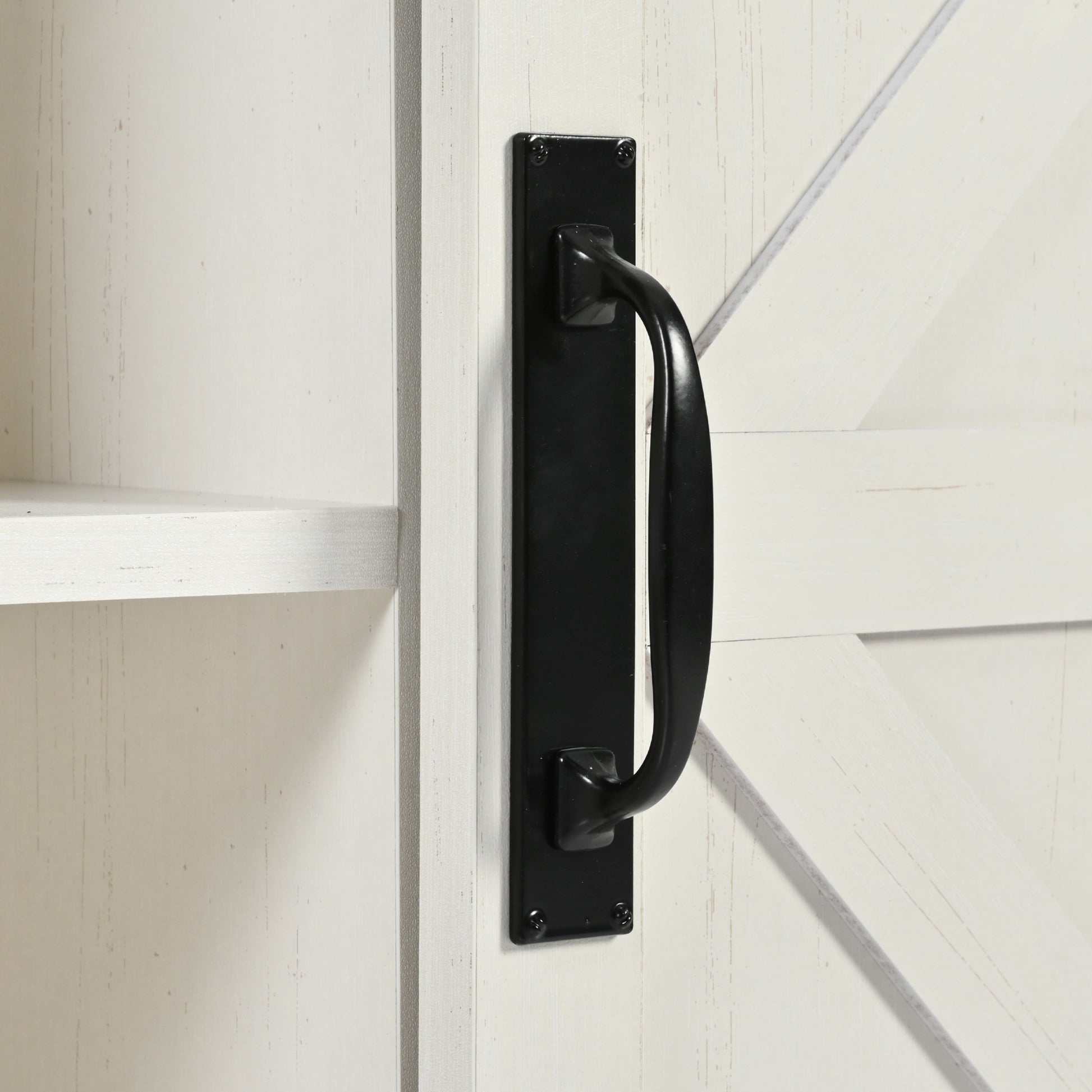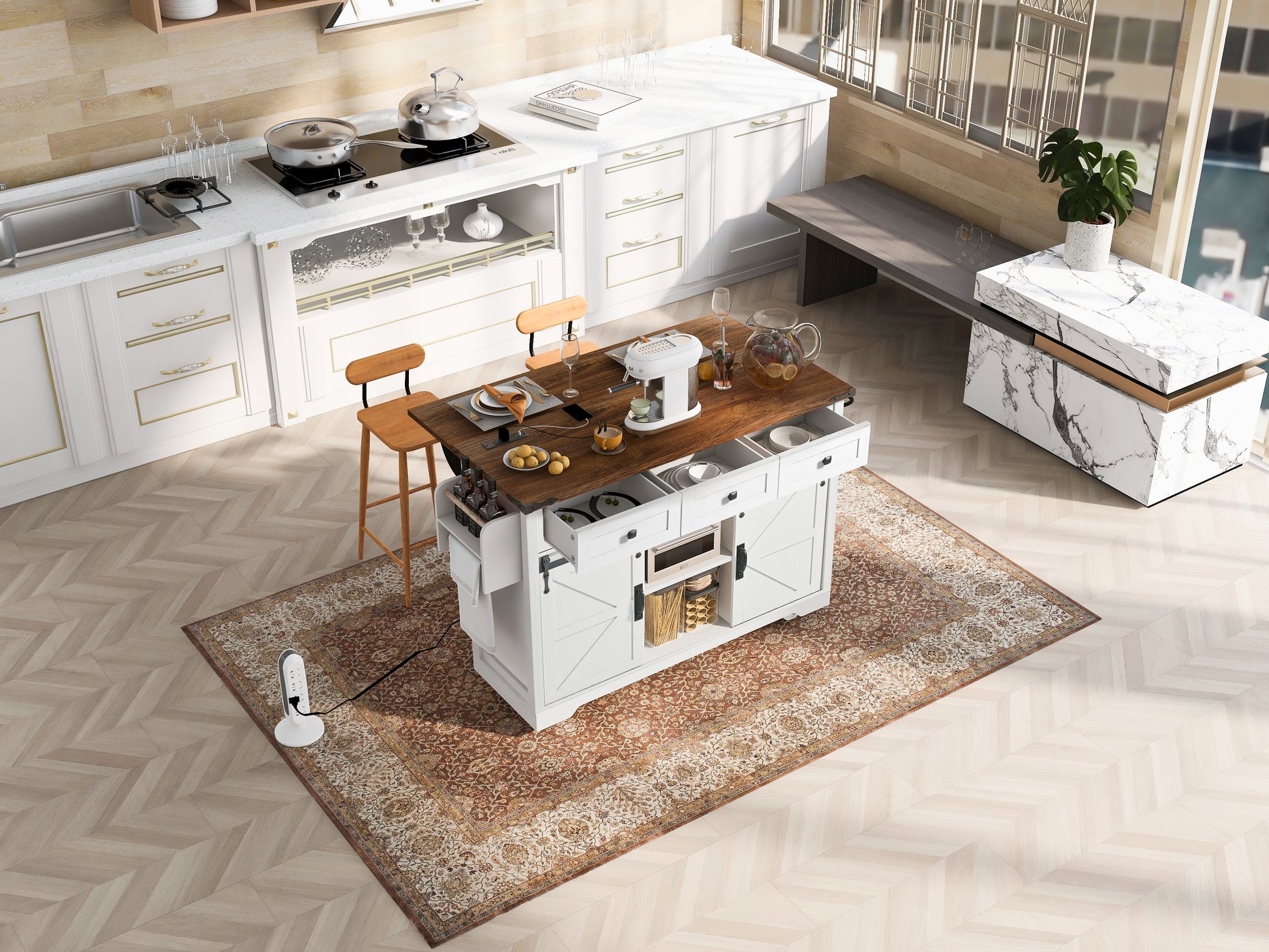 | Summary | This 53.7'' W large rolling kitchen island brings farmhouse flair to your cooking space or eat-in kitchen. Crafted from a blend of P2 Grade engineered wood, it features a white base a light brown countertop, and 2 farmhouse slide barn door, inviting look. With a drop leaf, power outlet, and locking wheels, this kitchen cabinet offers versatility and mobility. It includes three drawers, two cabinets with three interior shelves, and two doors, providing storage for your kitchen essentials. |