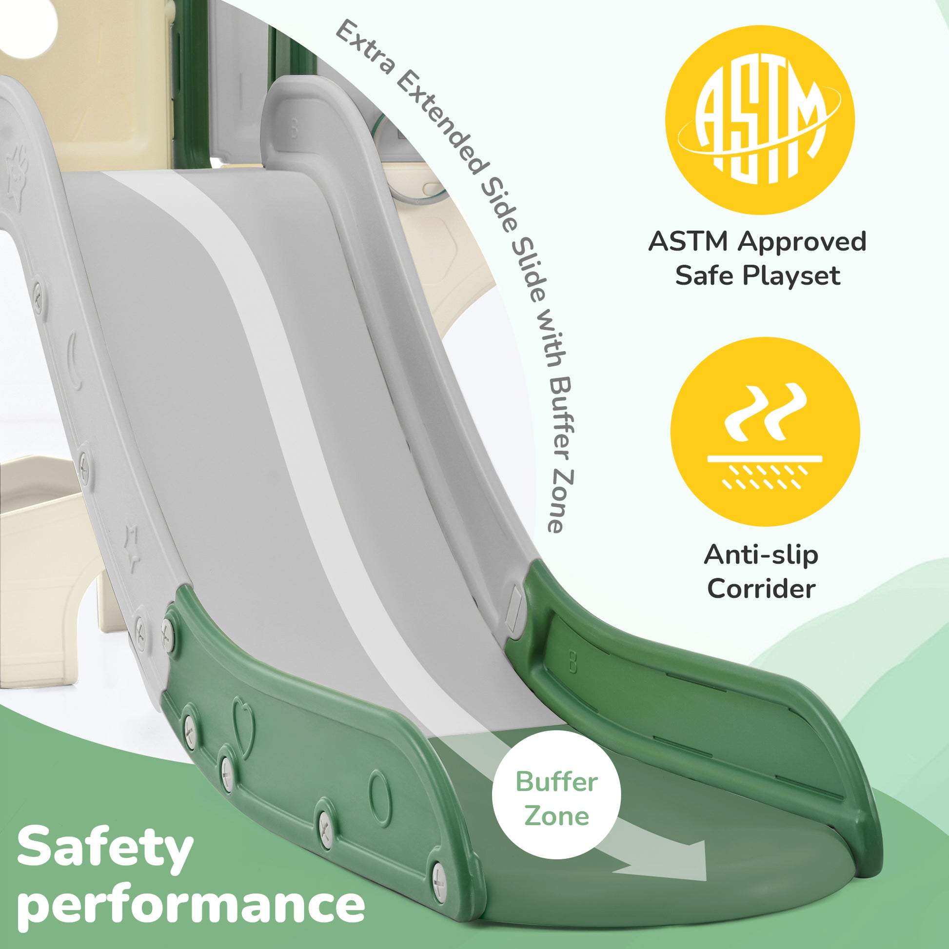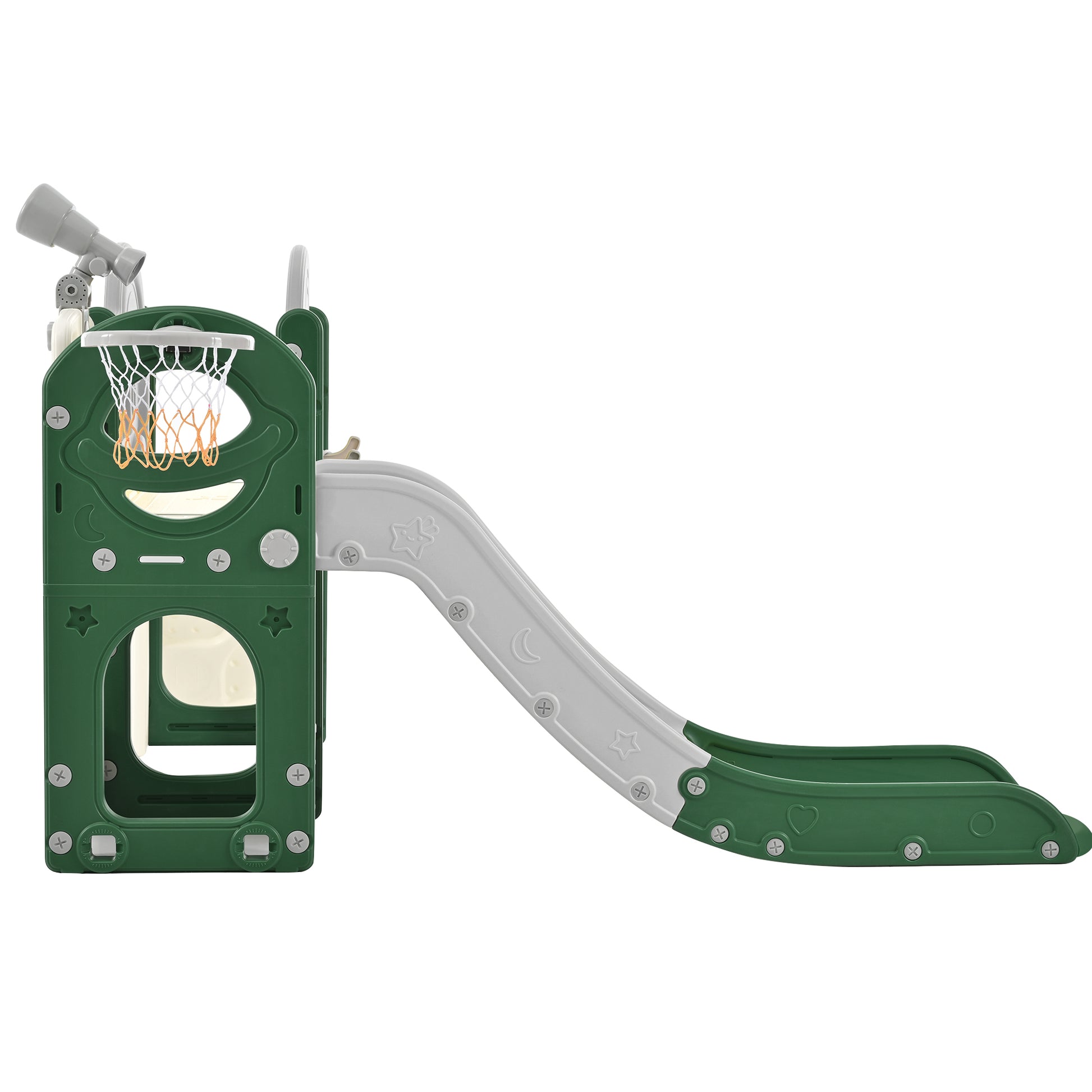 Kids Slide Playset Structure 7 In 1, Freestanding Space Set With Slide, Arch Tunnel, Ring Toss And Basketball Hoop, Toy Storage Organizer For Toddlers, Kids Climbers Playground Green Hdpe