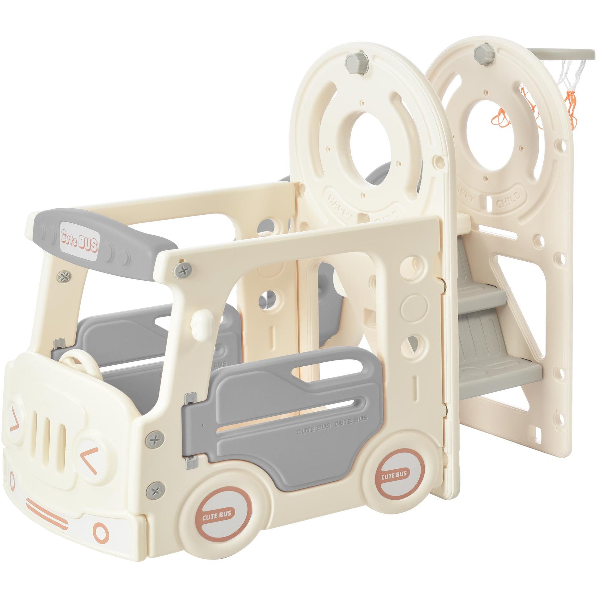 Kids Slide With Bus Play Structure, Freestanding Bus Toy With Slide For Toddlers, Bus Slide Set With Basketball Hoop Gray Hdpe