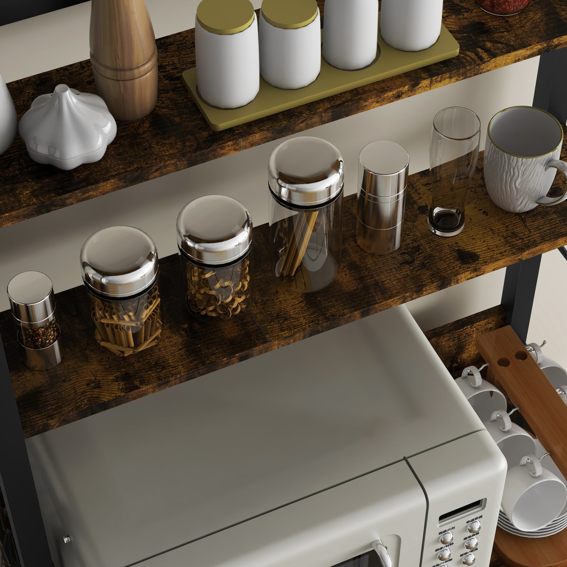 Kitchen Bakers Rack, Microwave Stand, Coffee Bar With Adjustable Shelves, 4 Hooks For Spices, Pots And Pans, Rustic Brown Rustic Brown Particle Board