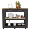 Kitchen Island 36" H, Six Casters, Two Drawers, Two Open Storage Shelves, Towel Hanger, Black Light Oak Multicolor Particle Board Particle Board