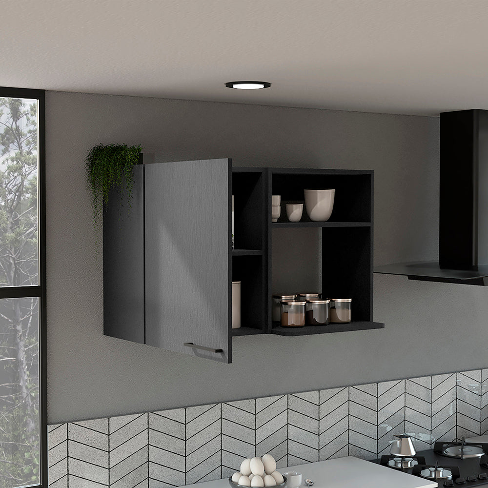 Kitchen Wall Cabinet Bussolengo, Two Shelves, Black Wengue Finish Black Particle Board