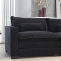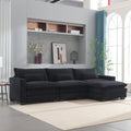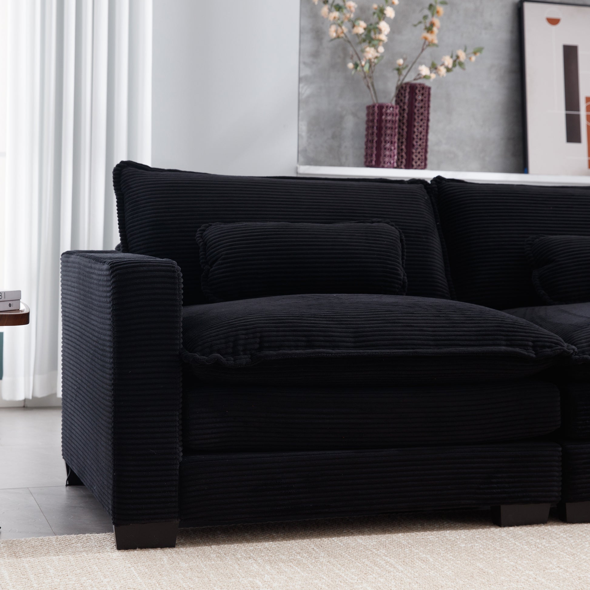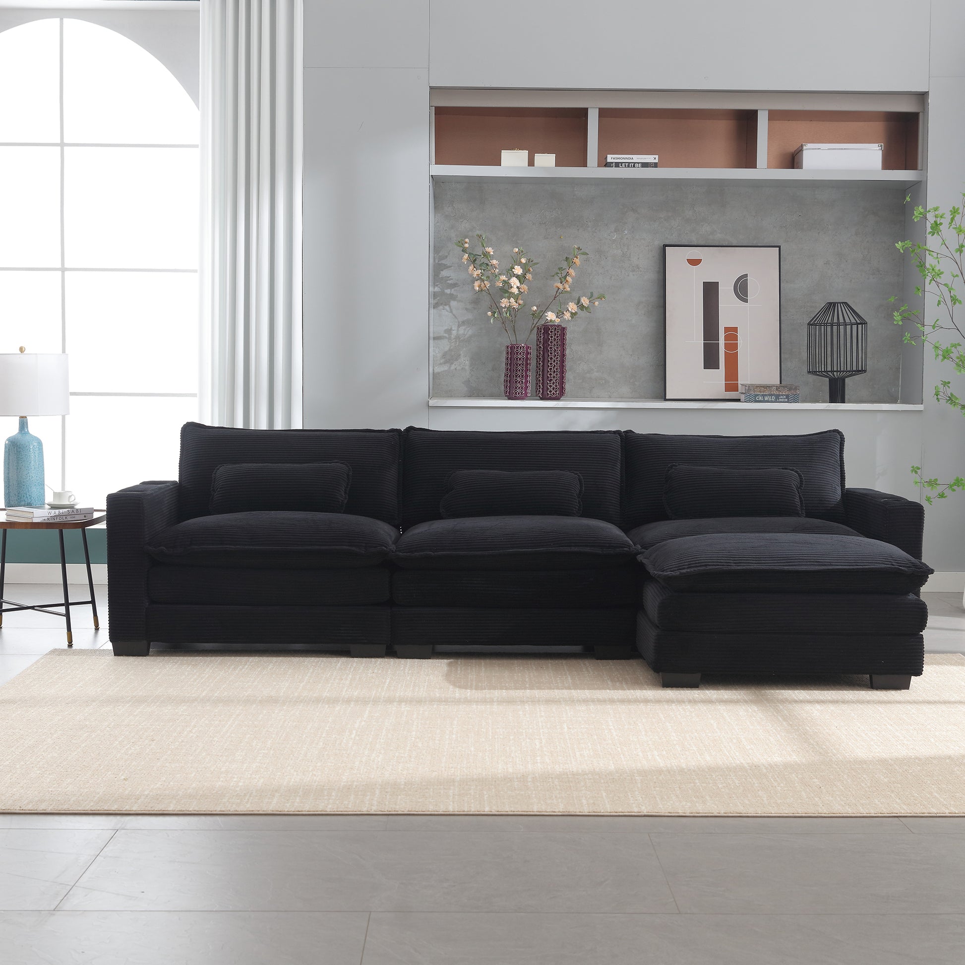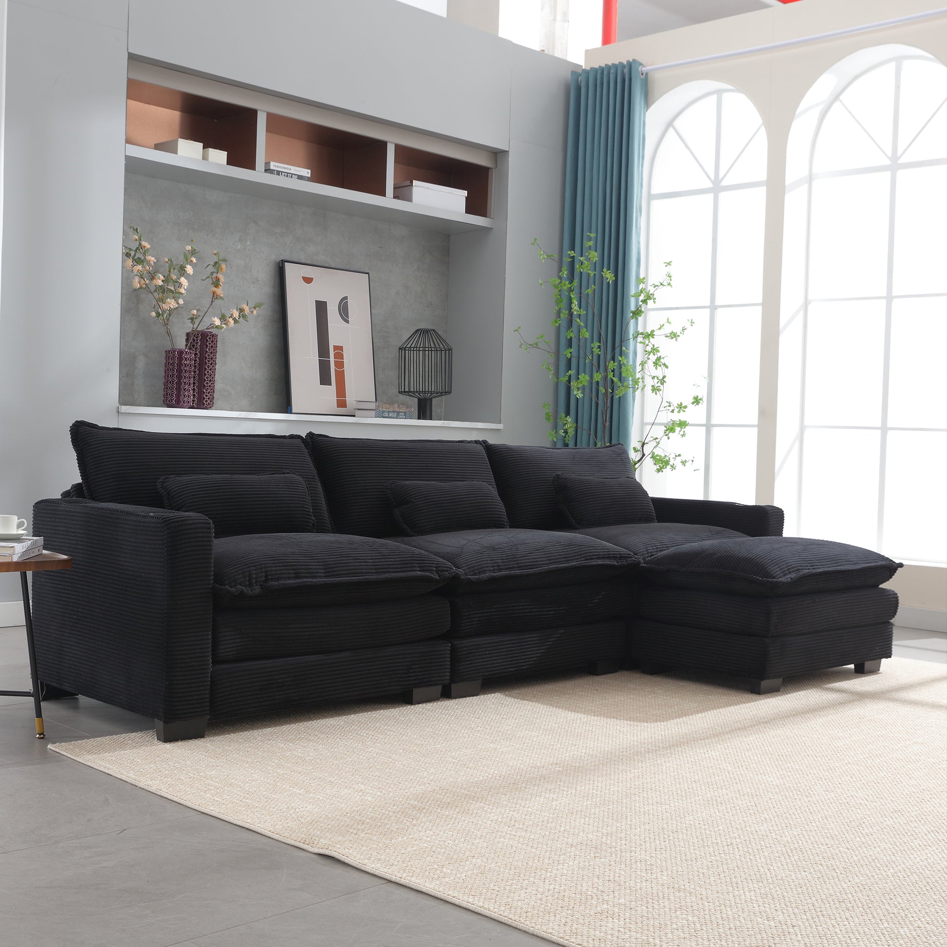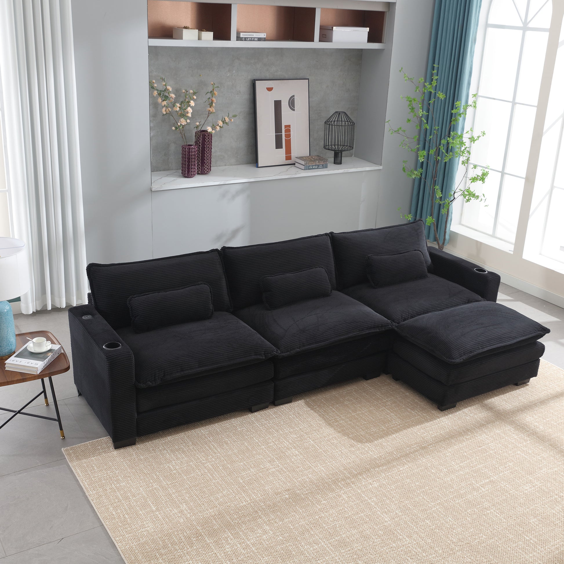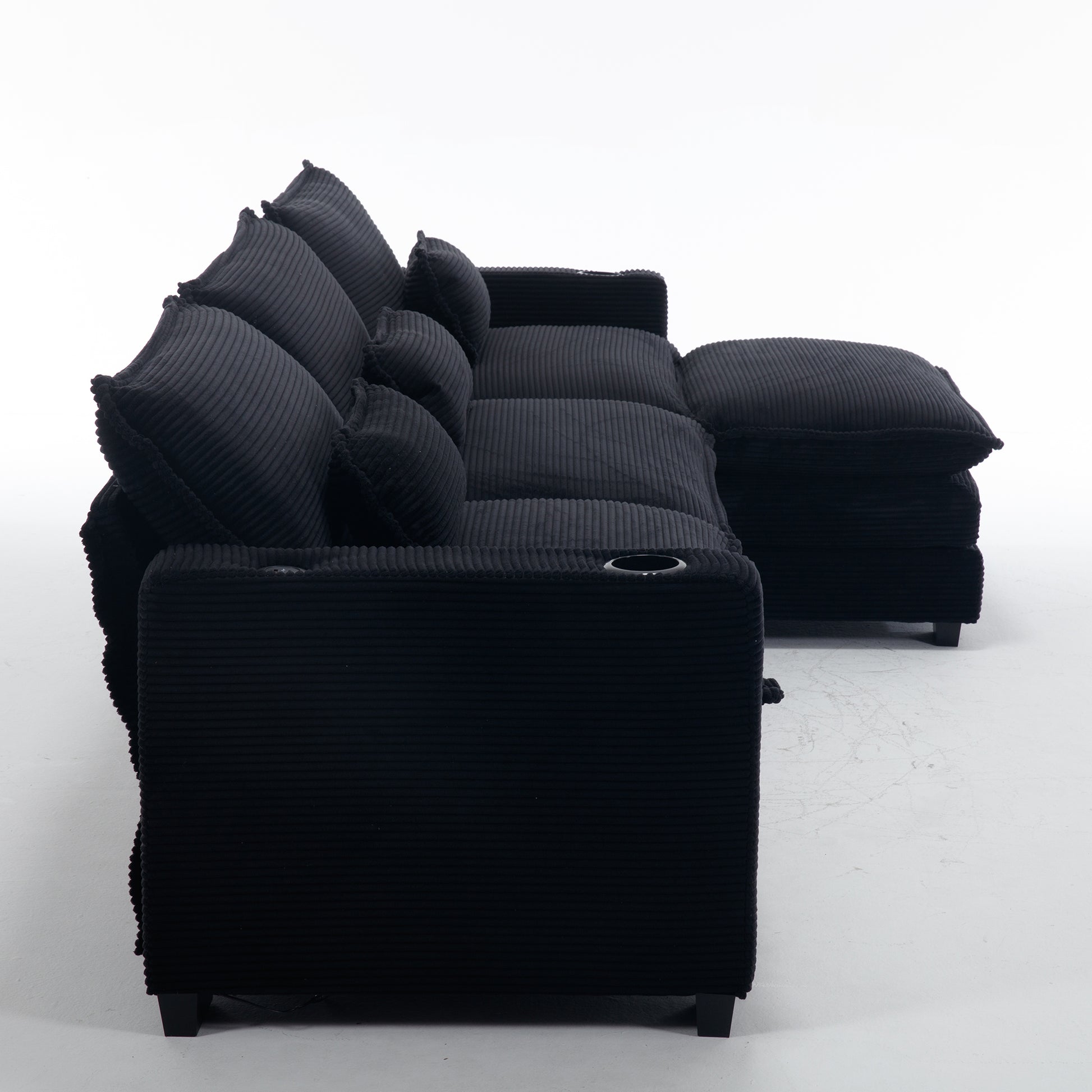 L Shape Sofa Couch With Usb & Cup Holders, Corduroy Stripe Fabric 3 Seater Sofa With 1 Ottoman, Black Black Wood 4 Seat