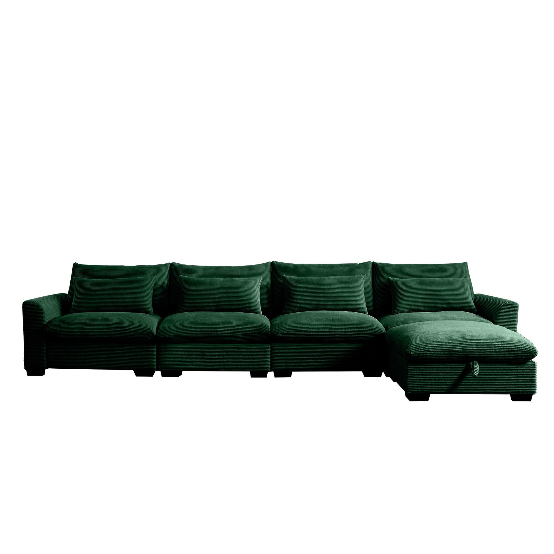 Large L Shape Sectional Corduroy Sofa,Deep Seat Couch With Storage Footstool And 4 Waist Pillows, Green Green Corduroy 4 Seat