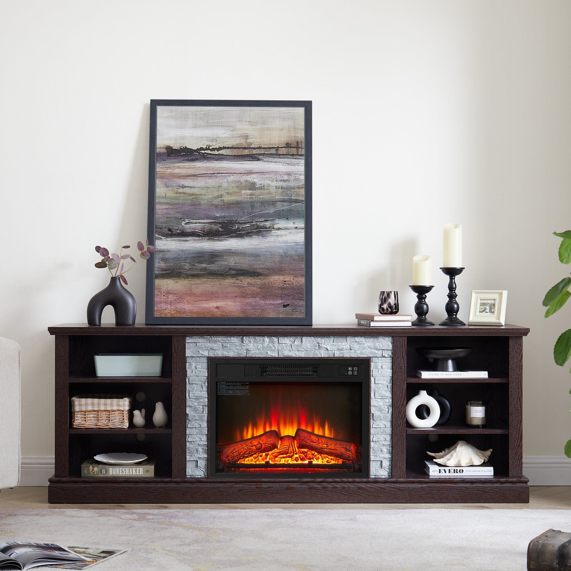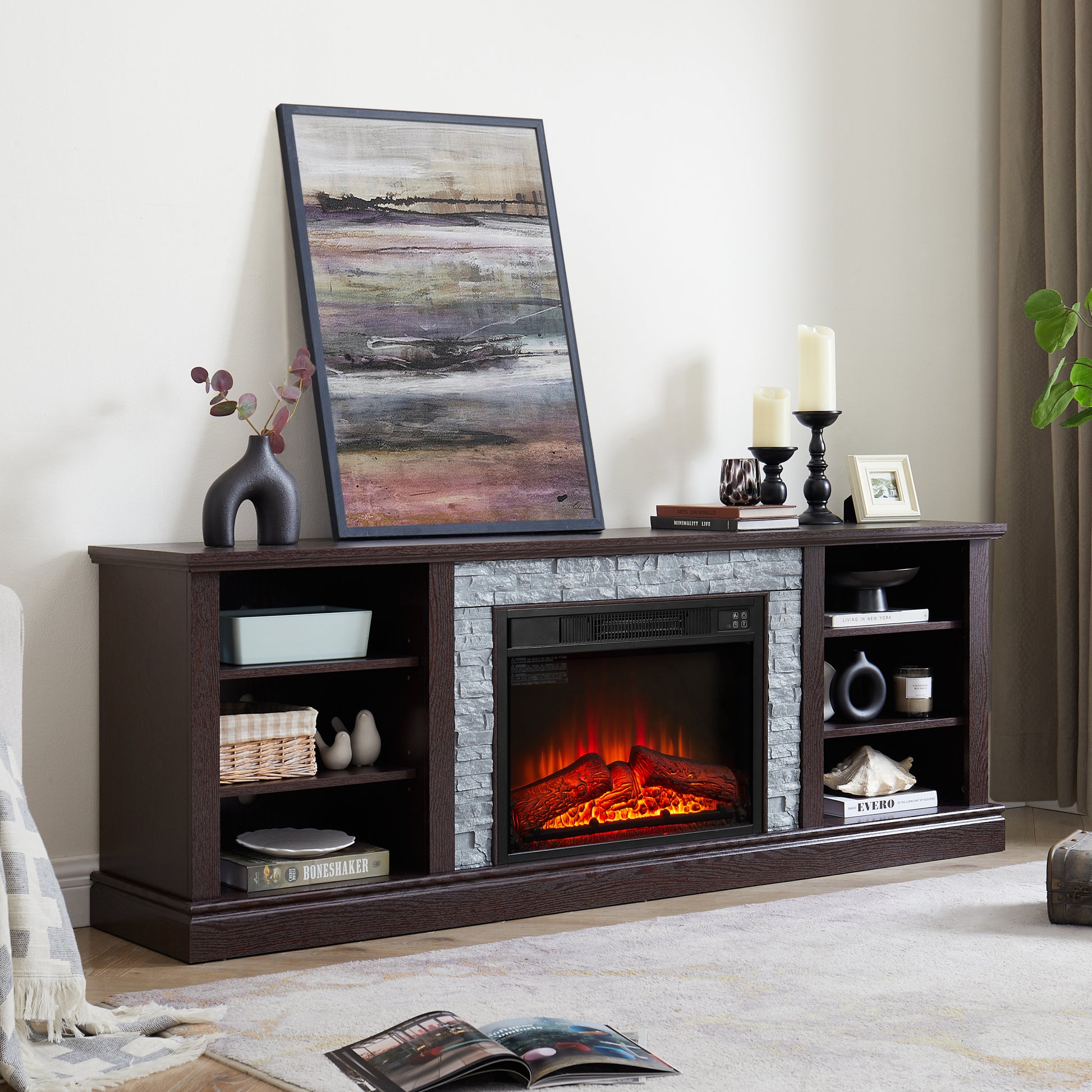 Large Tv Desk Storage Rack With Faux Stacked Stone Surround,Media Console Table With Large Storage Cabinet,Modern Tv Media Stand With 23" Fireplace Insert,Cherry, 70.12"W*15.35"D*25.83"H Cherry 70 79 Inches Mdf