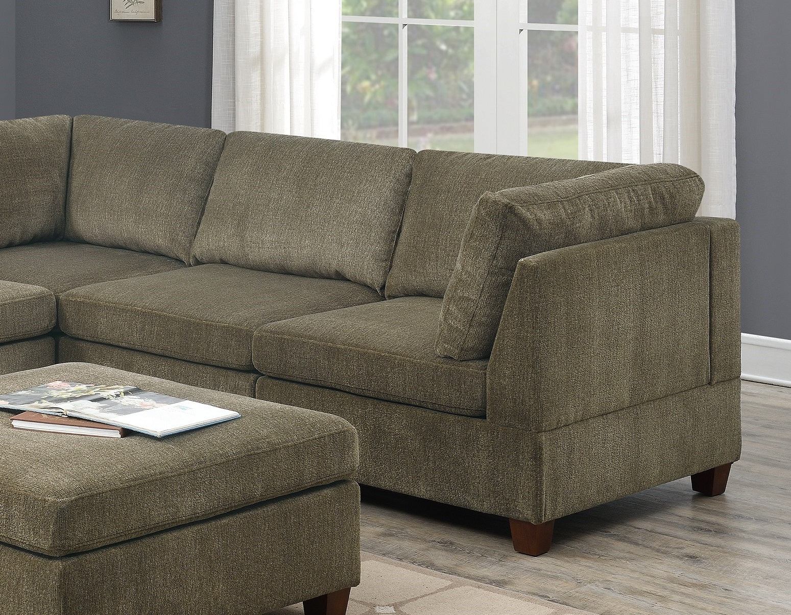 Anchor your style with this ultra soft and spacious 6-piece sectional sofa set. Upholstered in chenille, this lounge unit features a modular design sofa that versatile that conforms to a chaise or standard sectional. This set also includes a cocktail ottoman. Available in grey or tan.