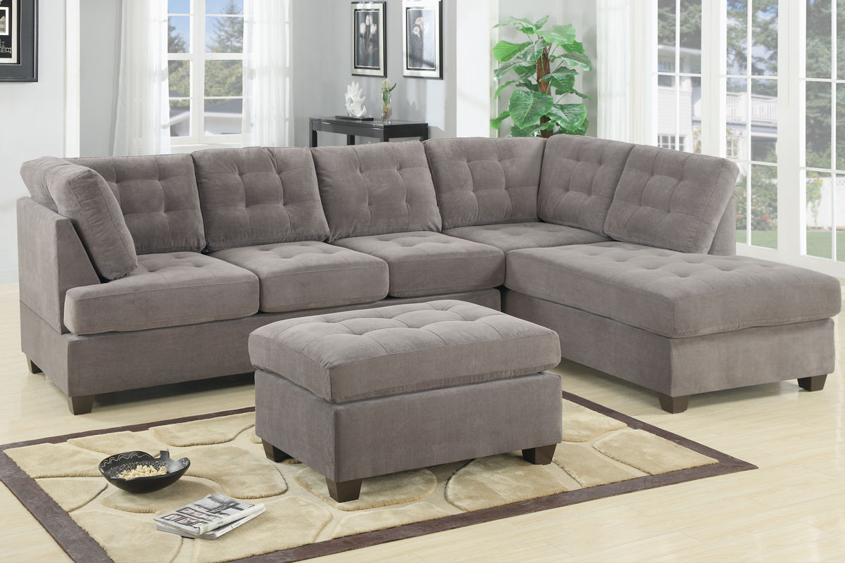Upholstered in a blend of smooth texture and colors, this 2-piece sectional defines any living space with a well-crafted furnishing for your home. Featuring seating space with tufting, a matching cocktail ottoman and accent pillows. Available in waffle suede.