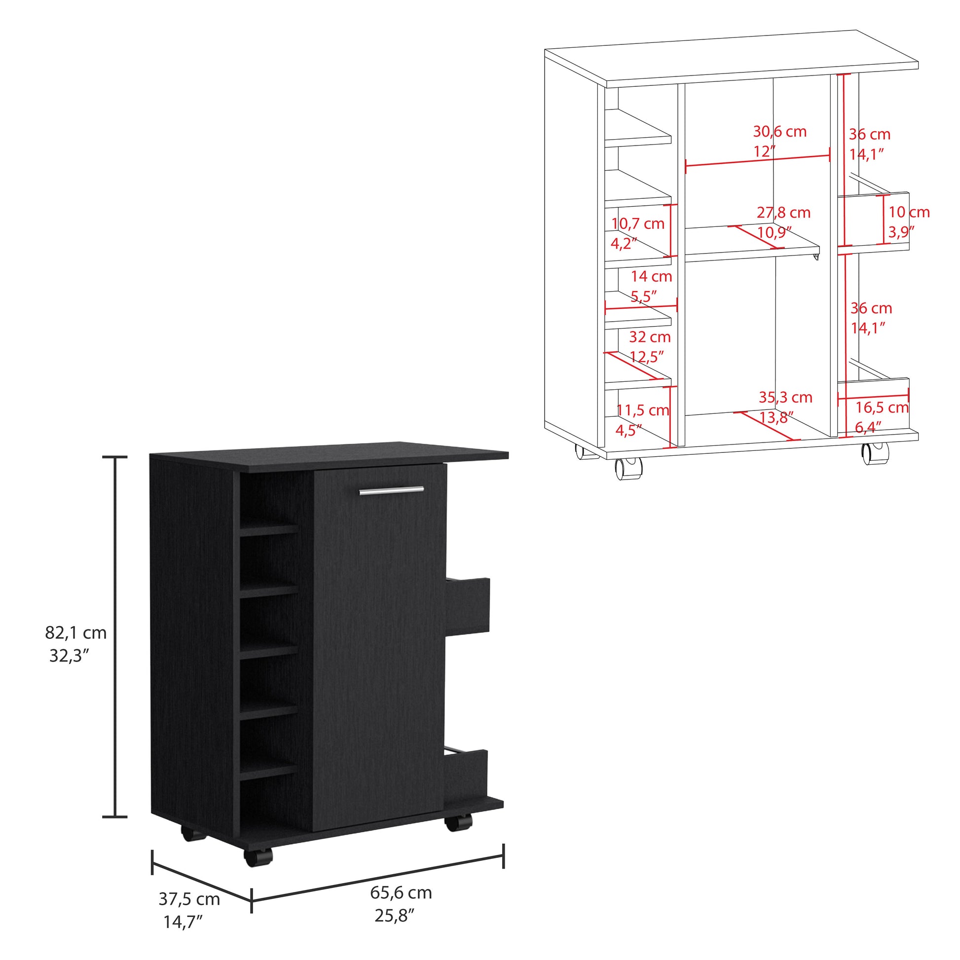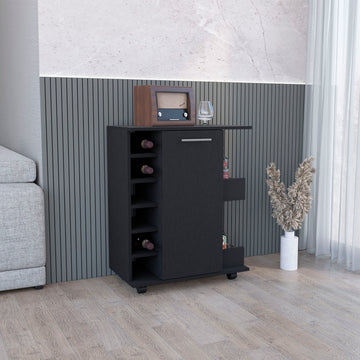 Lothian Bar Cart With Casters, 2 Side Storage Shelves And 6 Wine Bottle Rack Black Primary Living Space Modern Particle Board Engineered Wood