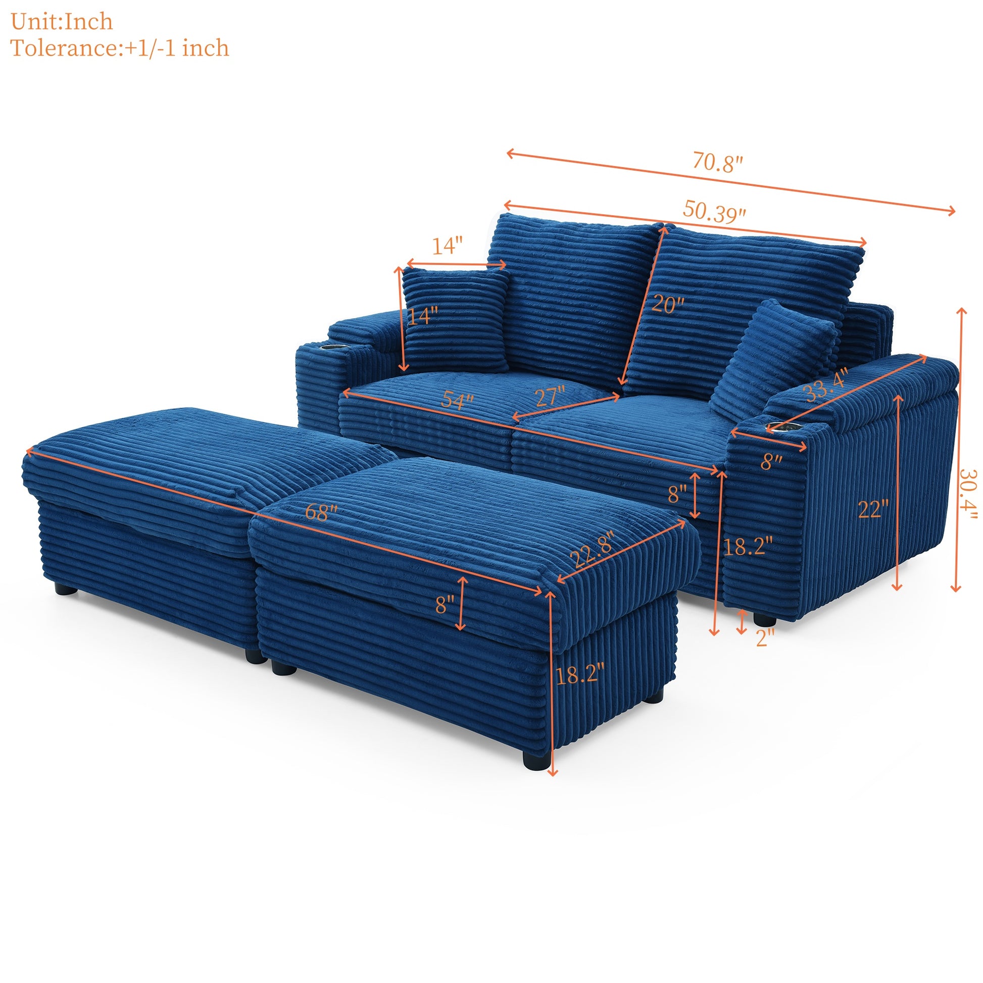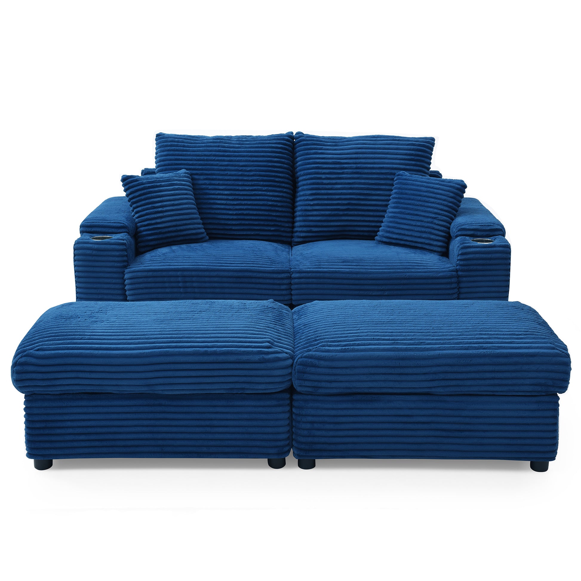 Loveseat With Ottomans,Corduroy Fabric Modular Sectional Sofa,Comfy Deep Plush Couch With Ottomans And Two Pillows,For Small Spaces, Living Room,Bedroom, Office, 5 Colors,Blue Blue Wood Primary
