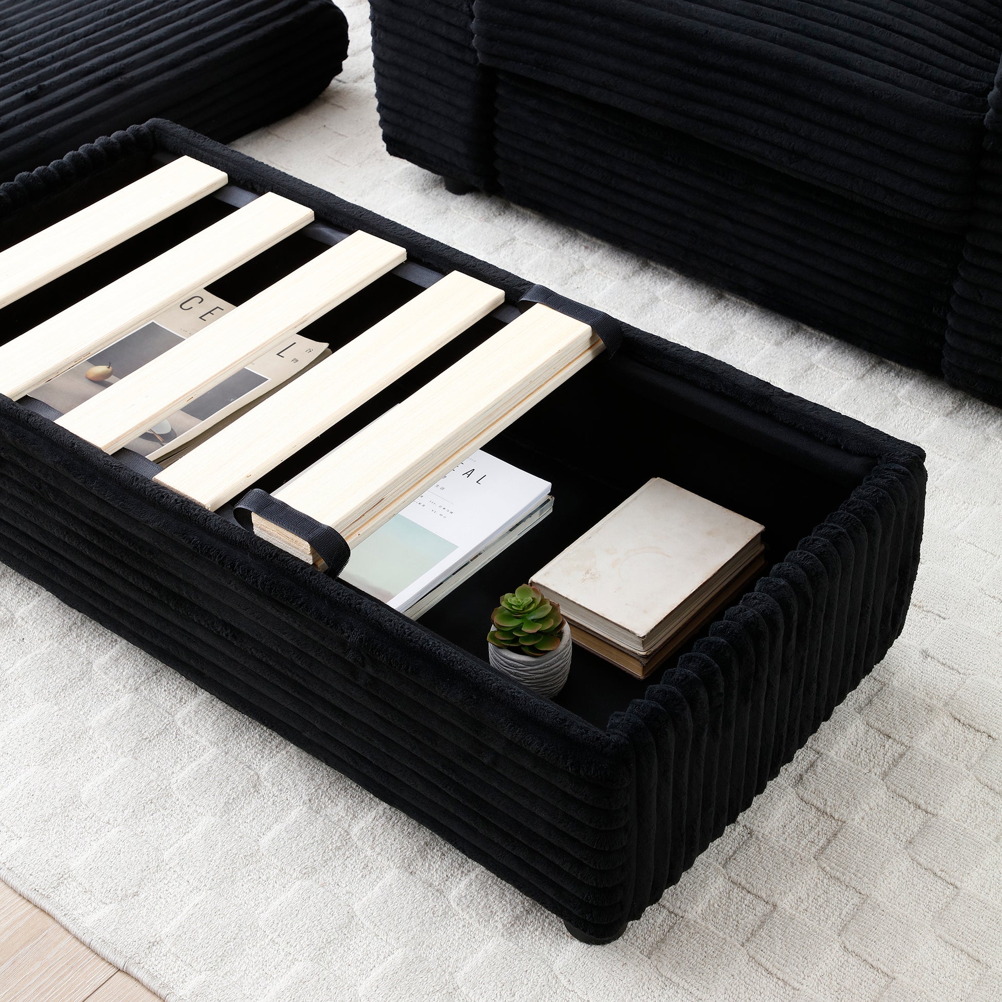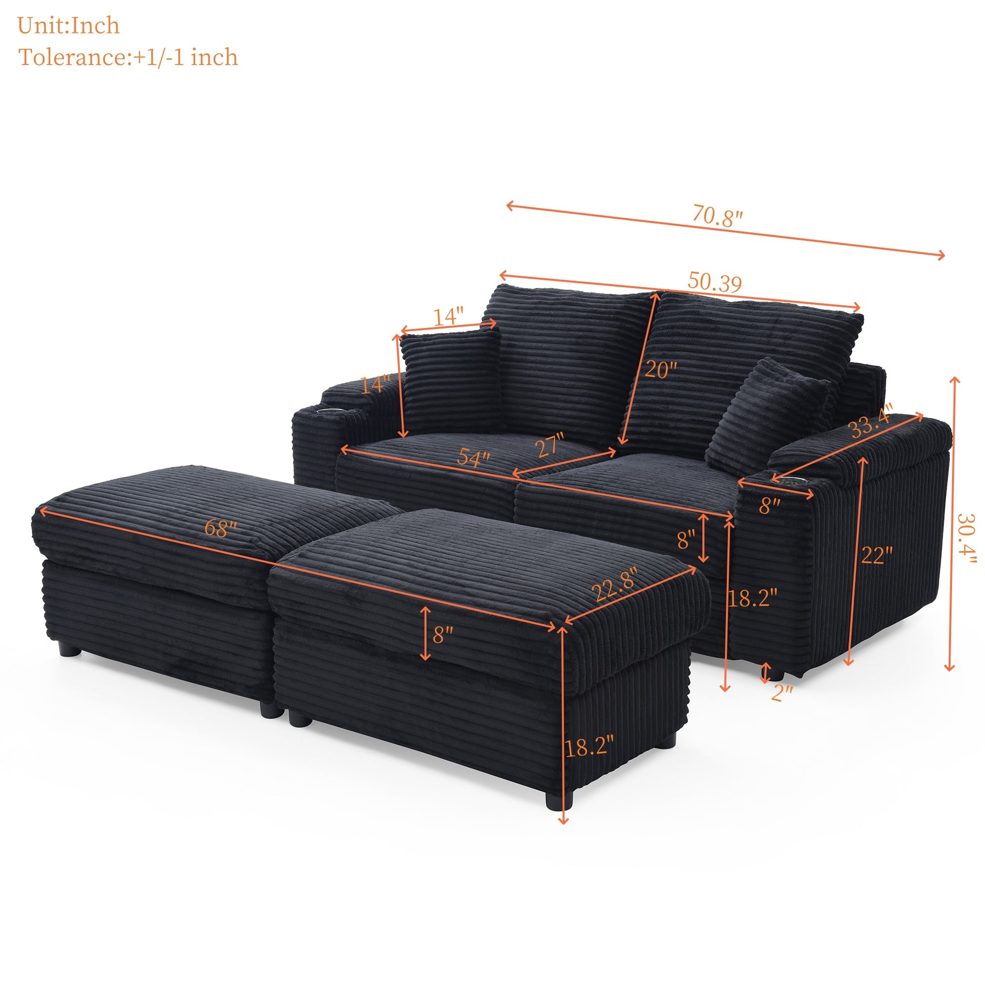 Loveseat With Ottomans,Corduroy Fabric Modular Sectional Sofa,Comfy Deep Plush Couch With Ottomans And Two Pillows,For Small Spaces, Living Room,Bedroom, Office, 5 Colors,Black Black Wood Primary