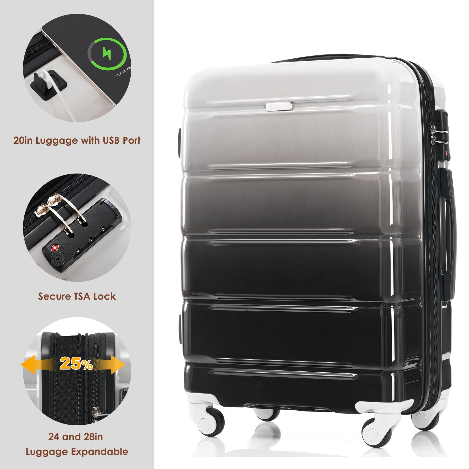 Luggage Set Of 3, 20 Inch With Usb Port, Airline Certified Carry On Luggage With Cup Holder, Abs Pc Hard Shell Luggage With Spinner Wheels, Black Black Gery Abs Pc