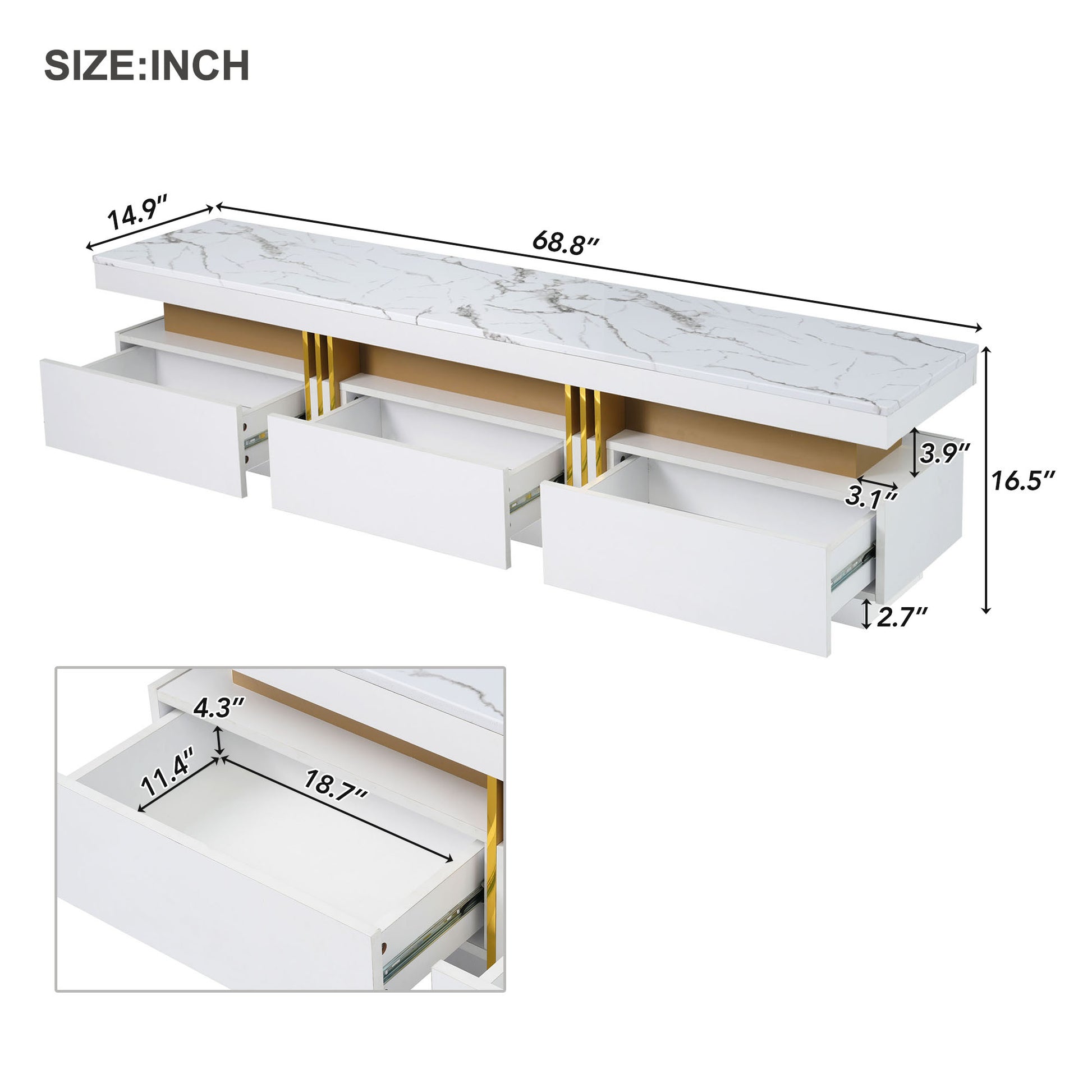 | Detailed Measurement | Overall: 68.8w x 14.9d x 16.5h / Drawer: 18.7w x 11.4d x 4.3H |