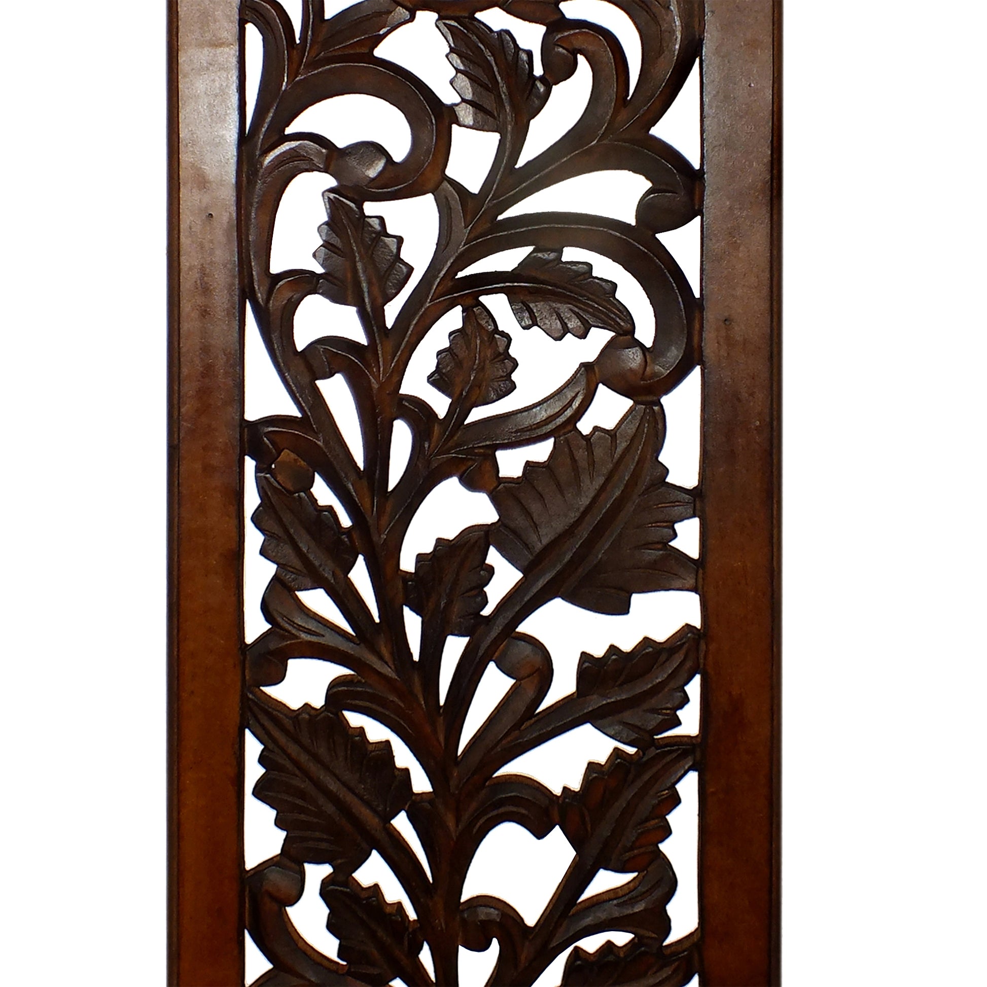 Mango Wood Wall Panel Hand Crafted With Leaves And Scroll Work Motif, Brown Brown Solid Wood