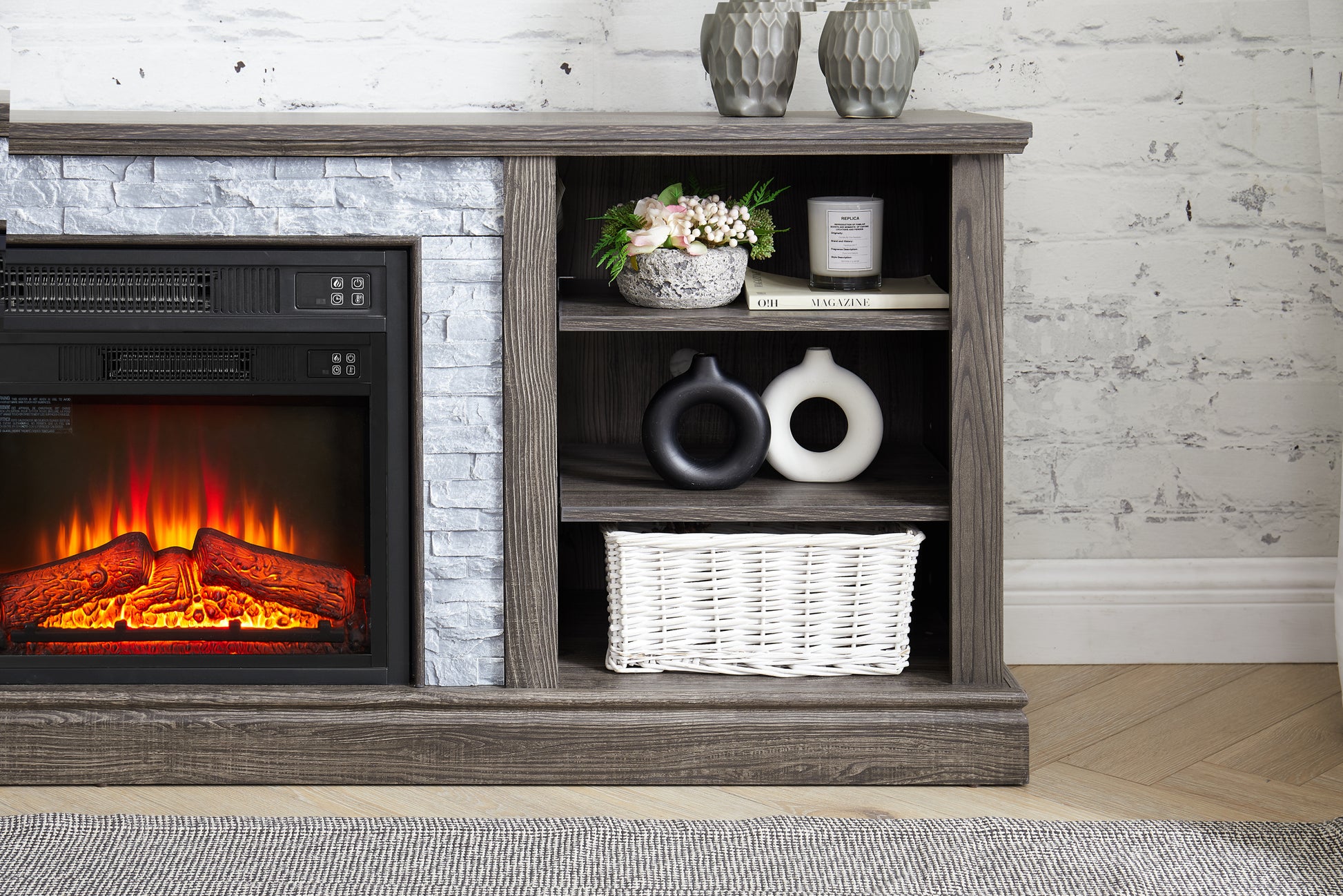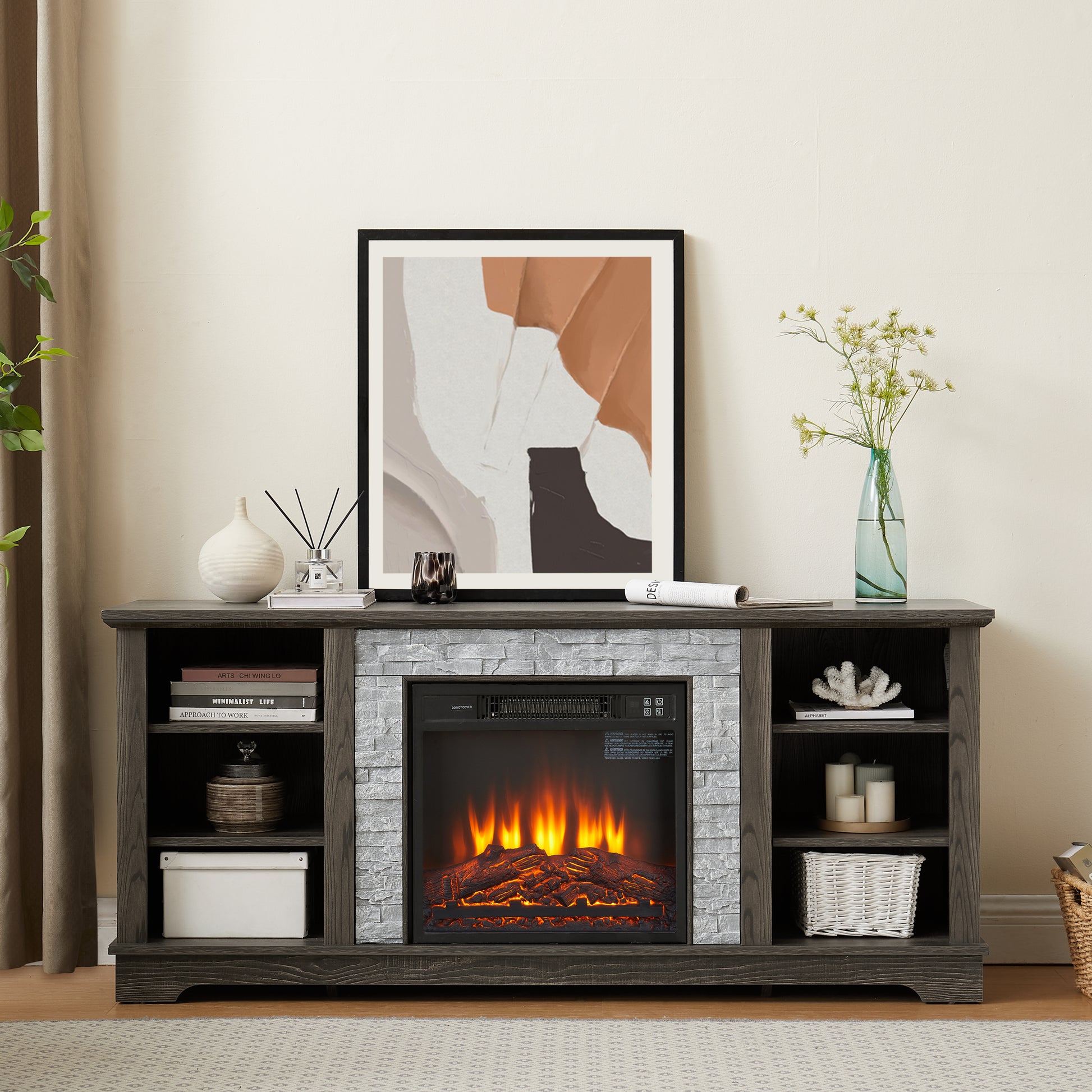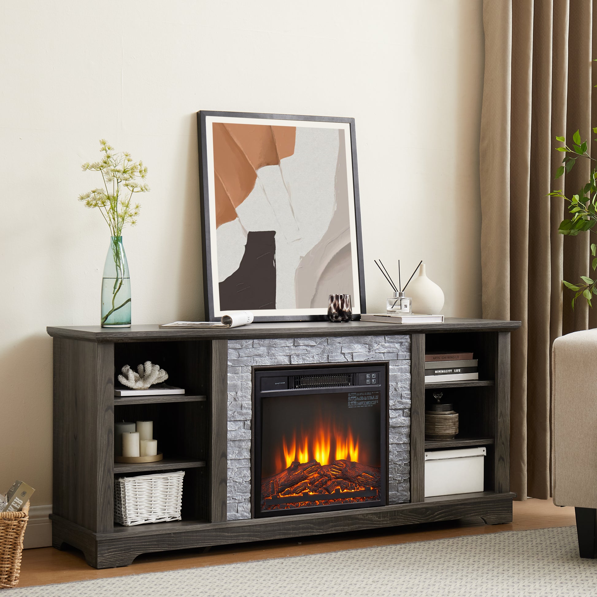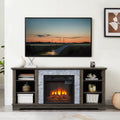 Mantel Electric Fireplace Stone Tv Media Stand With With Faux Stacked Stone Surround, Modern Entertainment Console With Open Storage Space,Grey, 58.31"W*15.39"D*26.06"H Grey 60 69 Inches Mdf