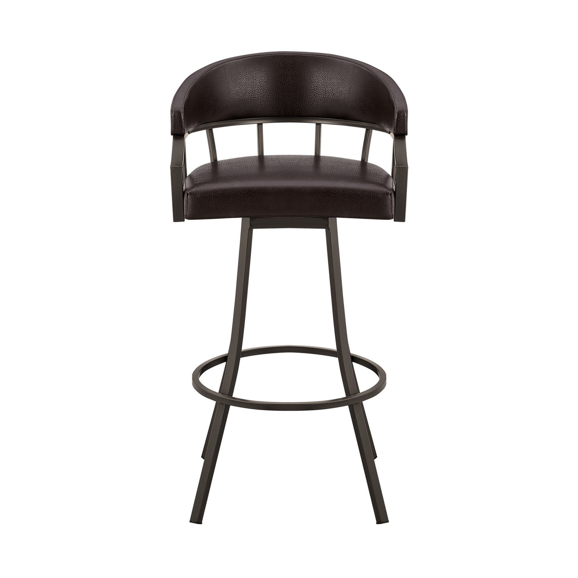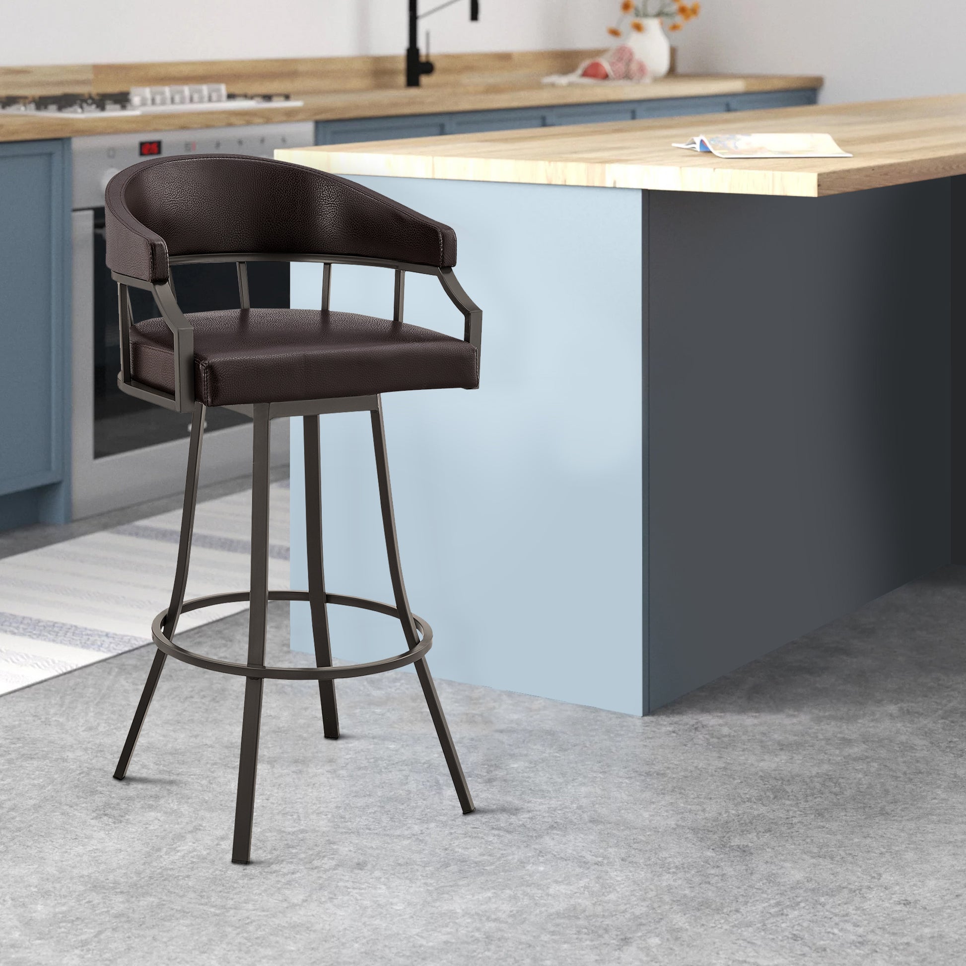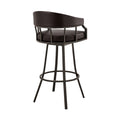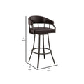 Mayla 30 Inch Swivel Bar Stool, Metal Flared Legs, Brown Faux Leather Brown Fabric Metal