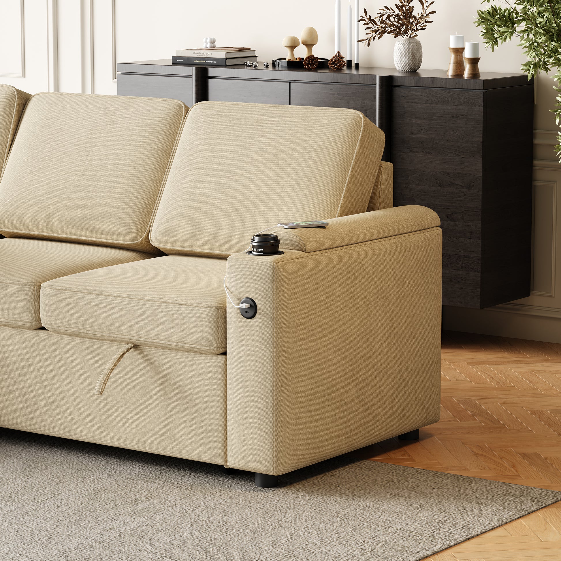 Mh85.8" Sleeper Sofa, Sofa Bed 2 In 1 Pull Out Sofa Bed With Storage Sofa, Sofa Sleeper With Pull Out Bed With Charging Port Beige Primary Living Space Eucalyptus Polyester Fabric 3 Seat