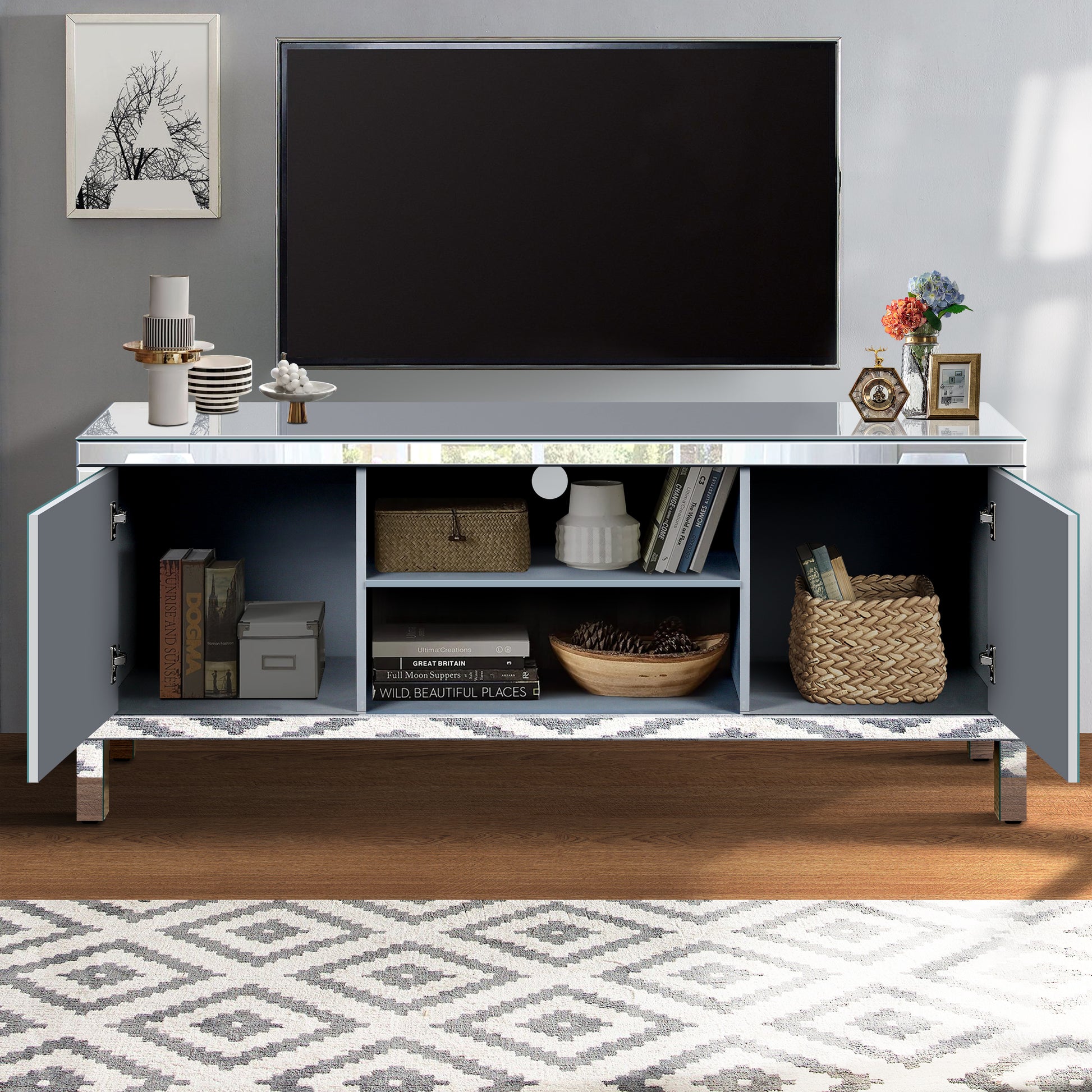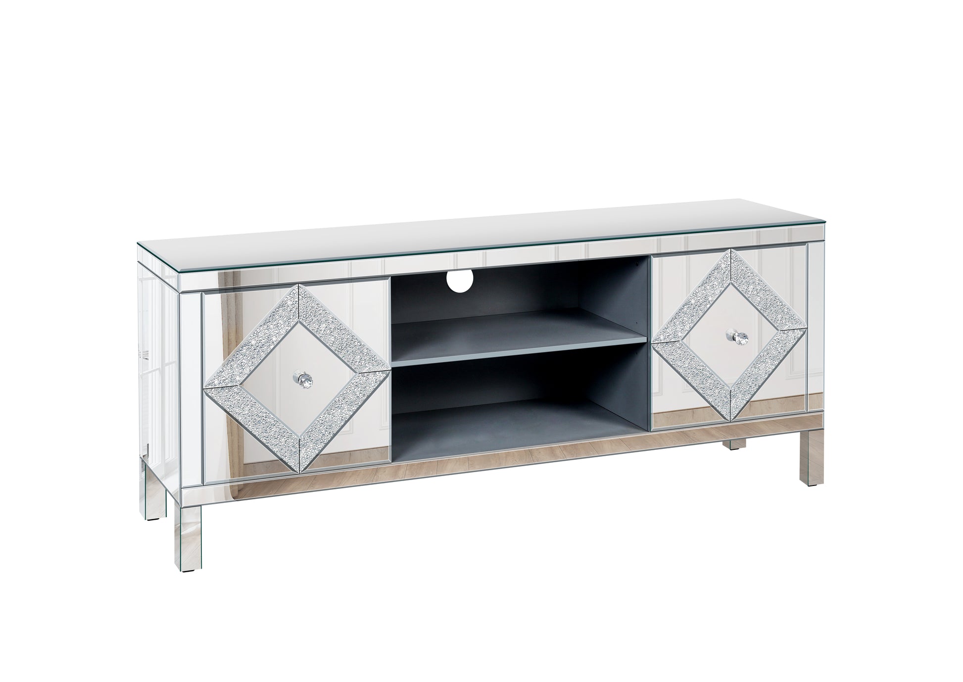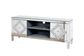 Mirrored Tv Stand For 65 Inch Tv,Sliver Tv Console Table With Open Storage & 2 Storage Cabinets ,Diamond Shape Sparkling Mirror Doors For Living Room 59''W X 25.2''H X 15.7D 1 2 Shelves Glass Pane