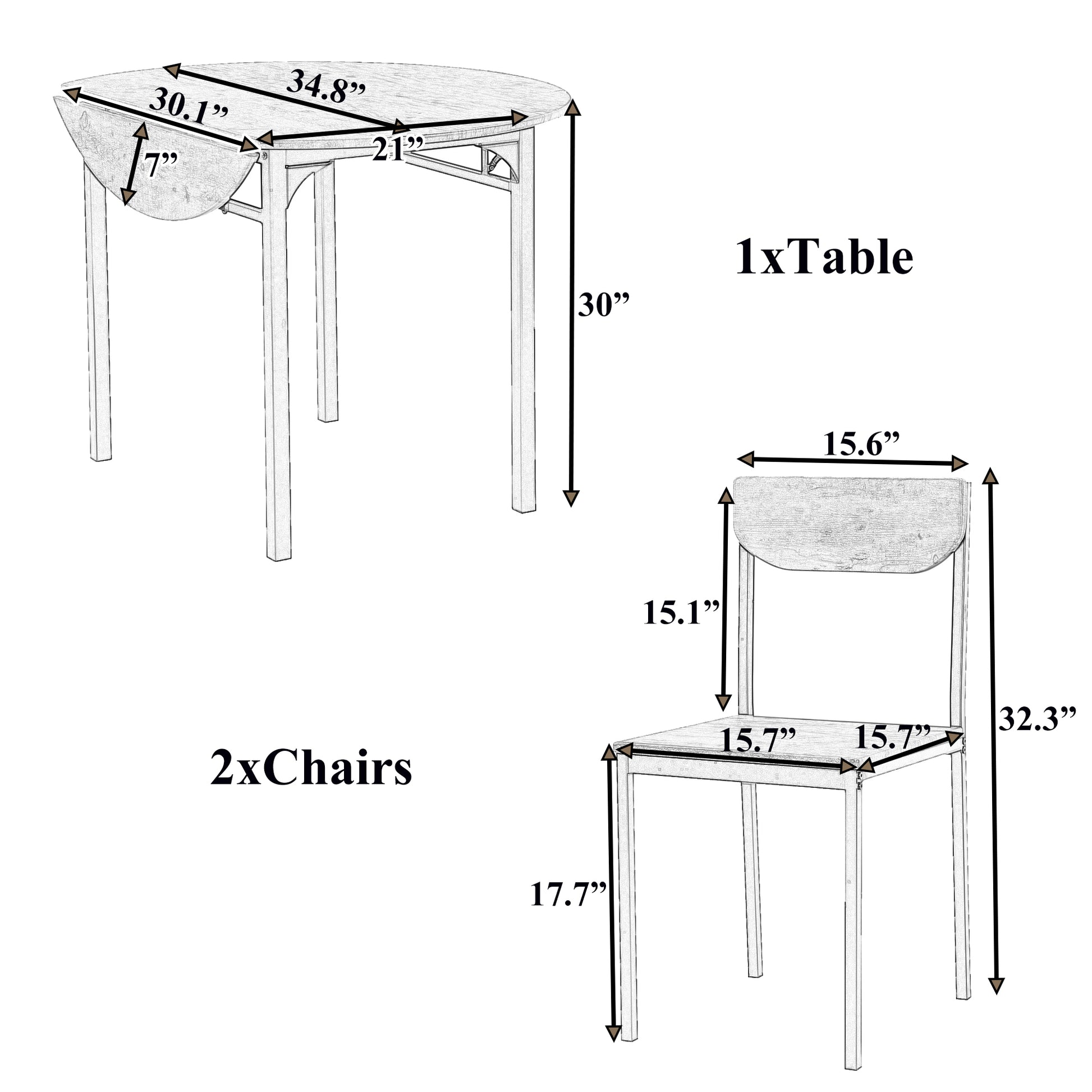 | Overall Product Dimension | Table dimension ( collapsed): 30.1x21x30inch; Table dimension (expanded): dia 34.8x30inch; Tabletop thickness:0.6inch; Chair:15.7x15.7x32.3inch; Seat to Ground:17.7inch |