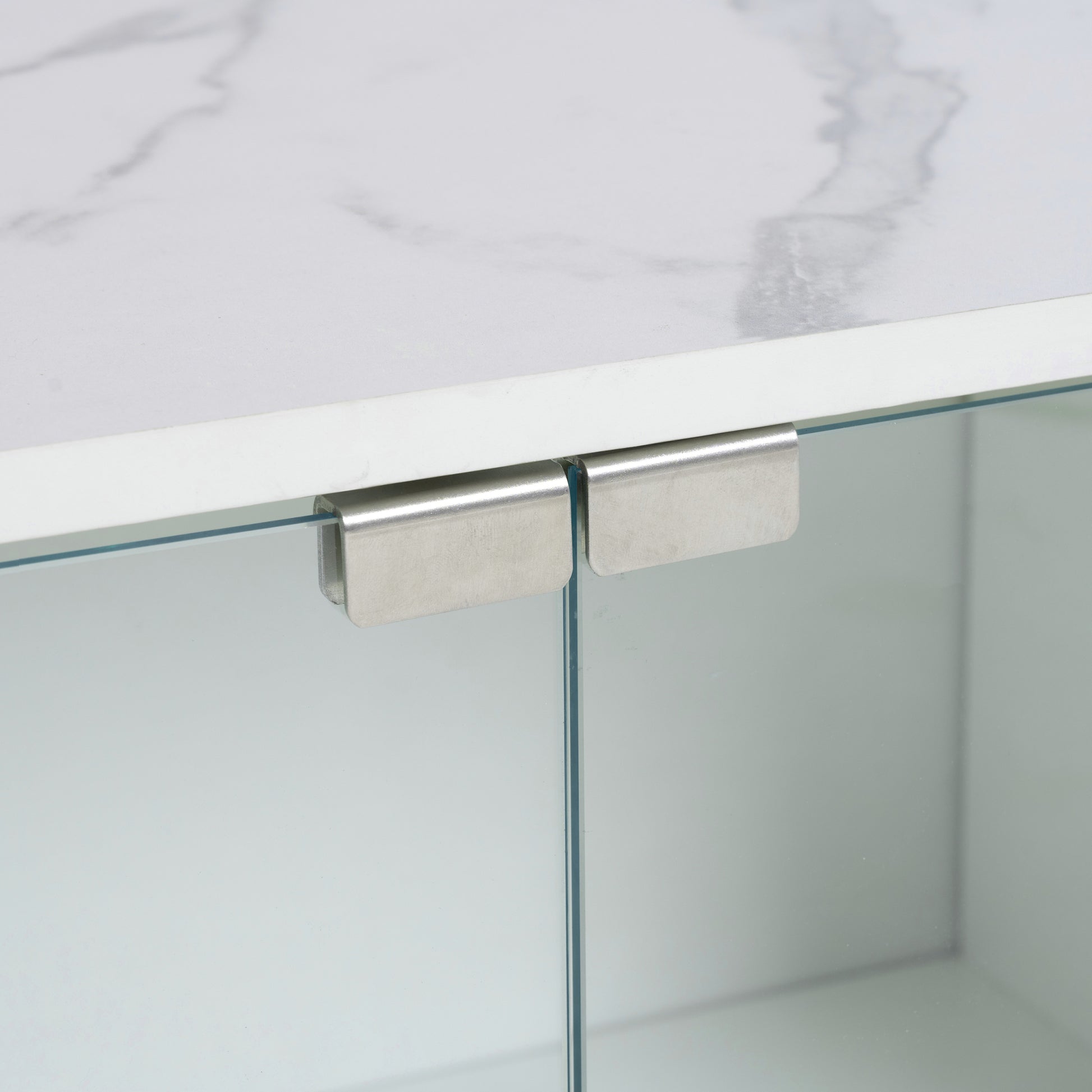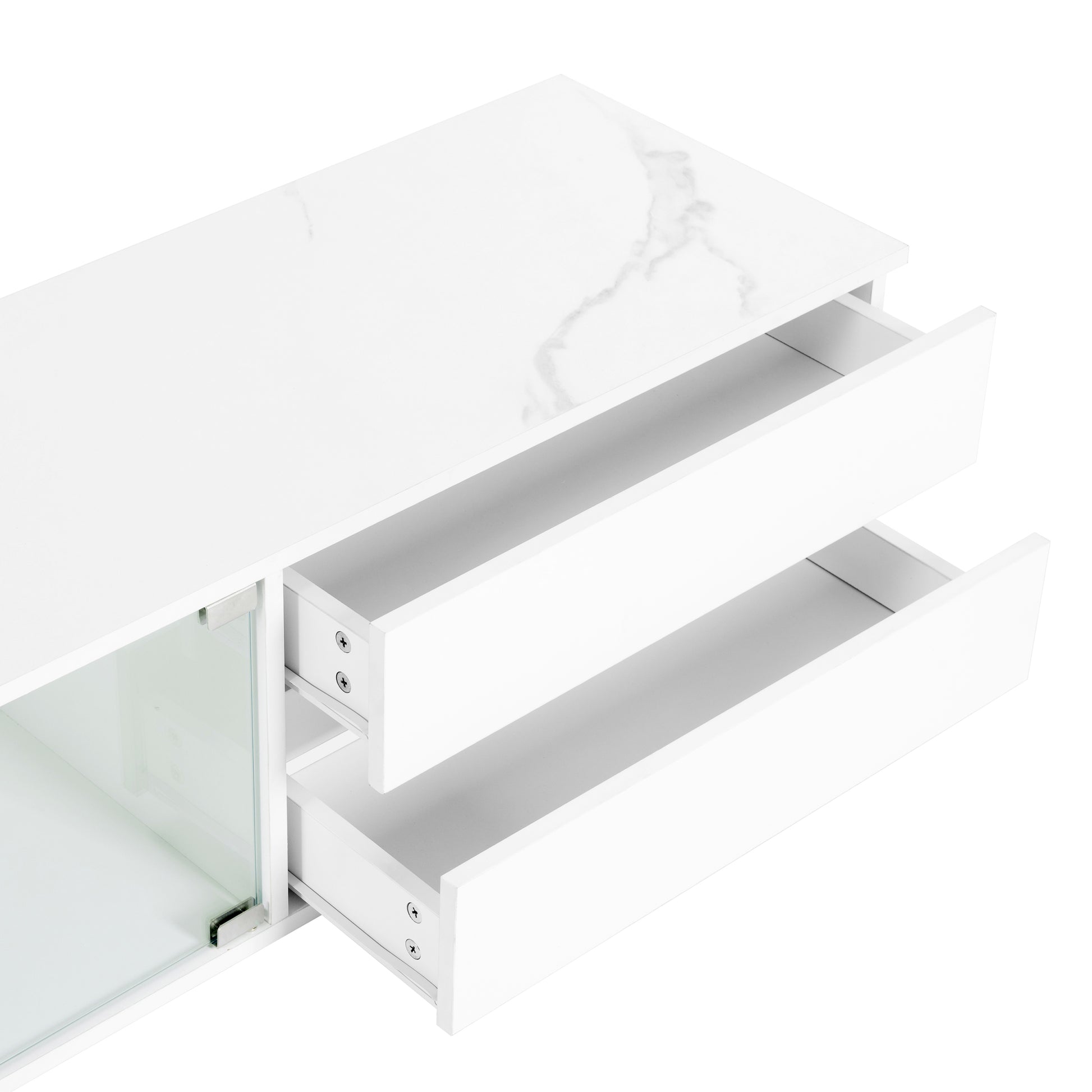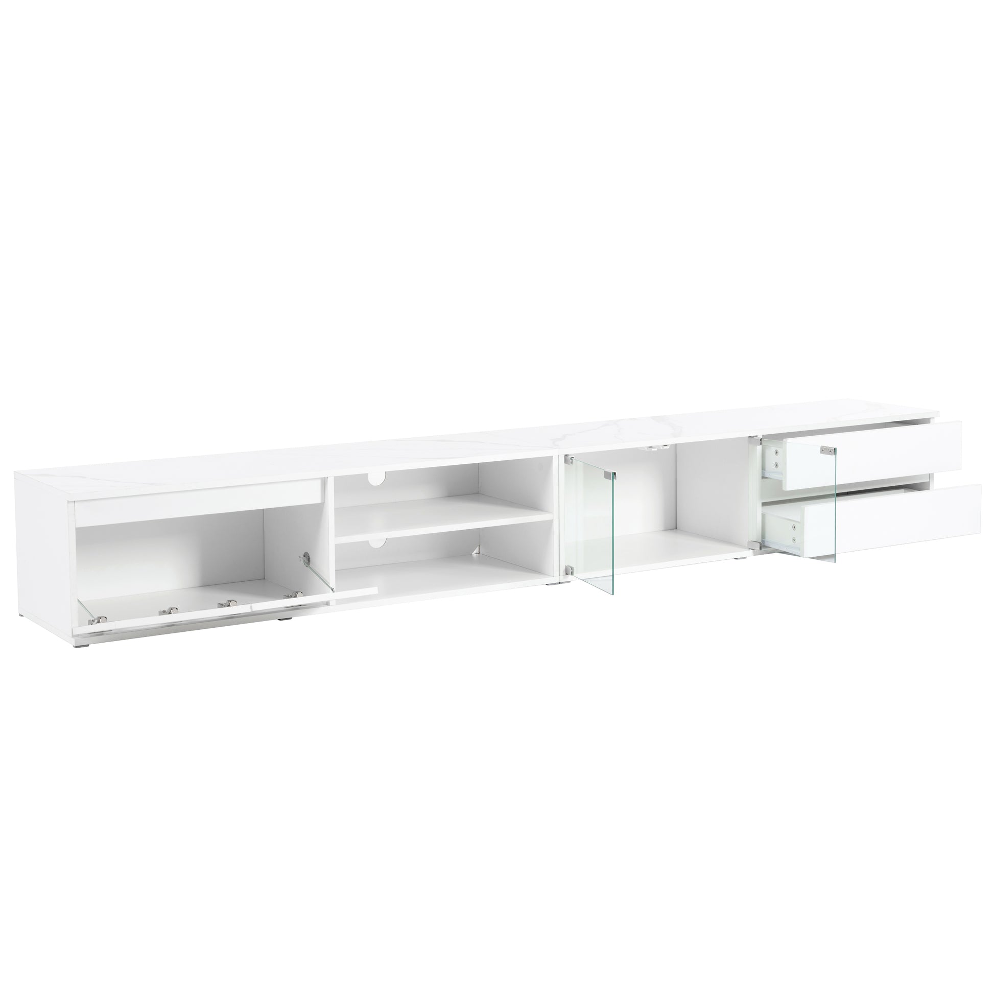 Modern App Controlled Led Tv Stand For Tvs Up To 105'', Faux Marble Tabletop Media Console With Tempered Glass Doors, Entertainment Center With 2 Drawers & Cabinets For Living Room, White White 90 Inches Or Larger Particle Board Mdf