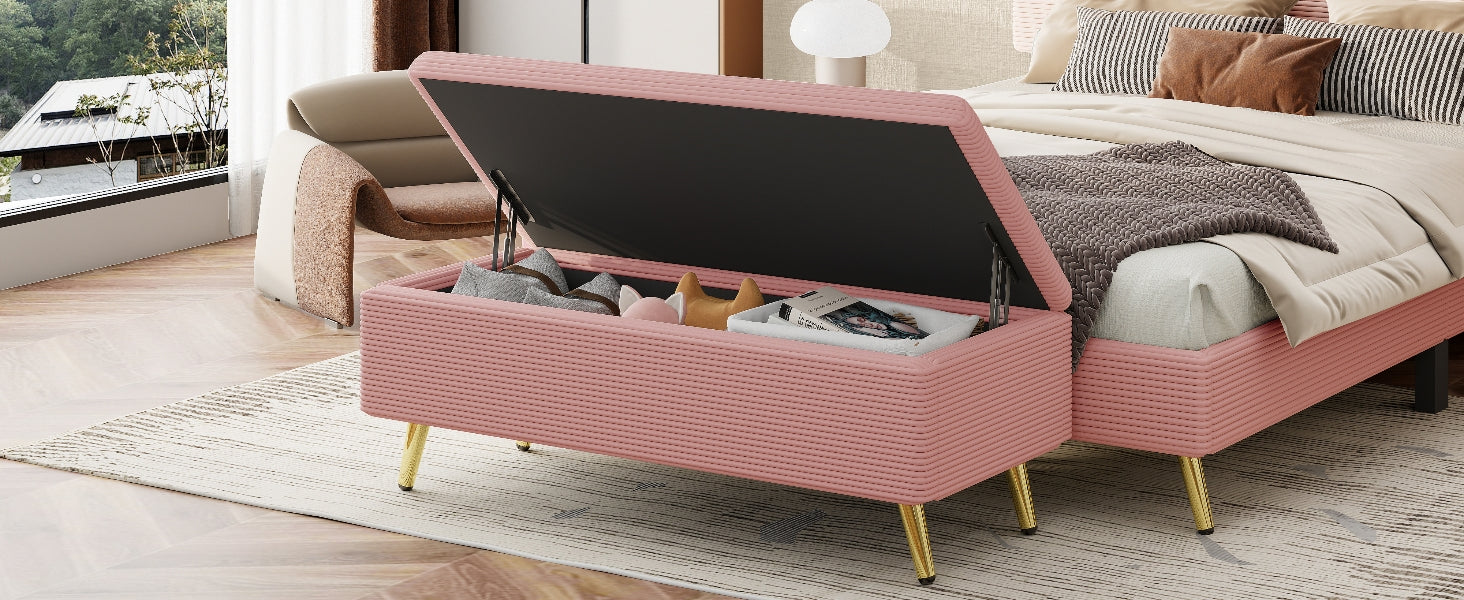 Modern Corduroy Upholstered Ottoman With Metal Legs, Storage Bench For Bedroom,Living Room,Pink Pink Polyester Solid Wood Mdf