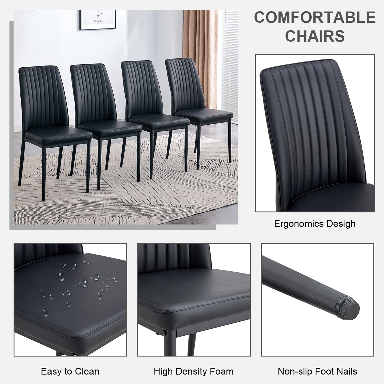 | Material | Tabletop: GlassChairtop: PU+plywood+foamTable Legs: Mdf Chair Legs: Metal |