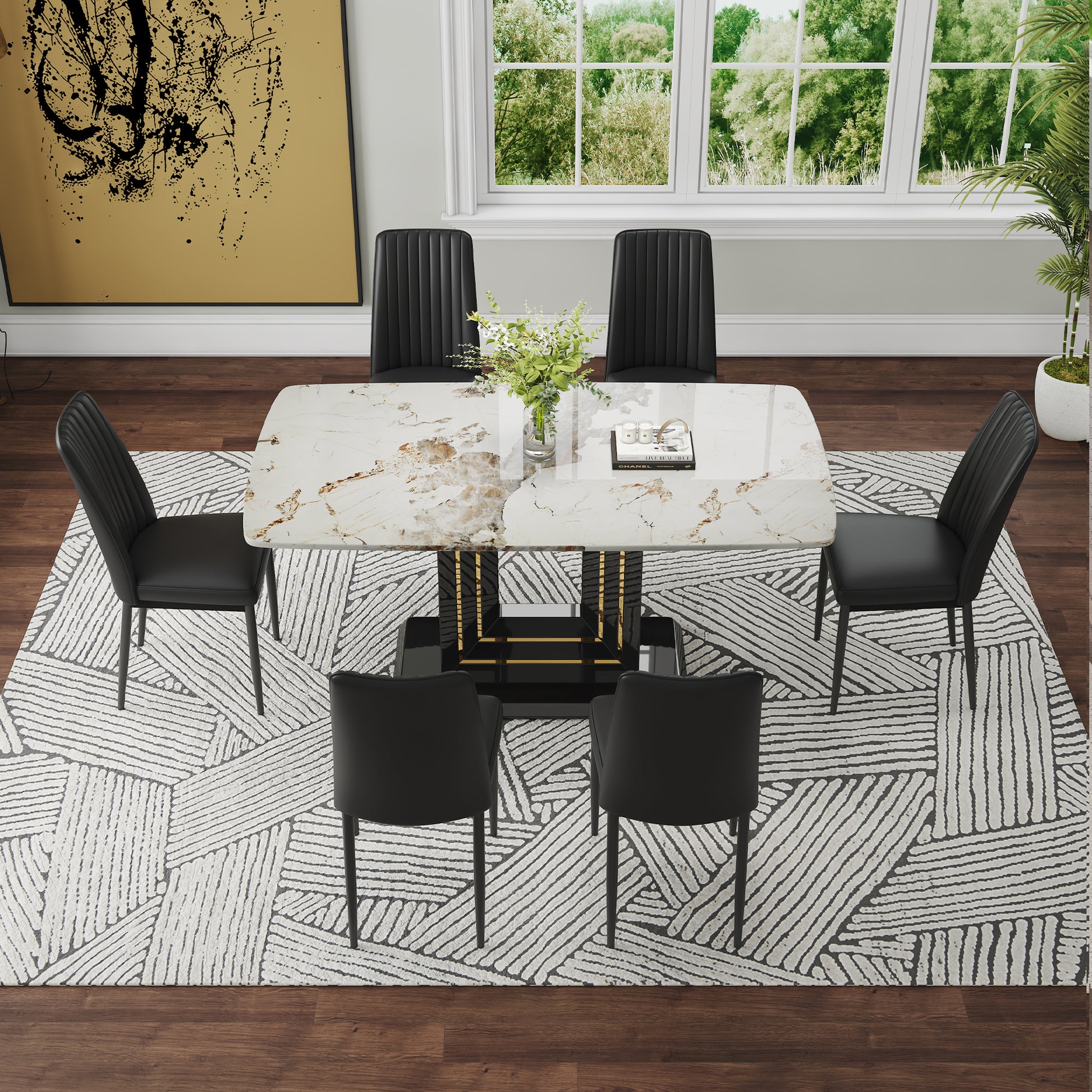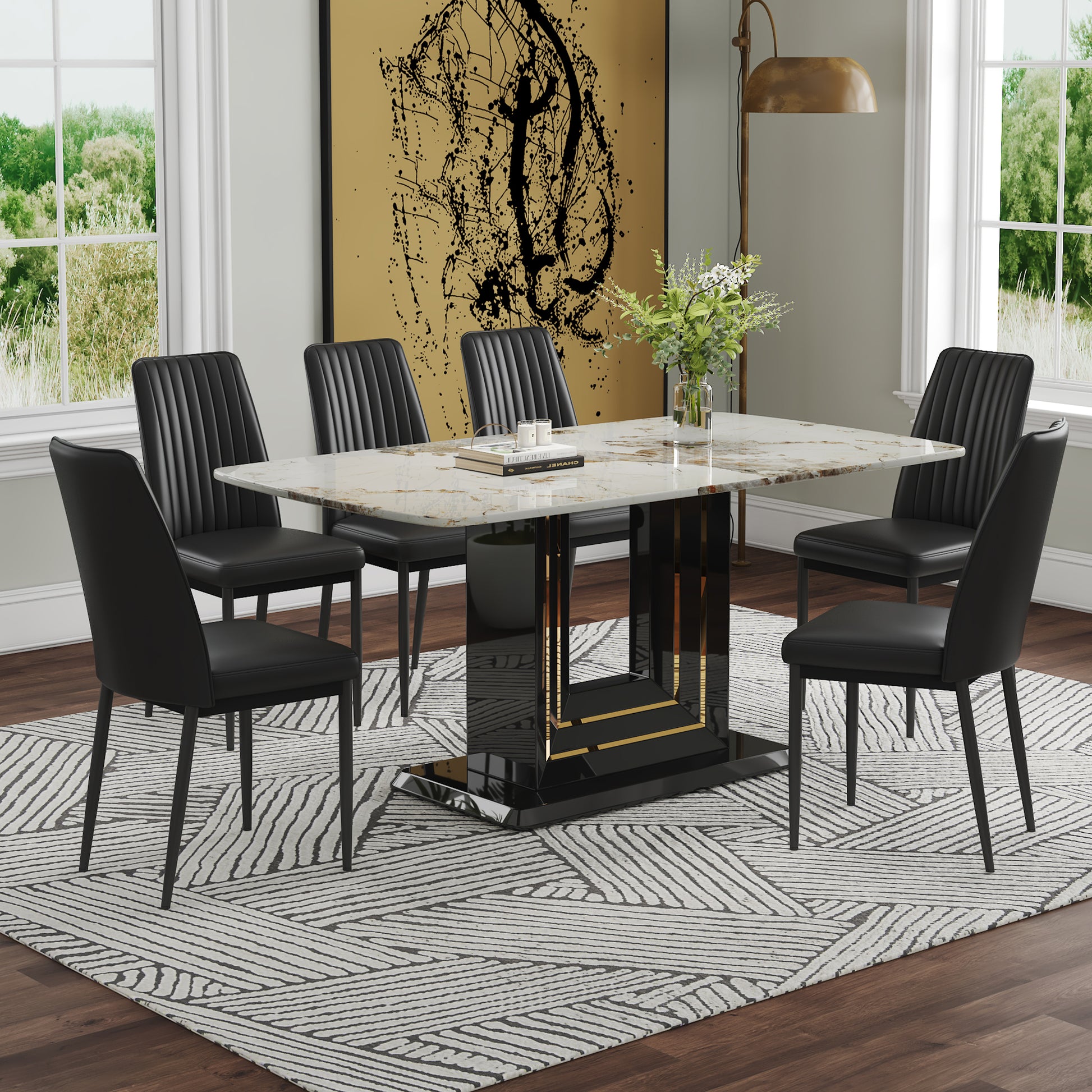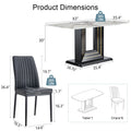 Modern Dining Table Set, 7 Piece Faux Marble Kitchen Table For 6 8, Glass Rectangular Dining Room Table With U Shaped Table Legs, Dining Table & 6 Chairs Metal Black Rectangular Mdf Glass
