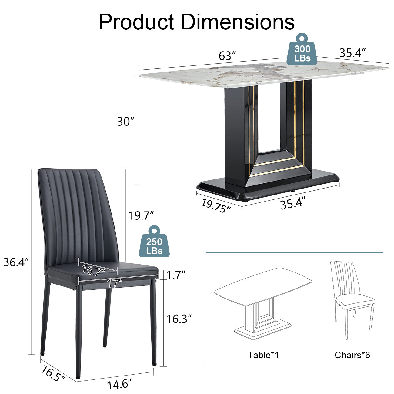 | Overall Product Dimension | Dining table: 63 x 35.4 x 30 inches, 175.99LBSDining Chair: 17.9 x 17.3 x 36.2 inches, 11.02LBS/piece |