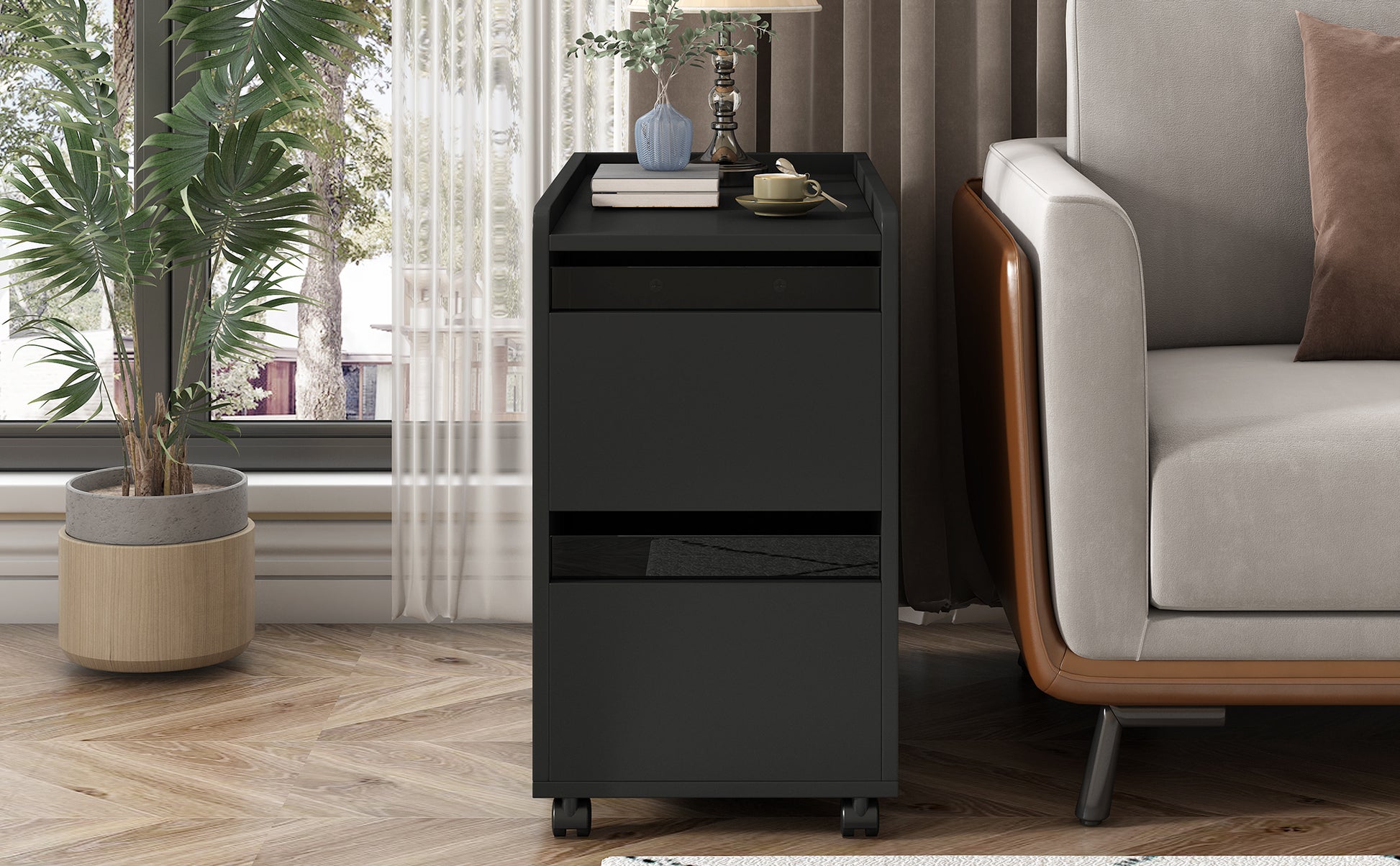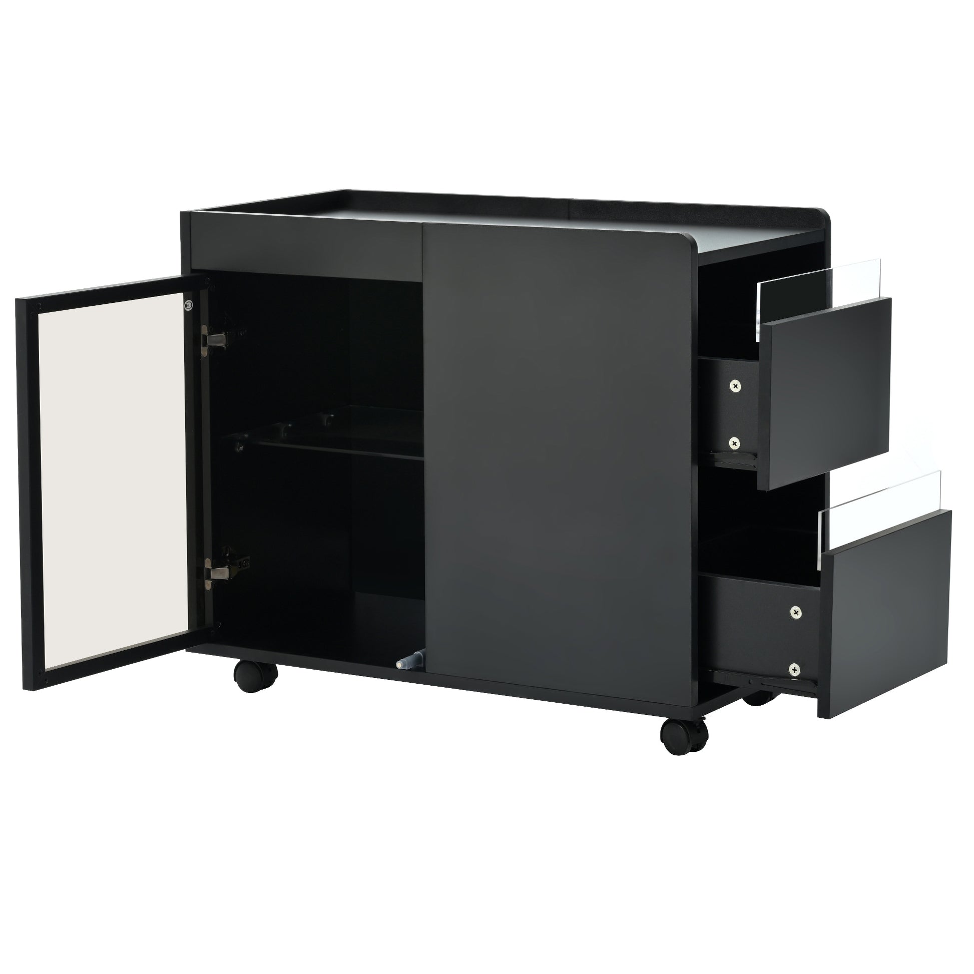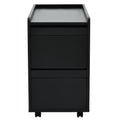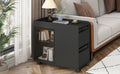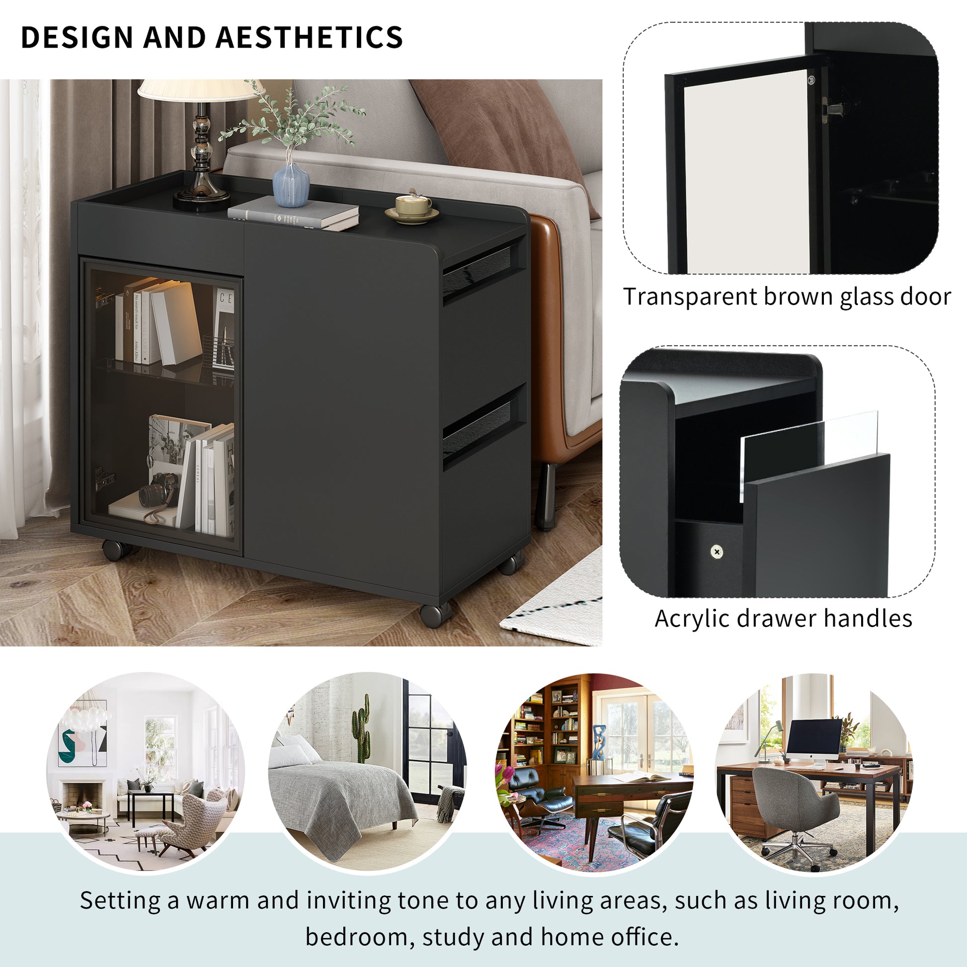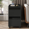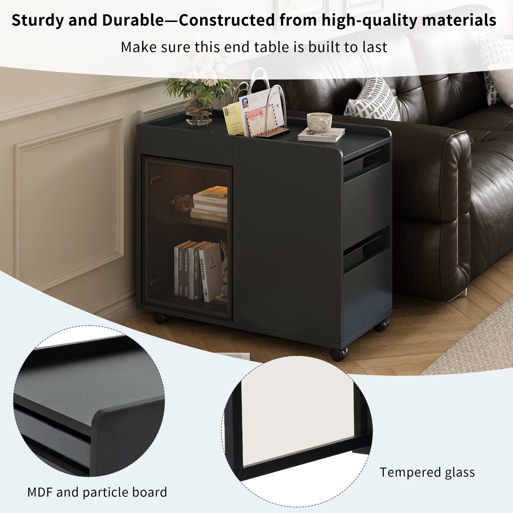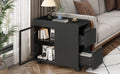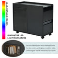 Modern End Table With Led Light And Wheels, Side Table With Transparent Brown Glass Door, 2 Storage Shelves And Drawers For Living Room, Black Black Mdf